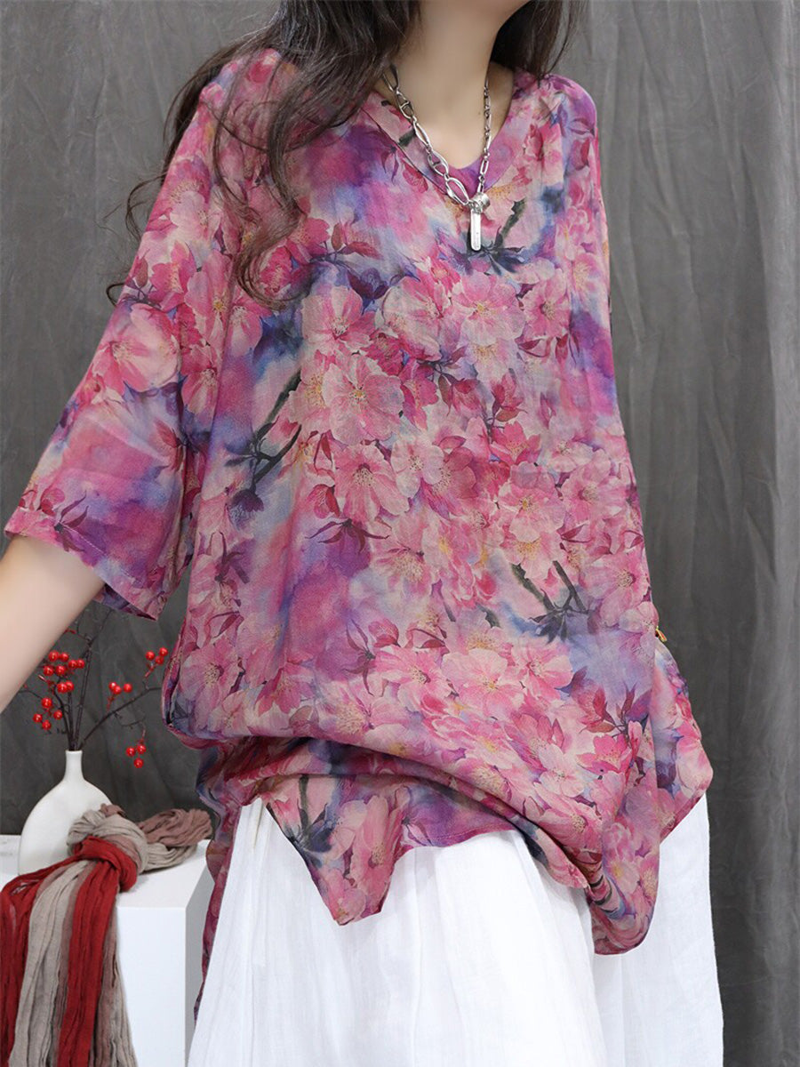 Blusa de mujer de verano con estampado floral artístico, 100% ramio y cuello en V.