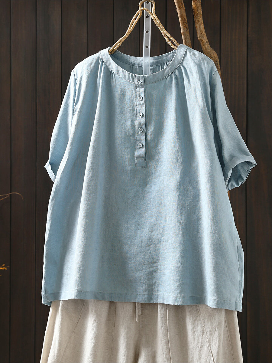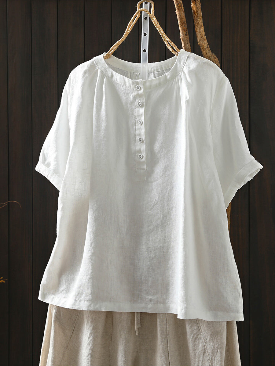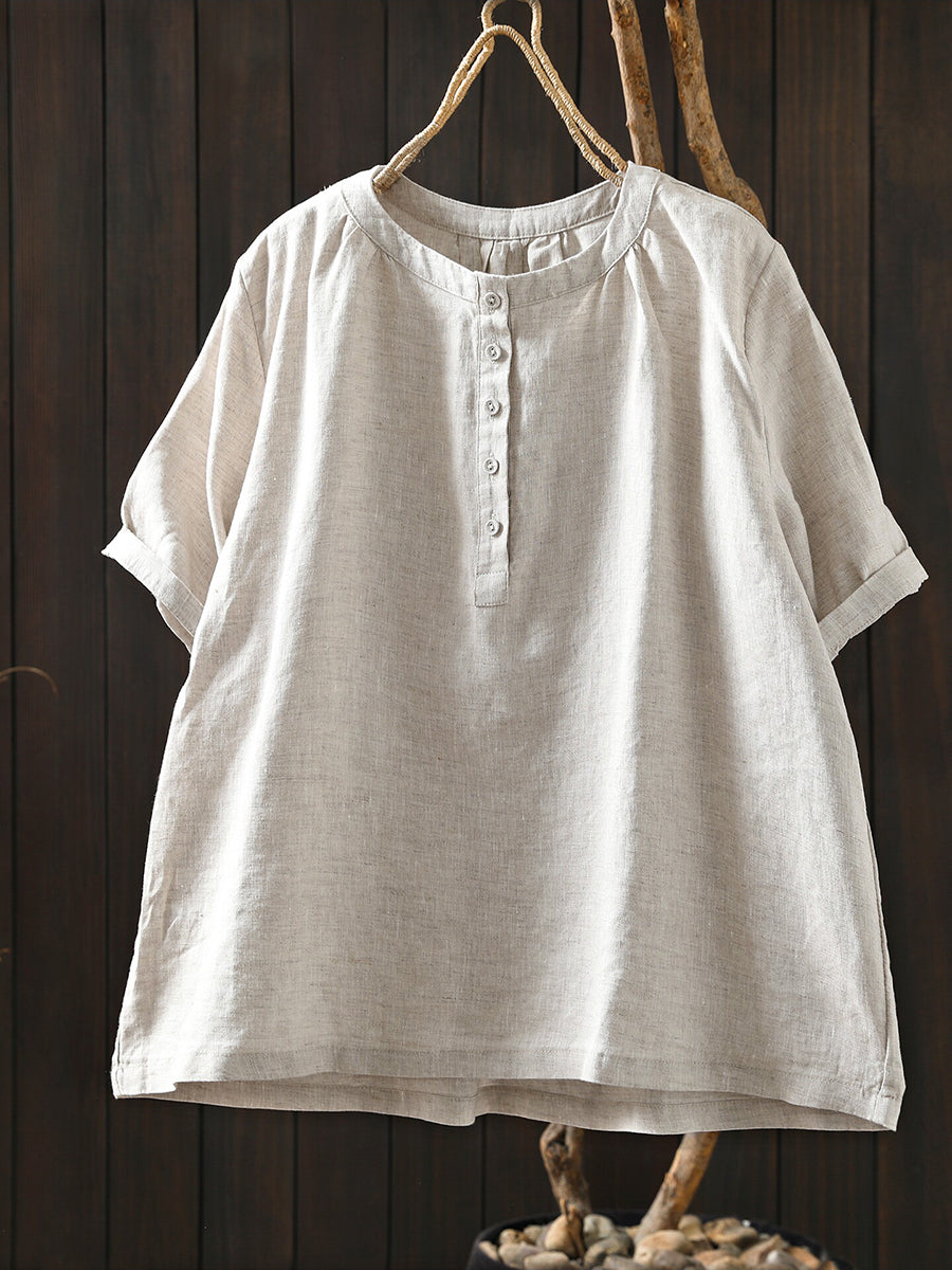 Camiseta de mujer de verano con cuello redondo y estilo artístico, 100% lino.