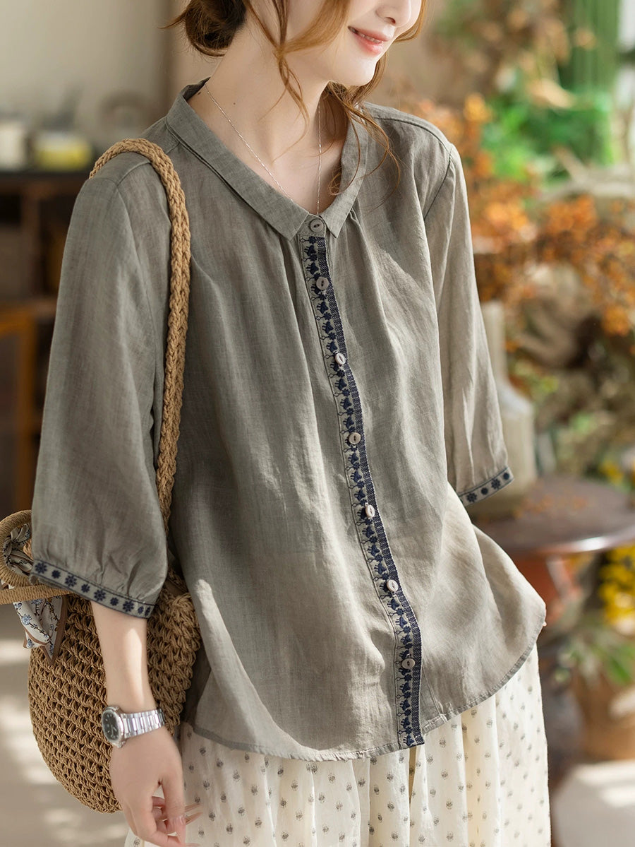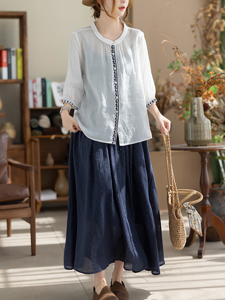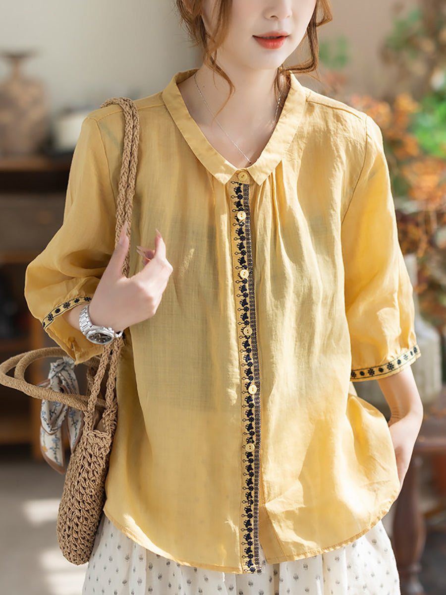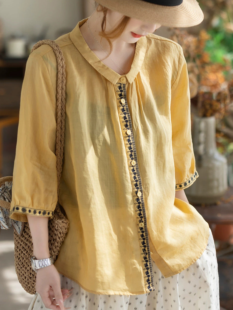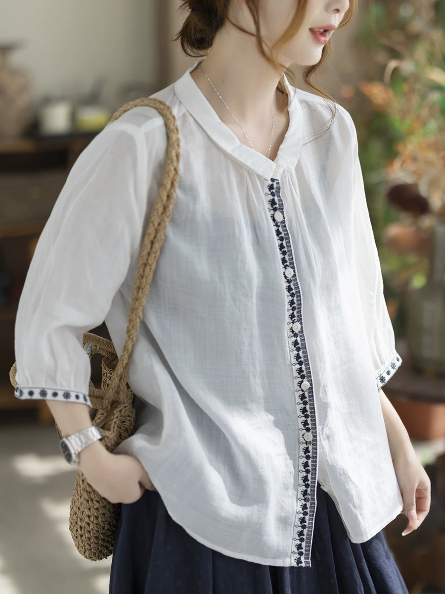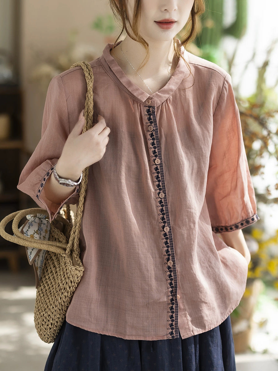 Camisa de verano vintage para mujer con cuello alto bordado, 100% ramio.