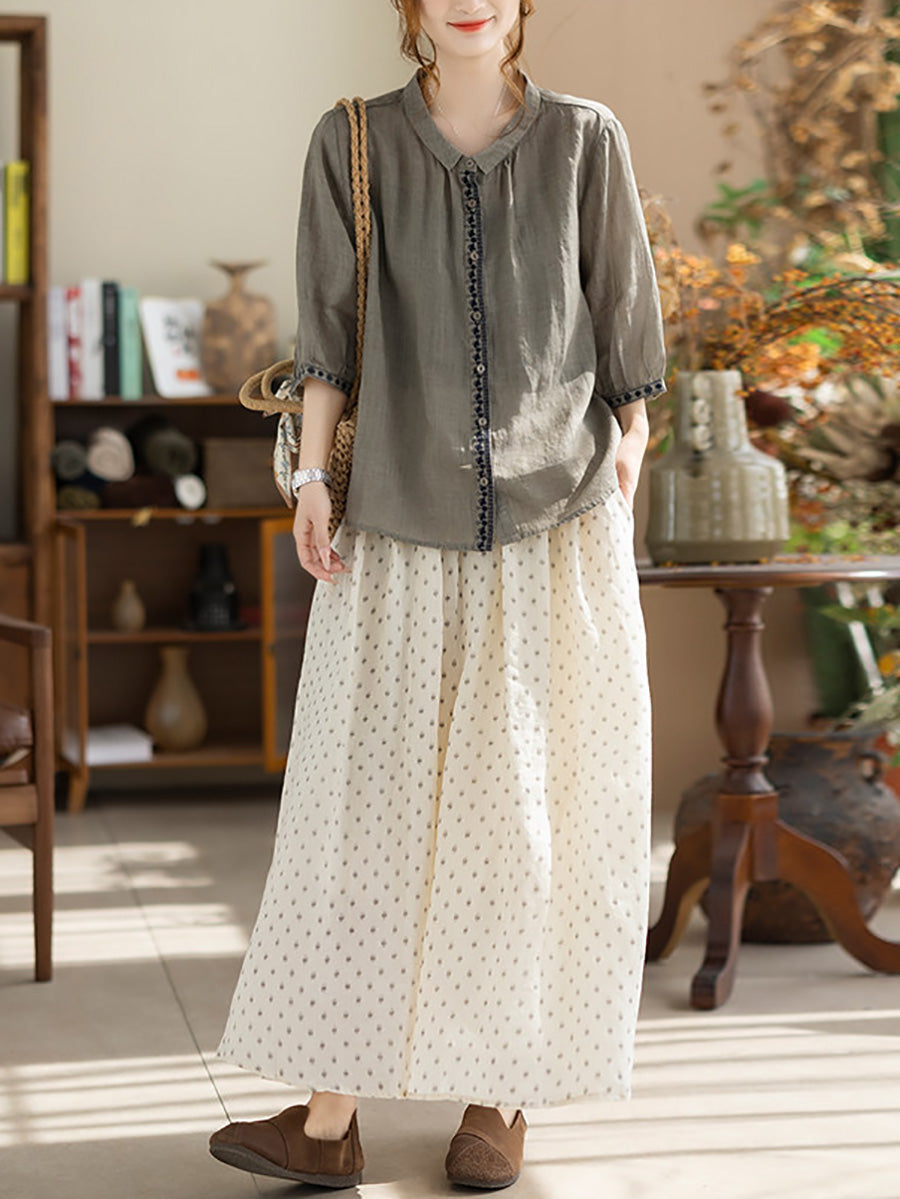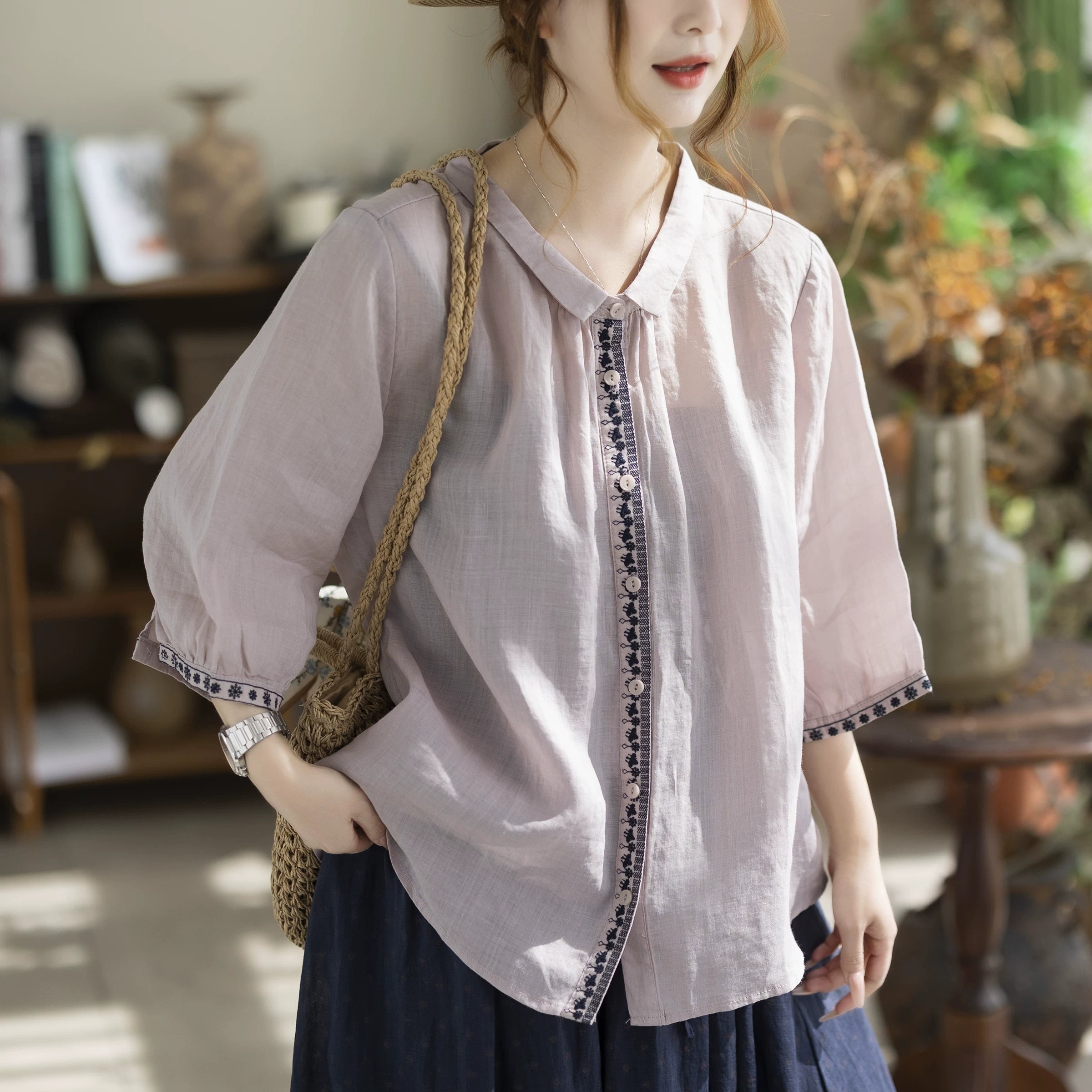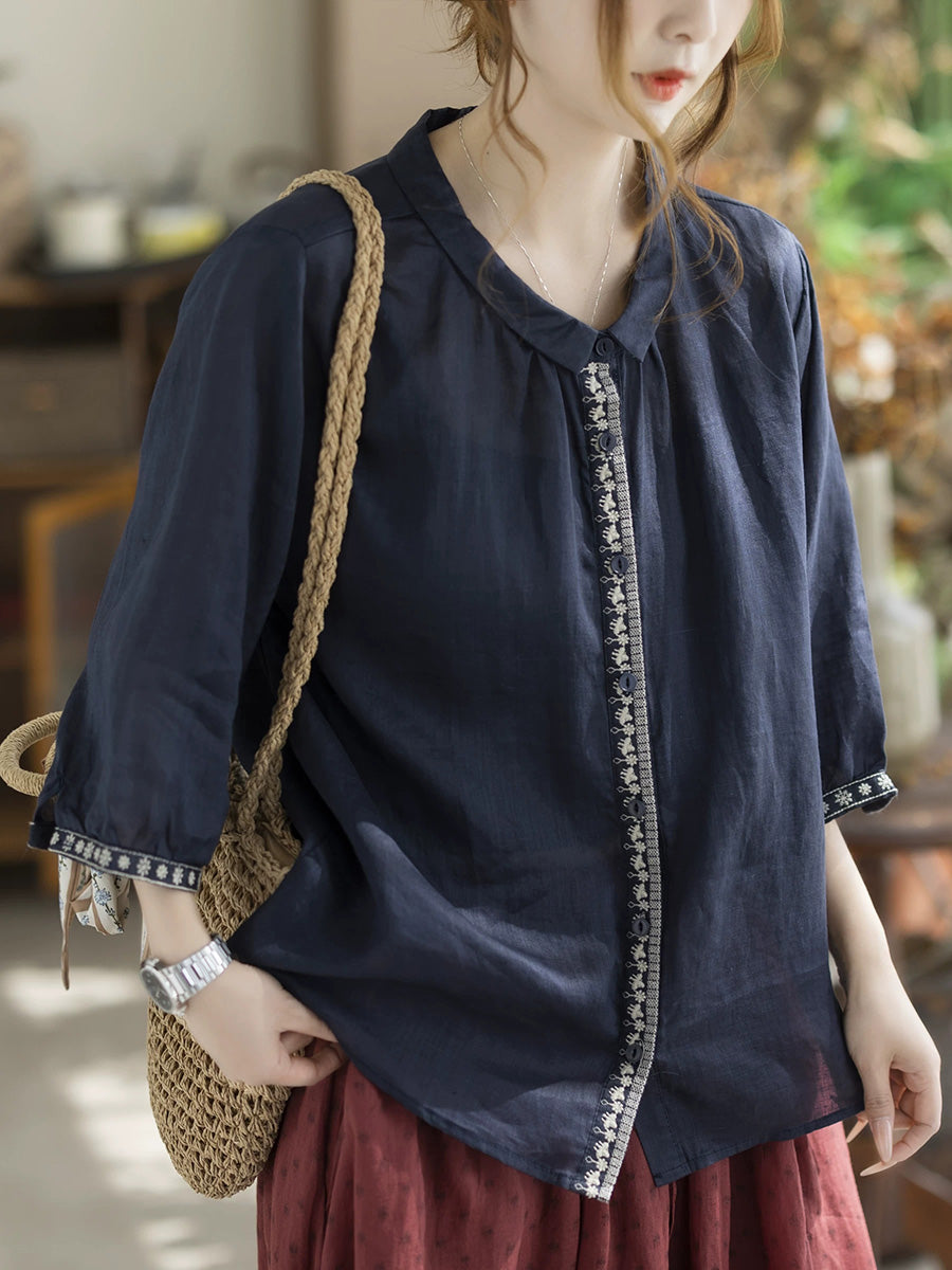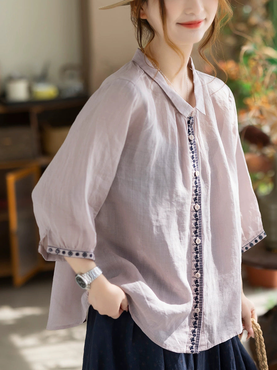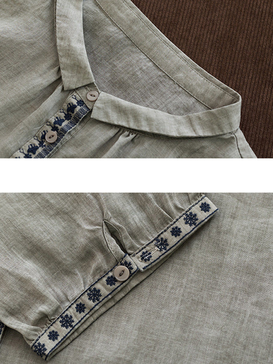 Camisa de verano vintage para mujer con cuello alto bordado, 100% ramio.