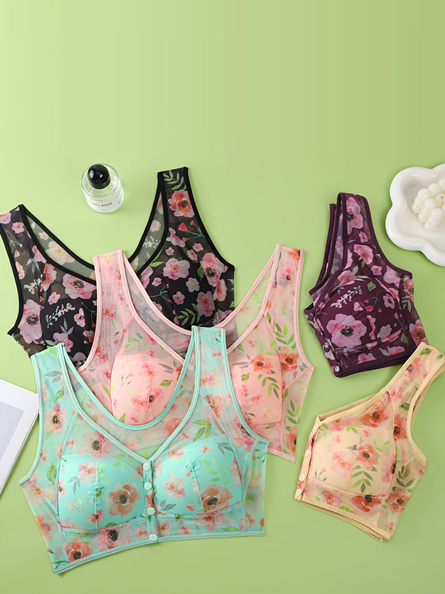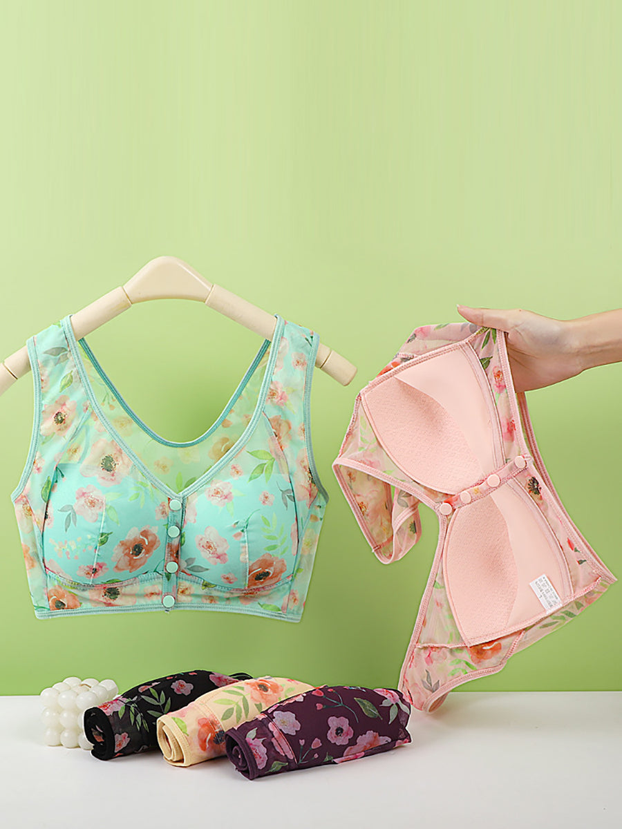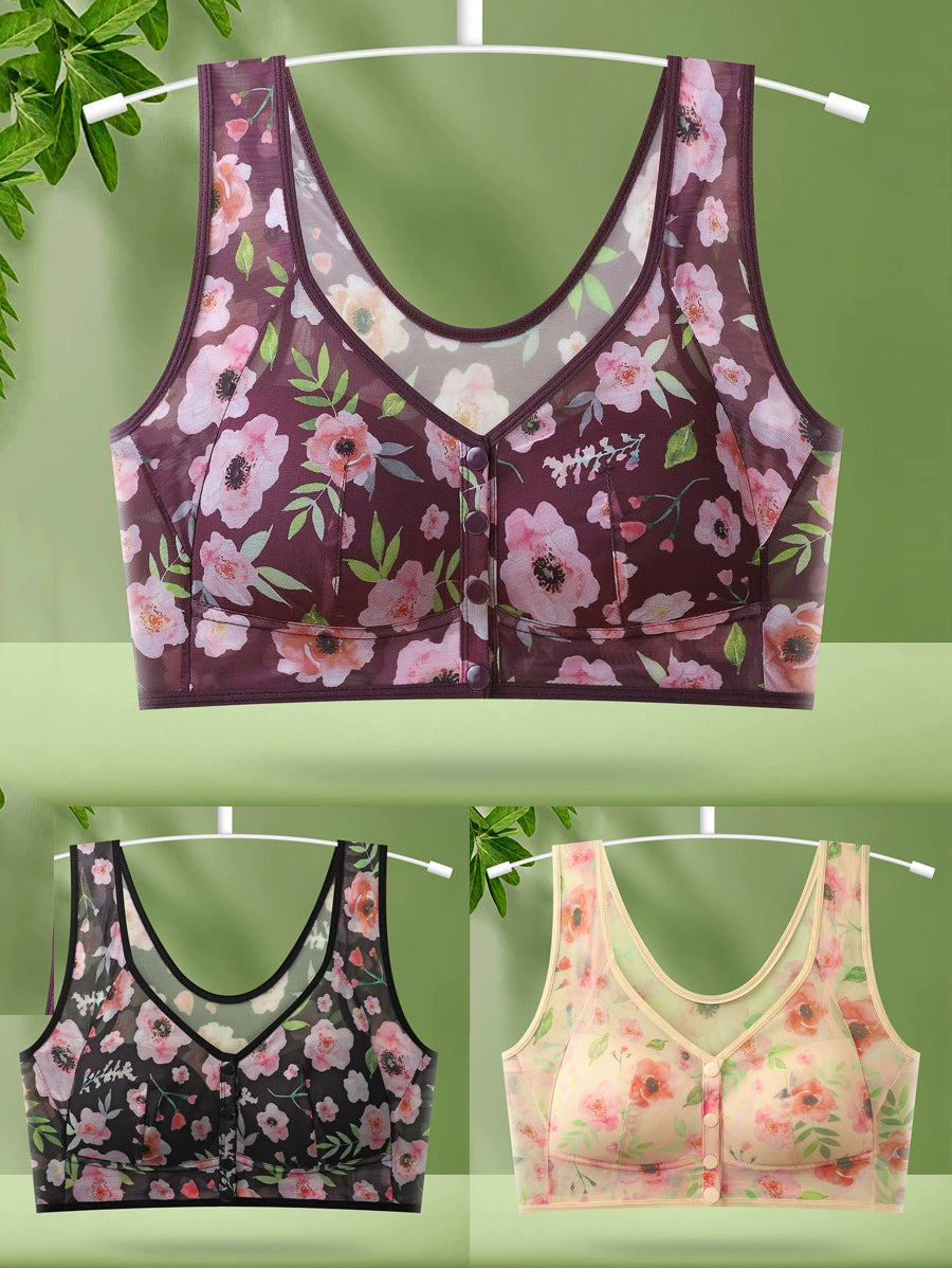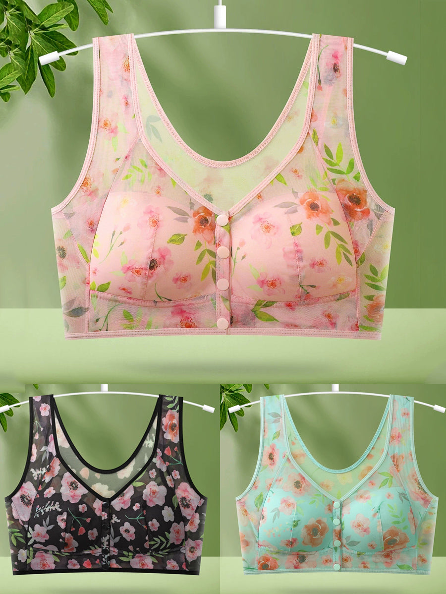 Sujetador sin aros con hebilla delantera y diseño floral artístico para mujer, 3 piezas