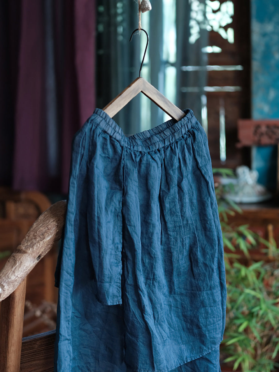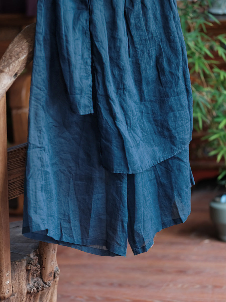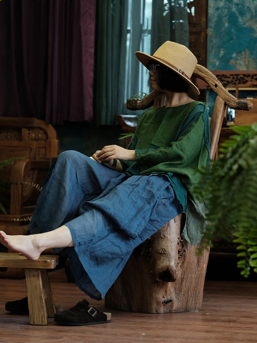Pantalones anchos de pierna de ramio con empalmes sólidos vintage de verano para mujer