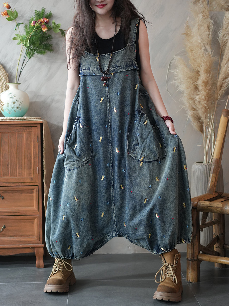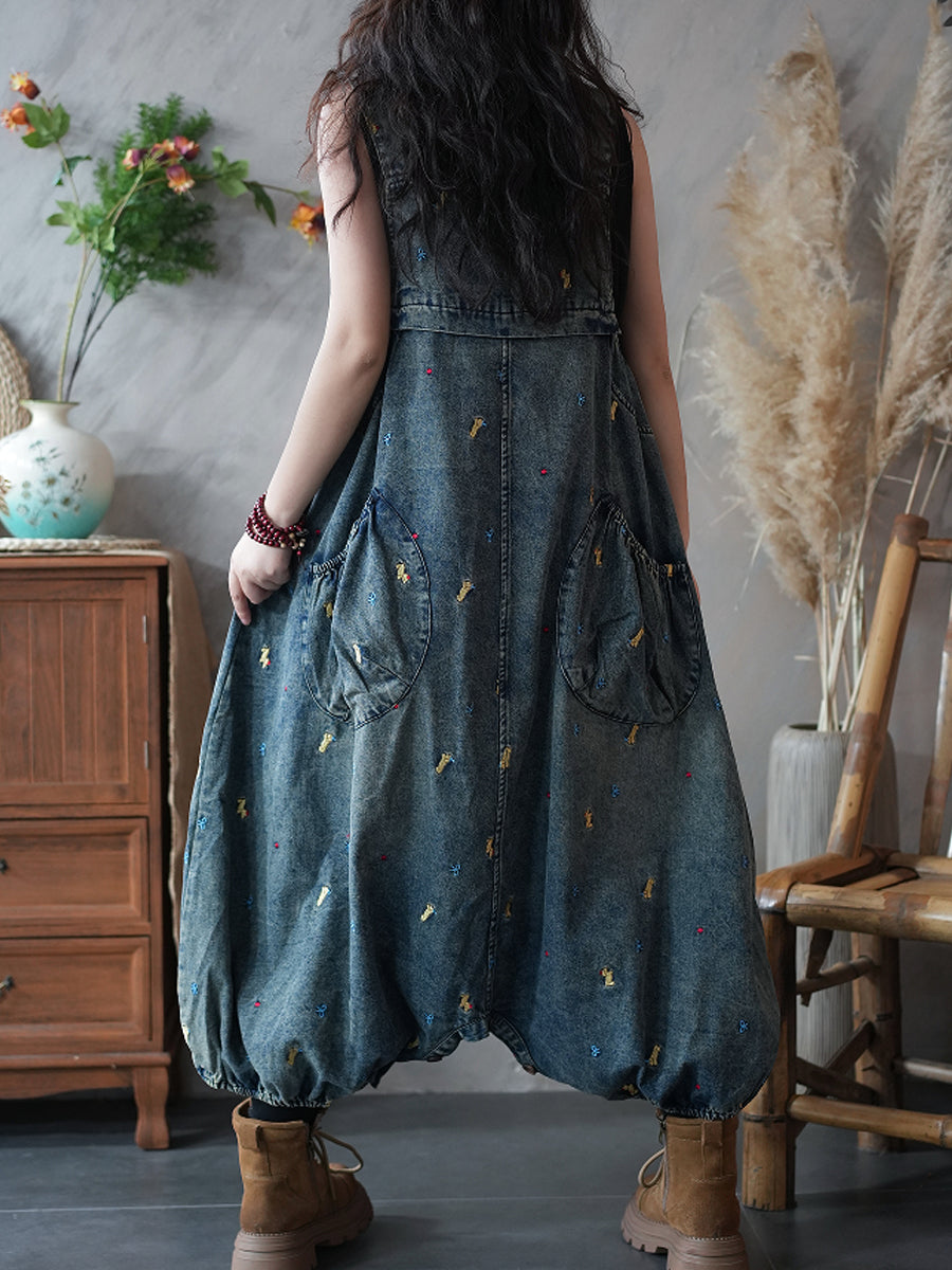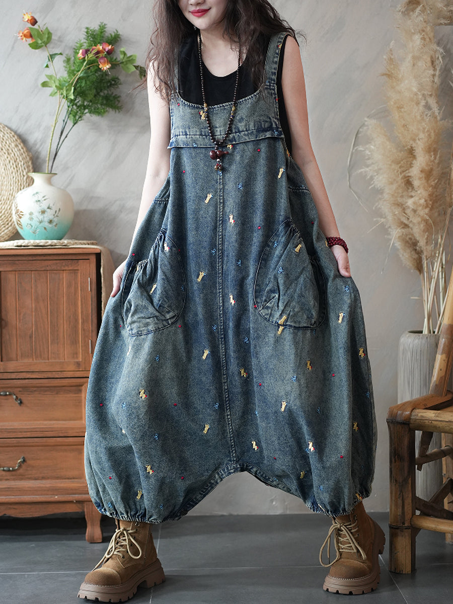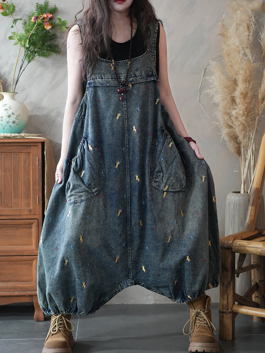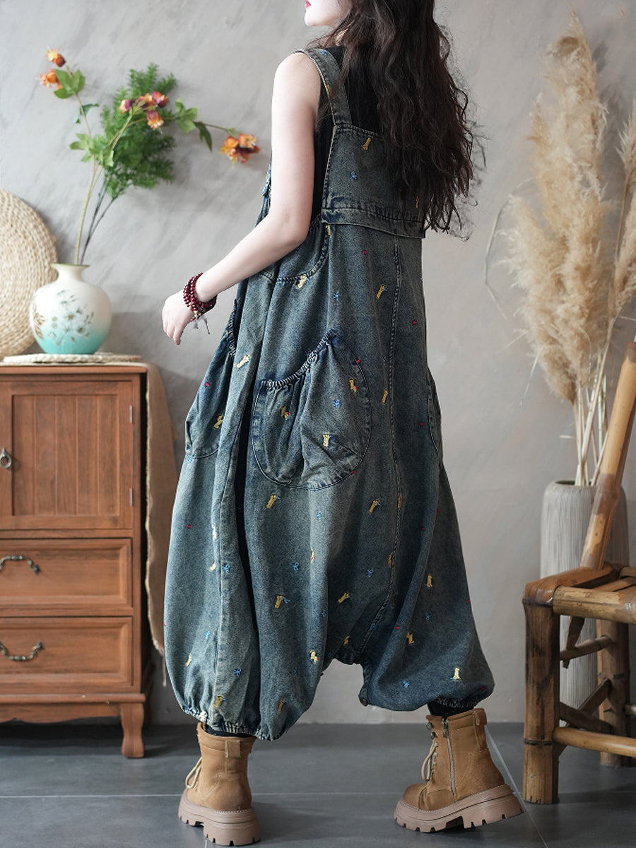 Mono informal de mezclilla con bordados y tiro bajo para mujer.
