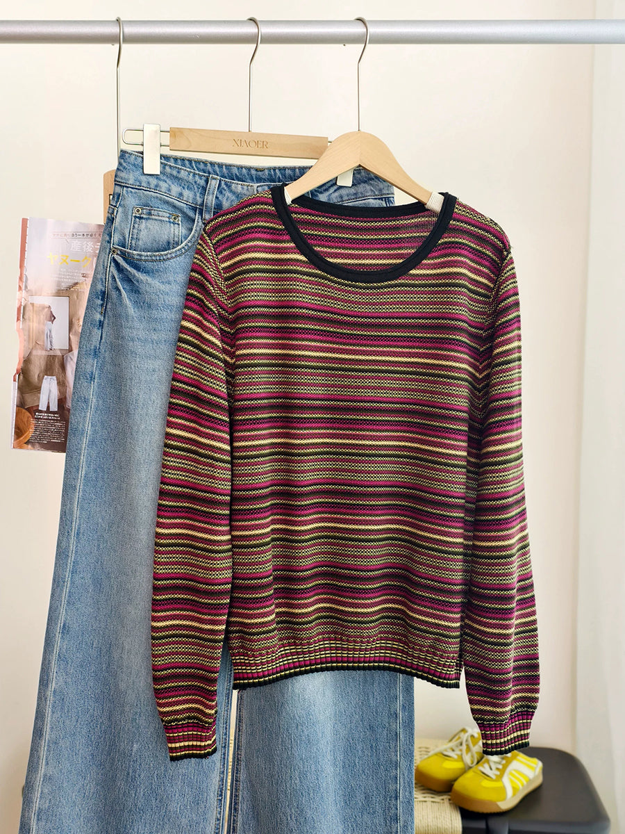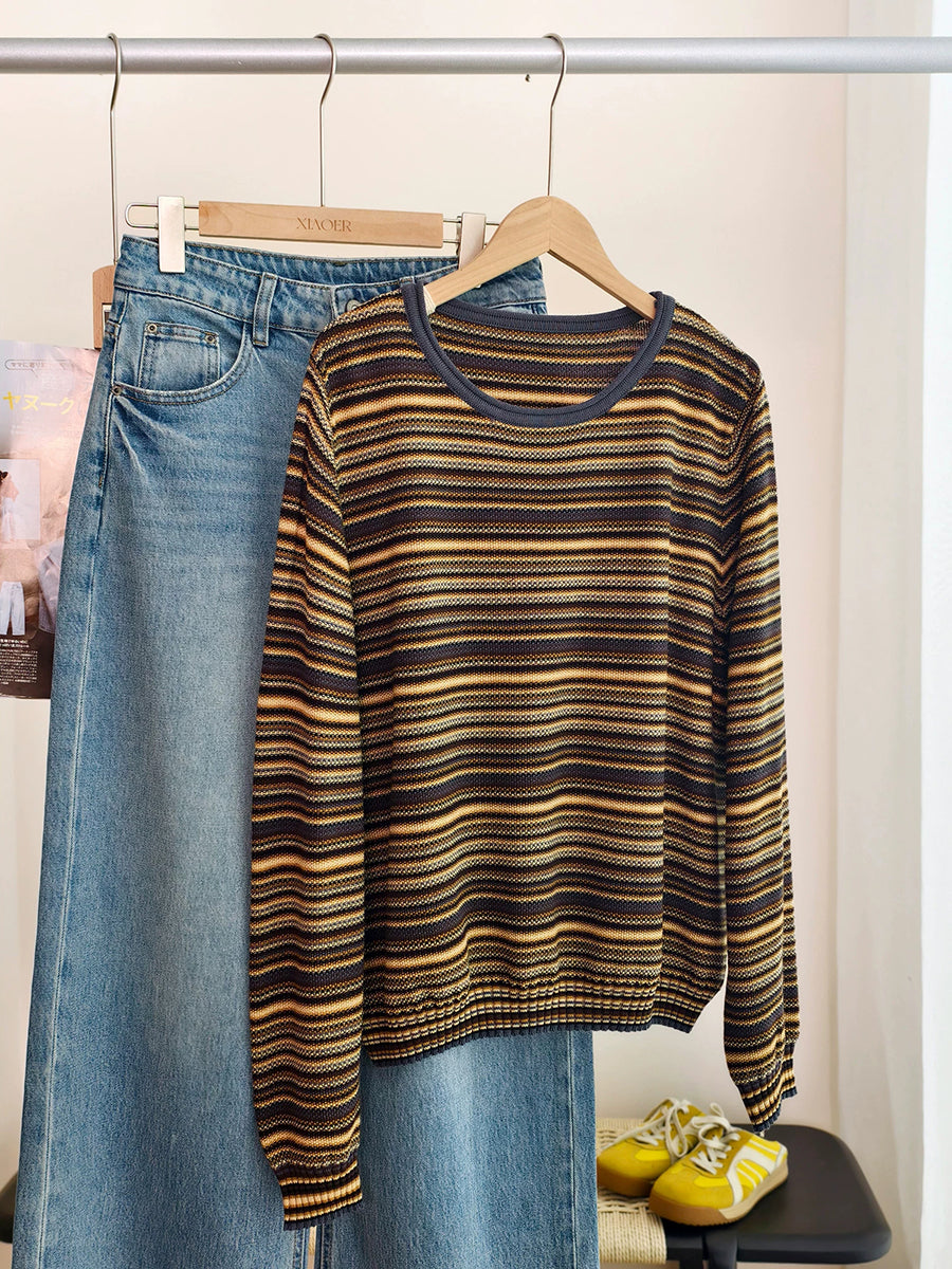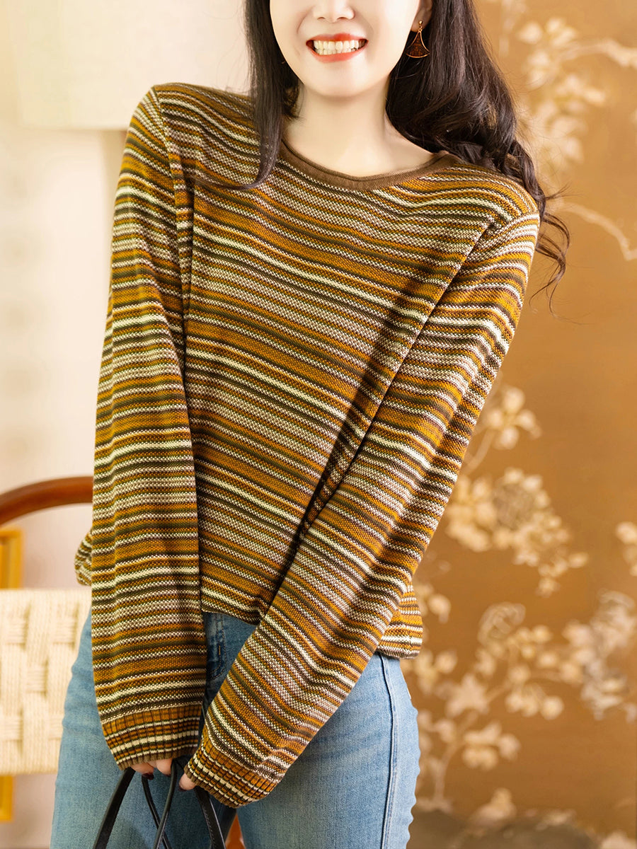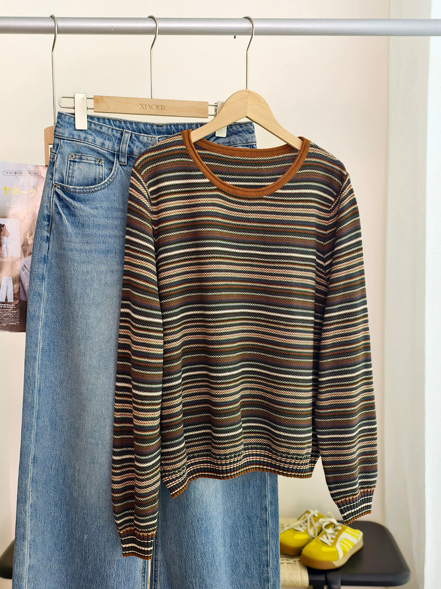Blusa informal de algodón con cuello redondo y rayas para mujer, primavera