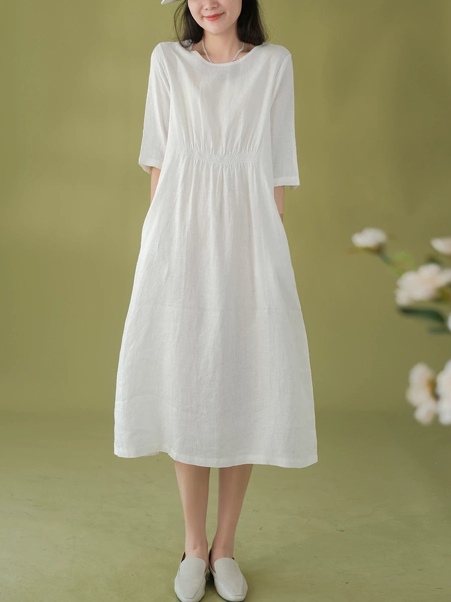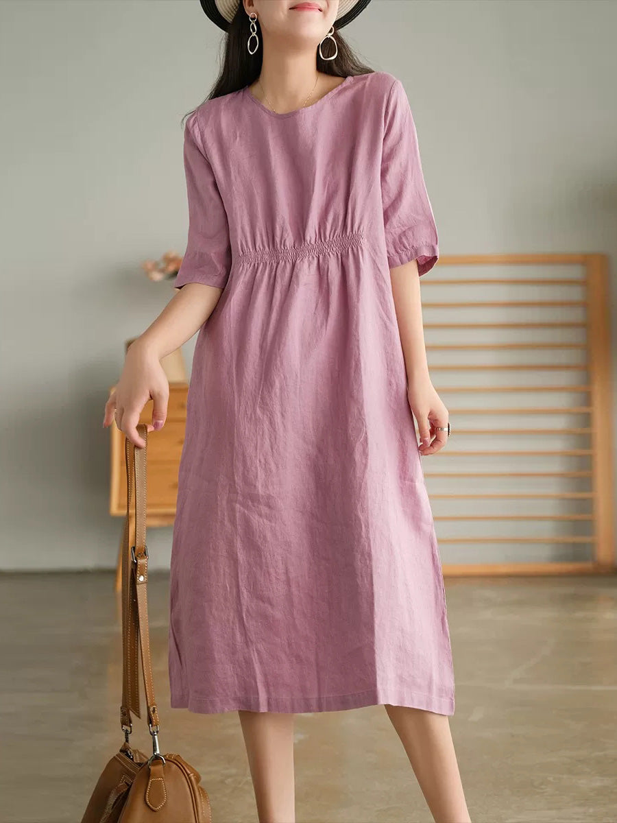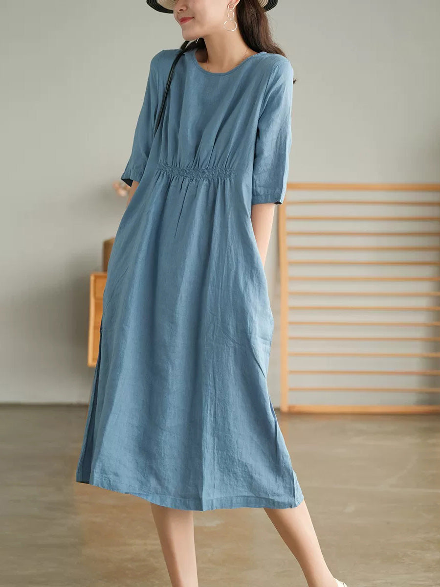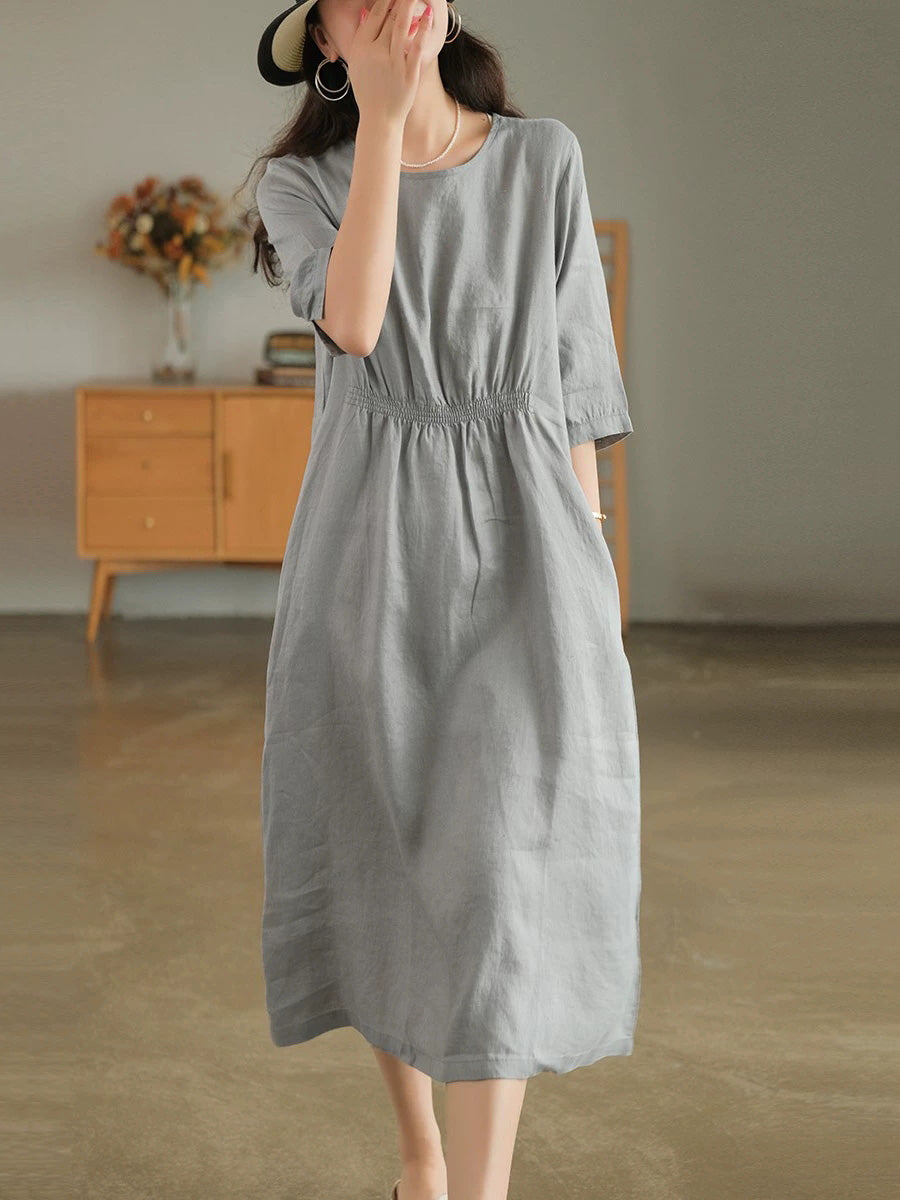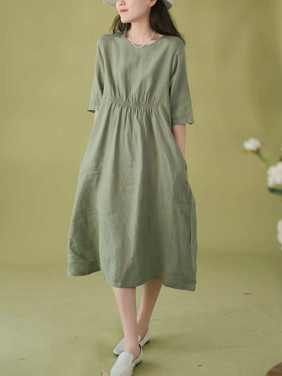 Vestido de verano artístico de color liso 100% lino con cuello redondo para mujer