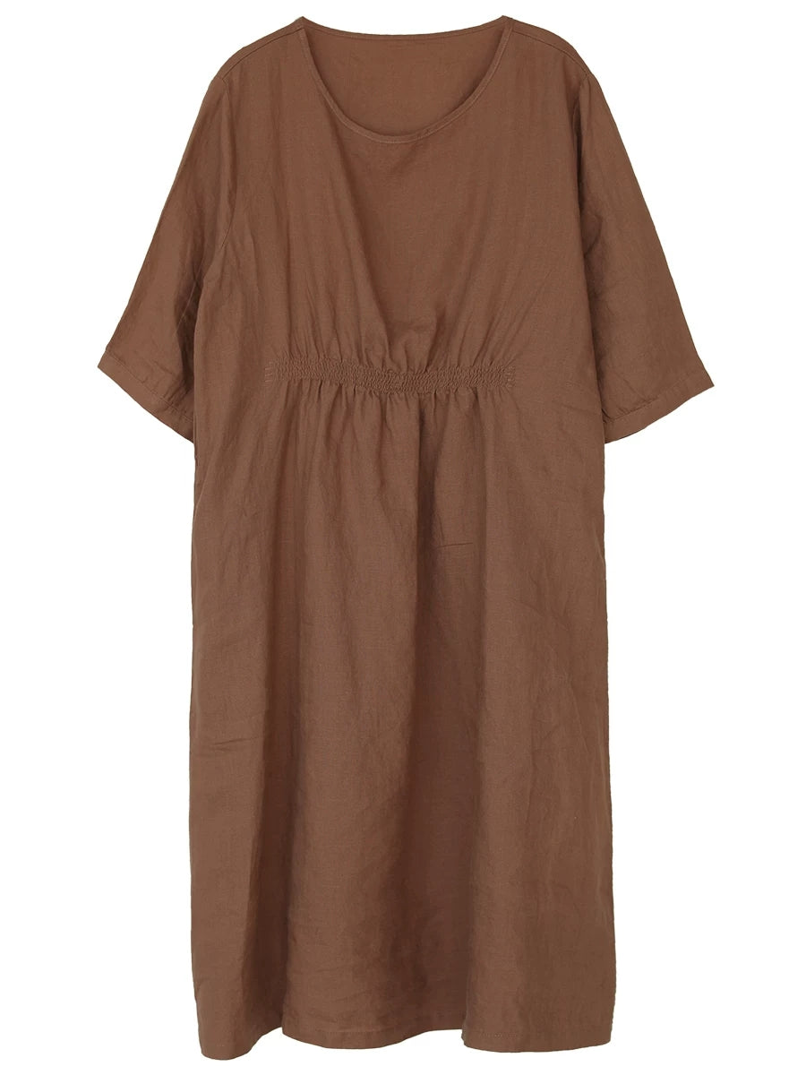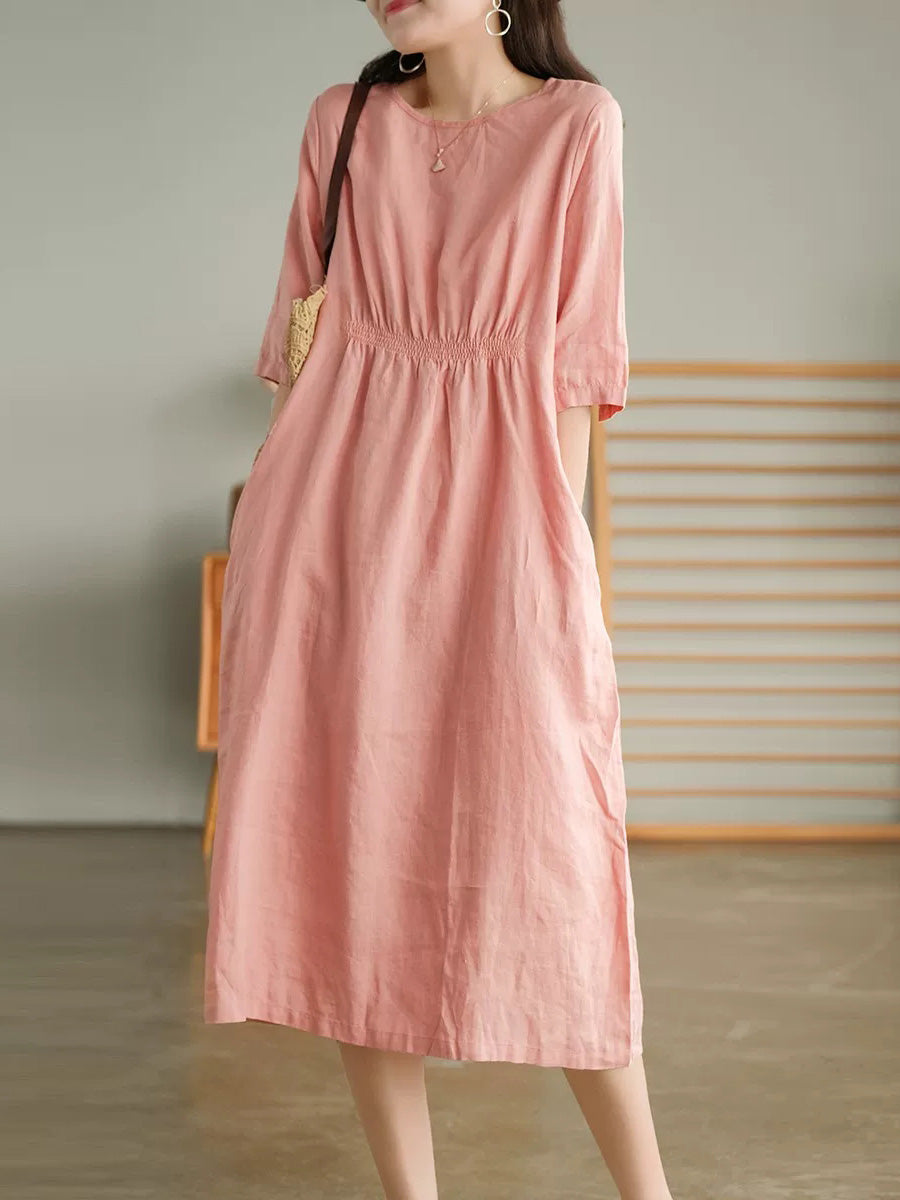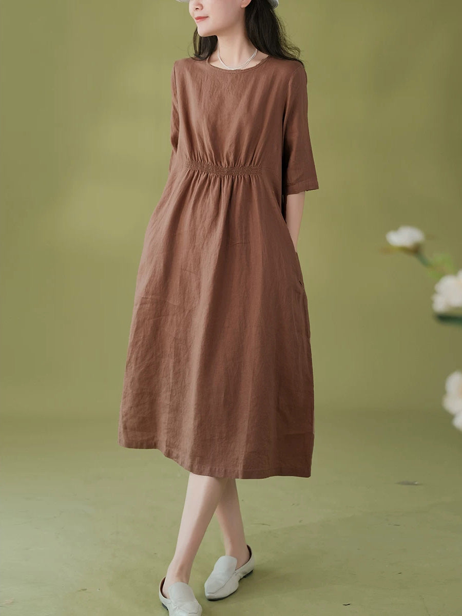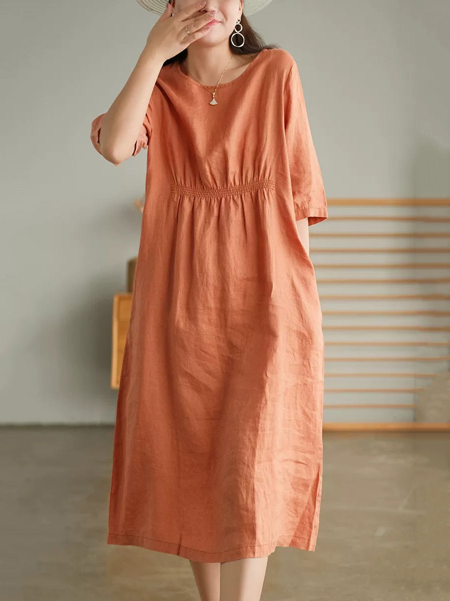 Vestido de verano artístico de color liso 100% lino con cuello redondo para mujer