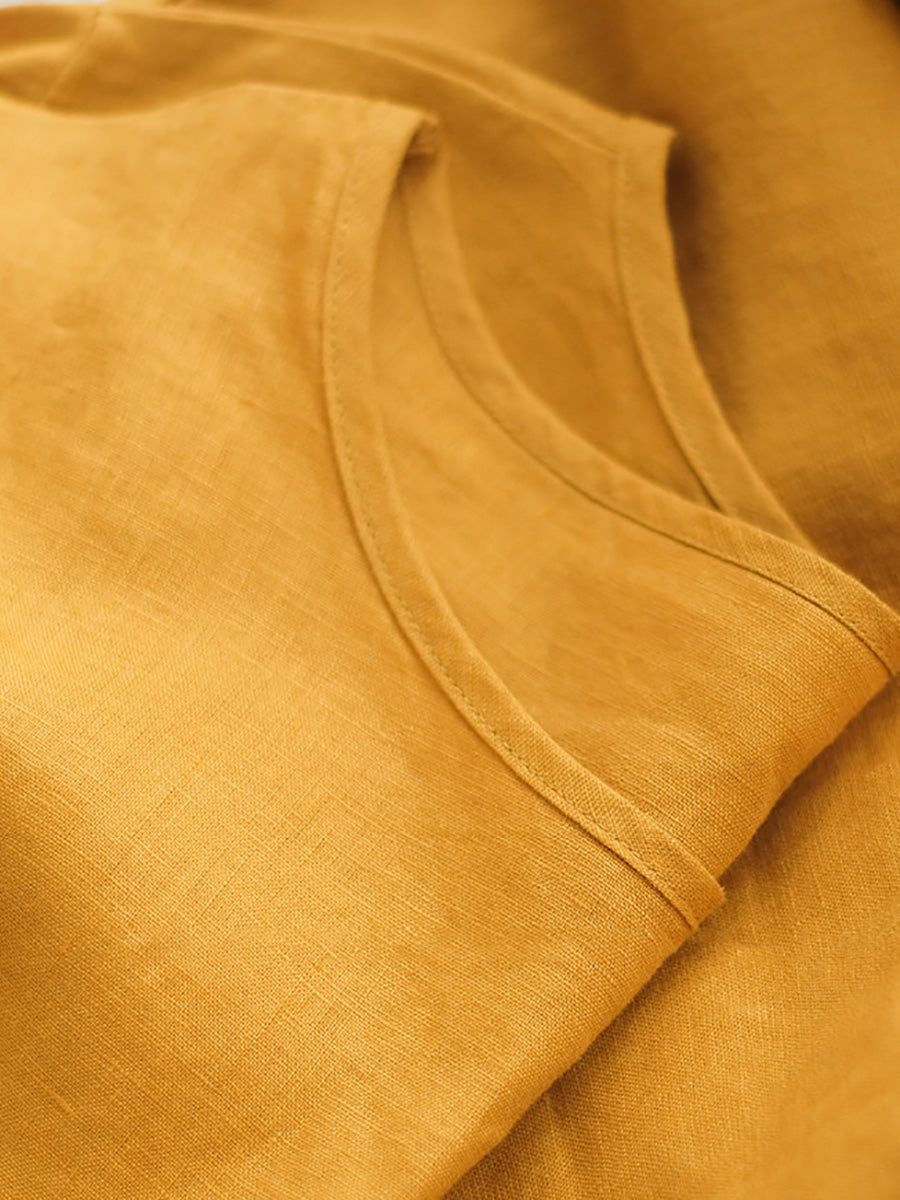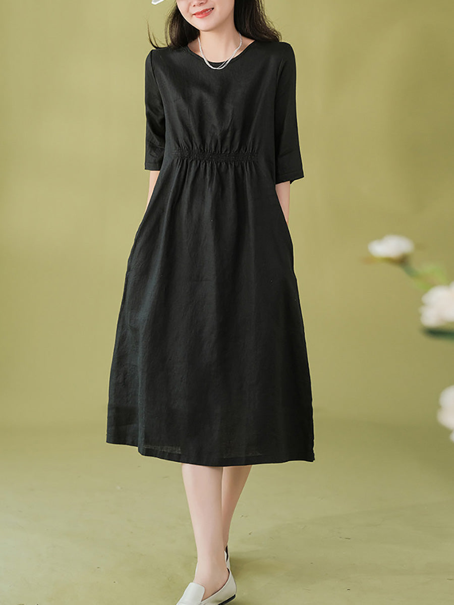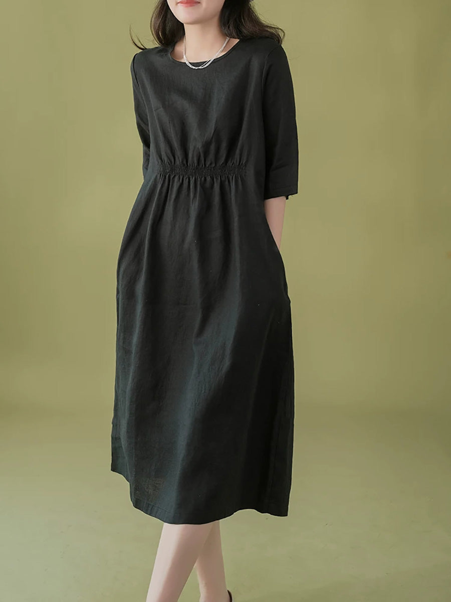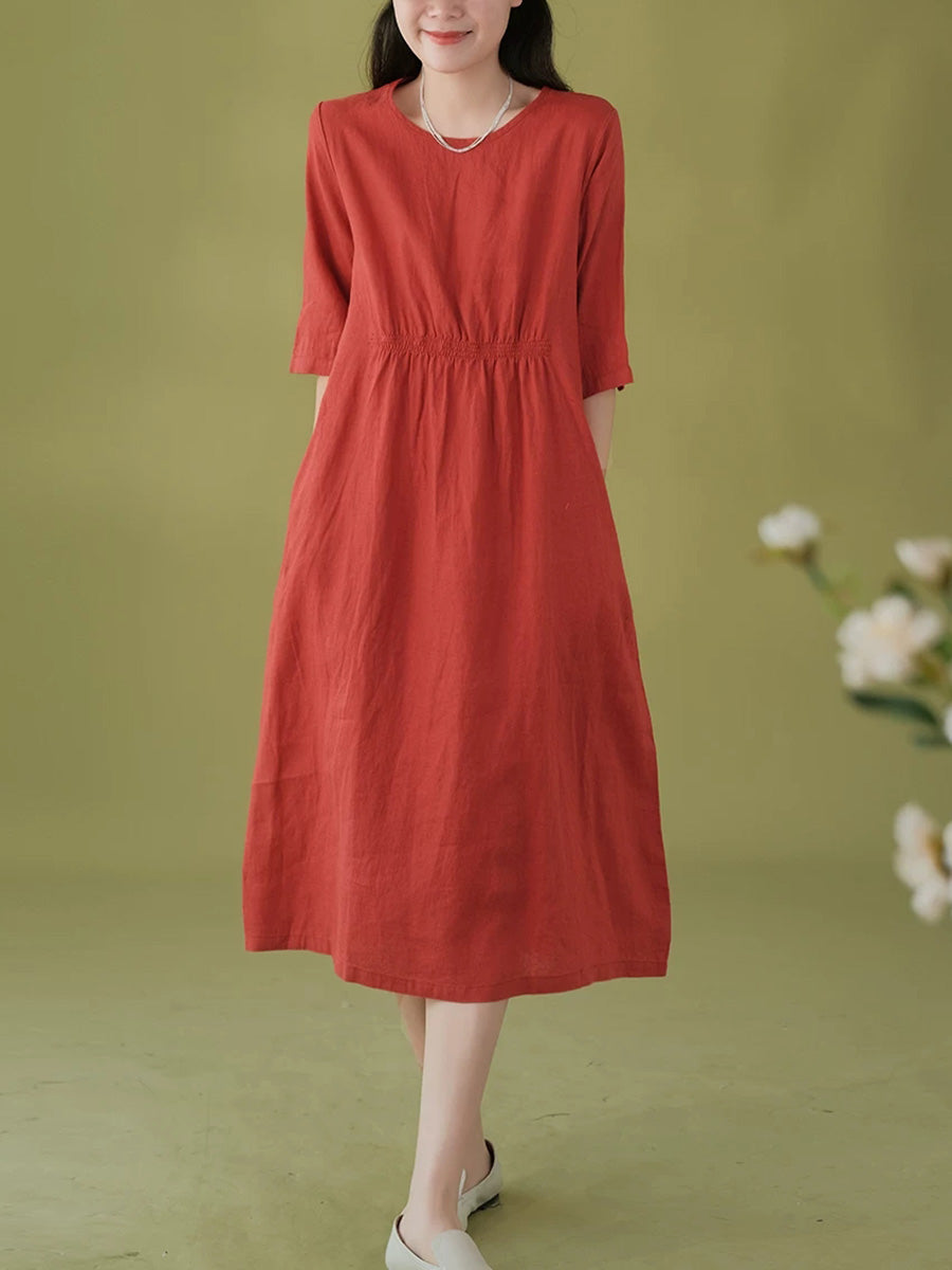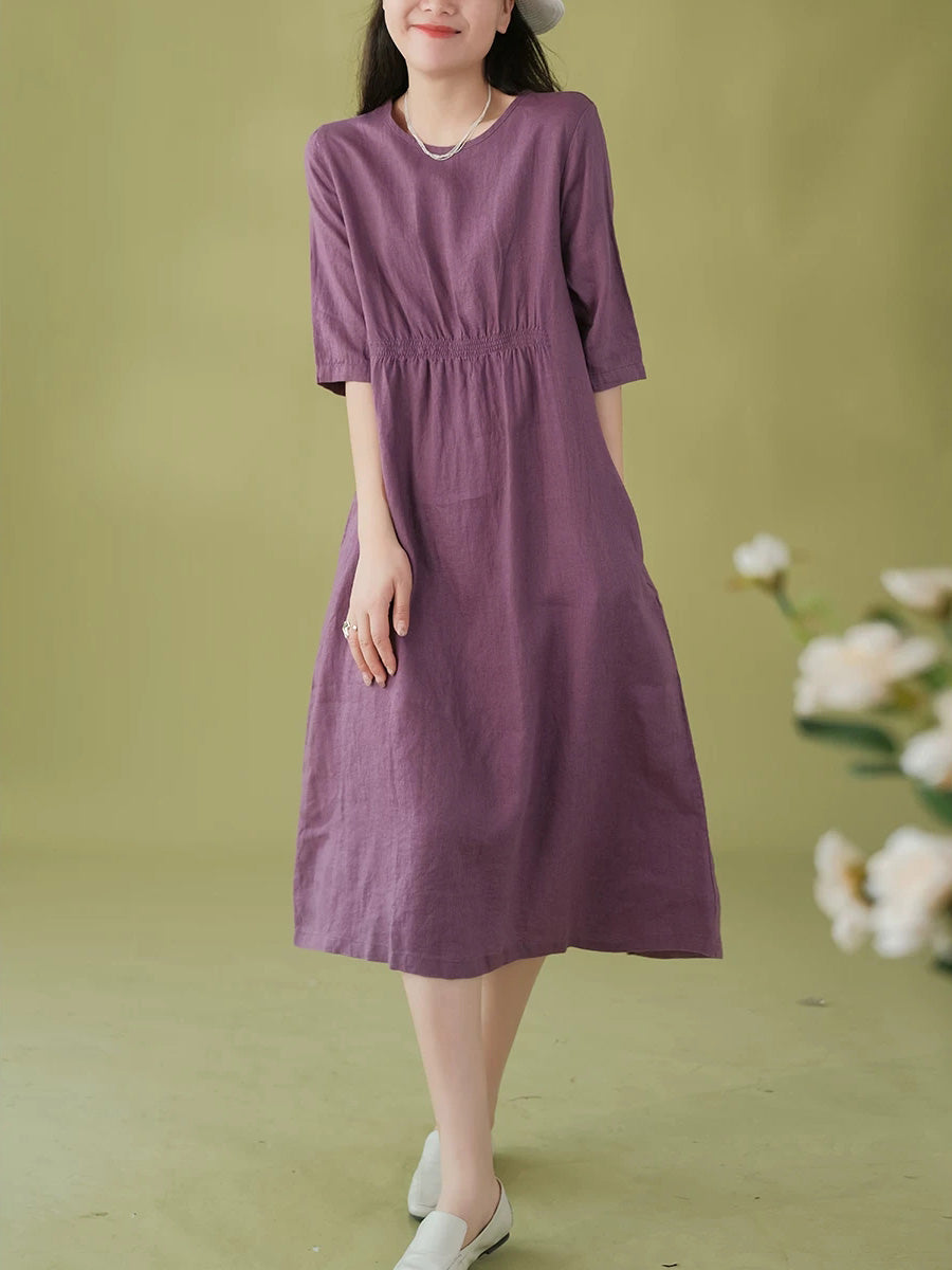 Vestido de verano artístico de color liso 100% lino con cuello redondo para mujer