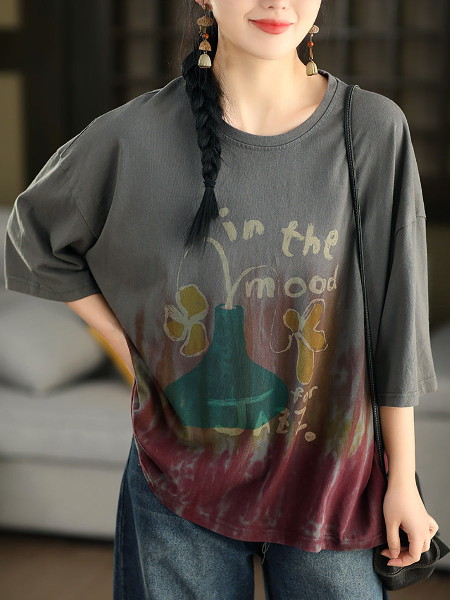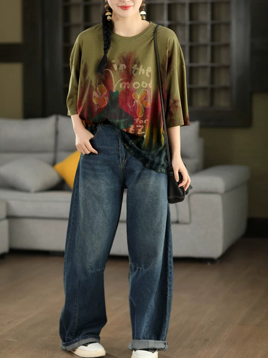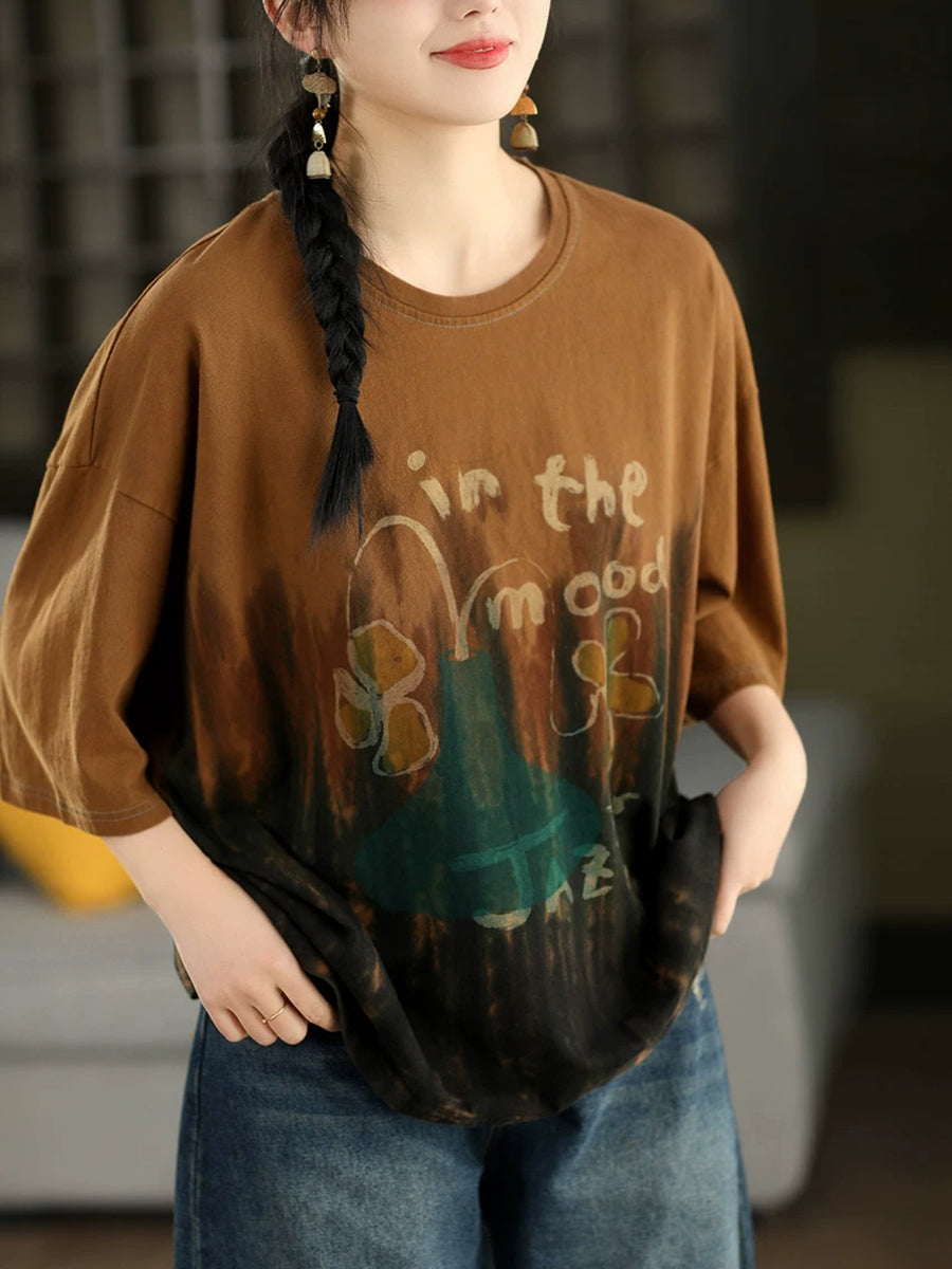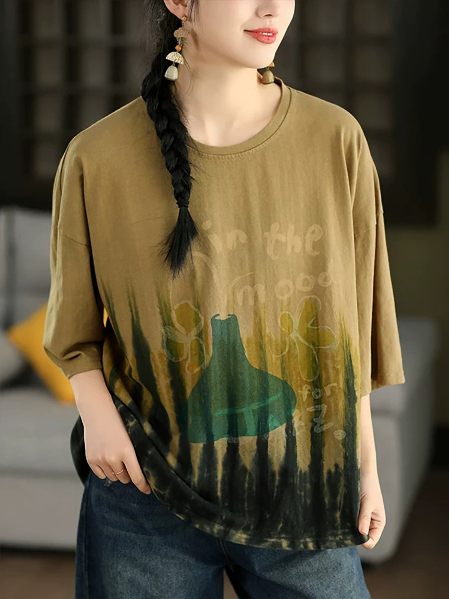 Camisa de verano para mujer con estampado tie-dye artístico y cuello redondo, 100% algodón.