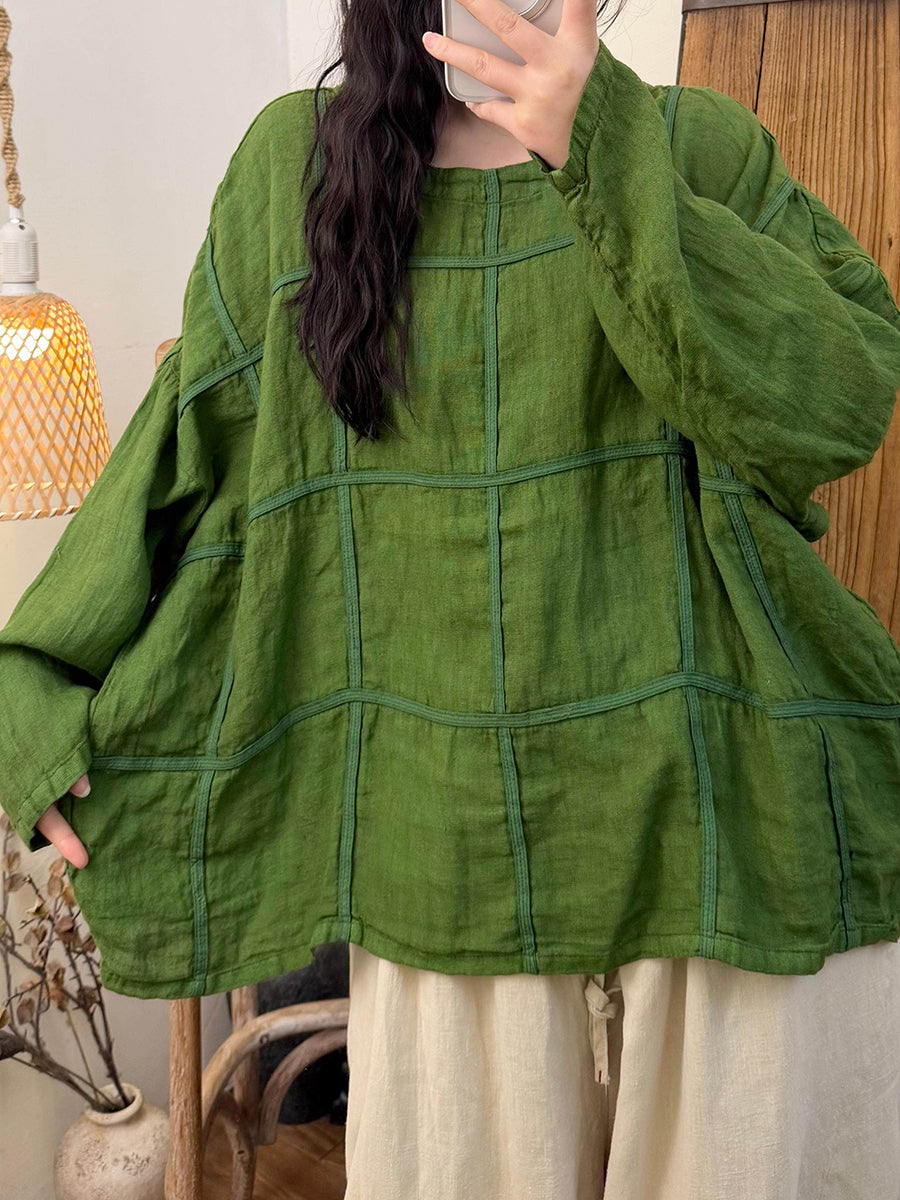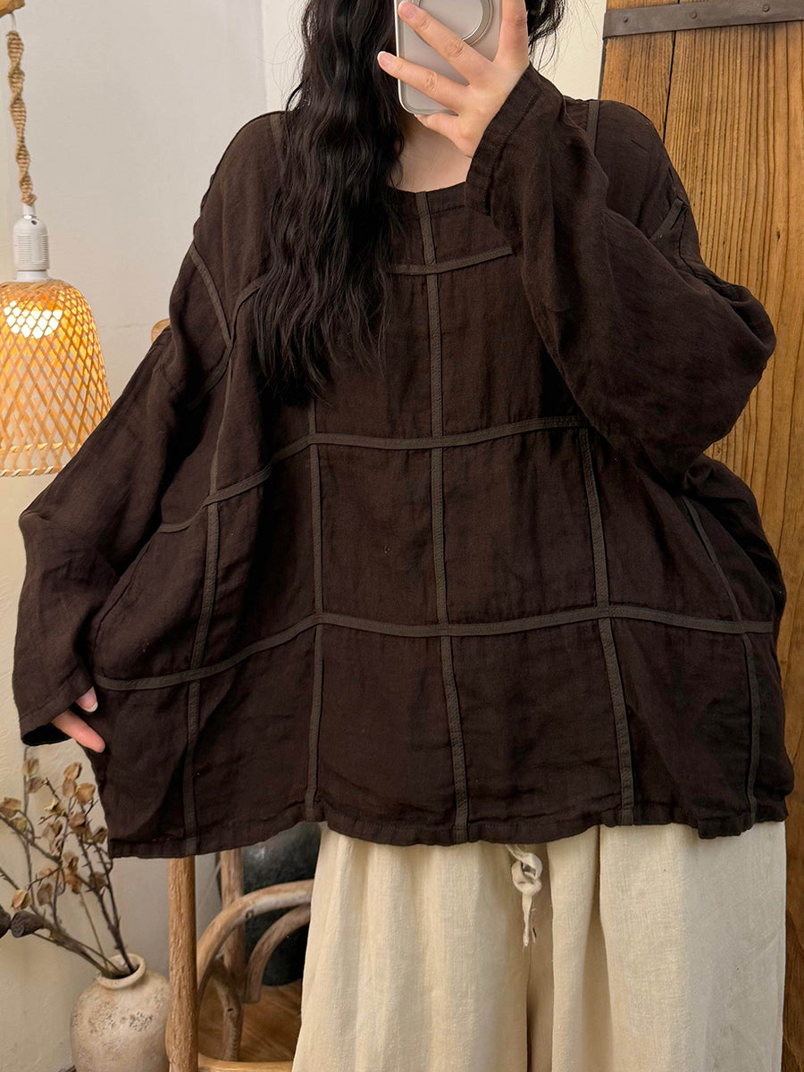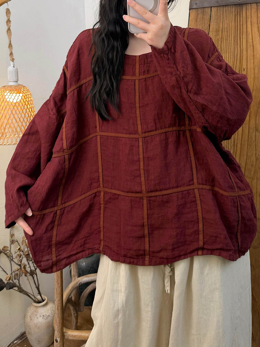 Camisa de lino con cuello redondo y cuadros vintage de primavera para mujer