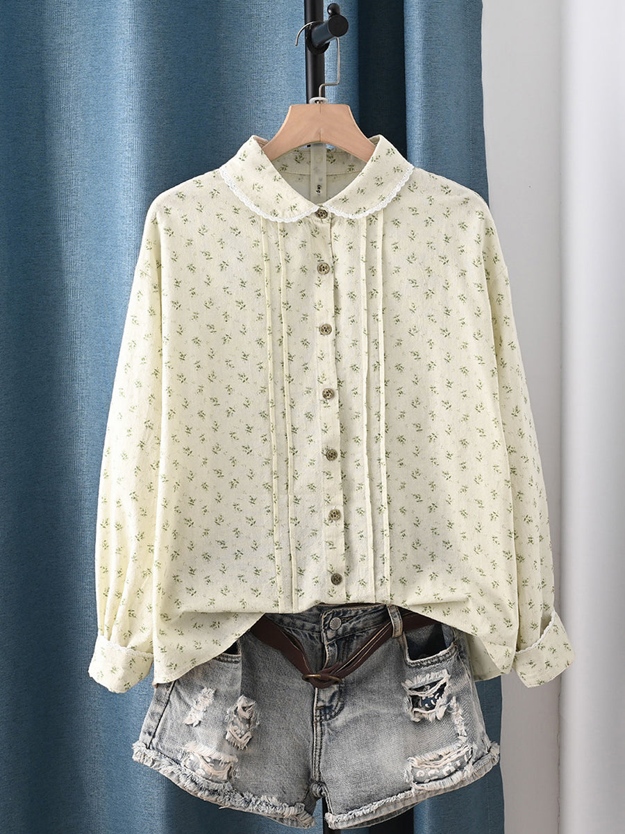 Camisa de cuello vuelto 100 % algodón con estampado floral artístico de primavera para mujer