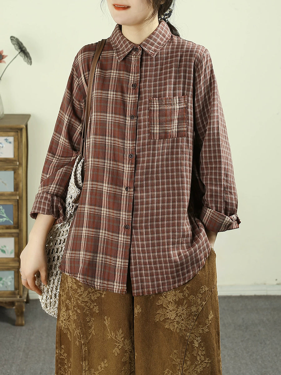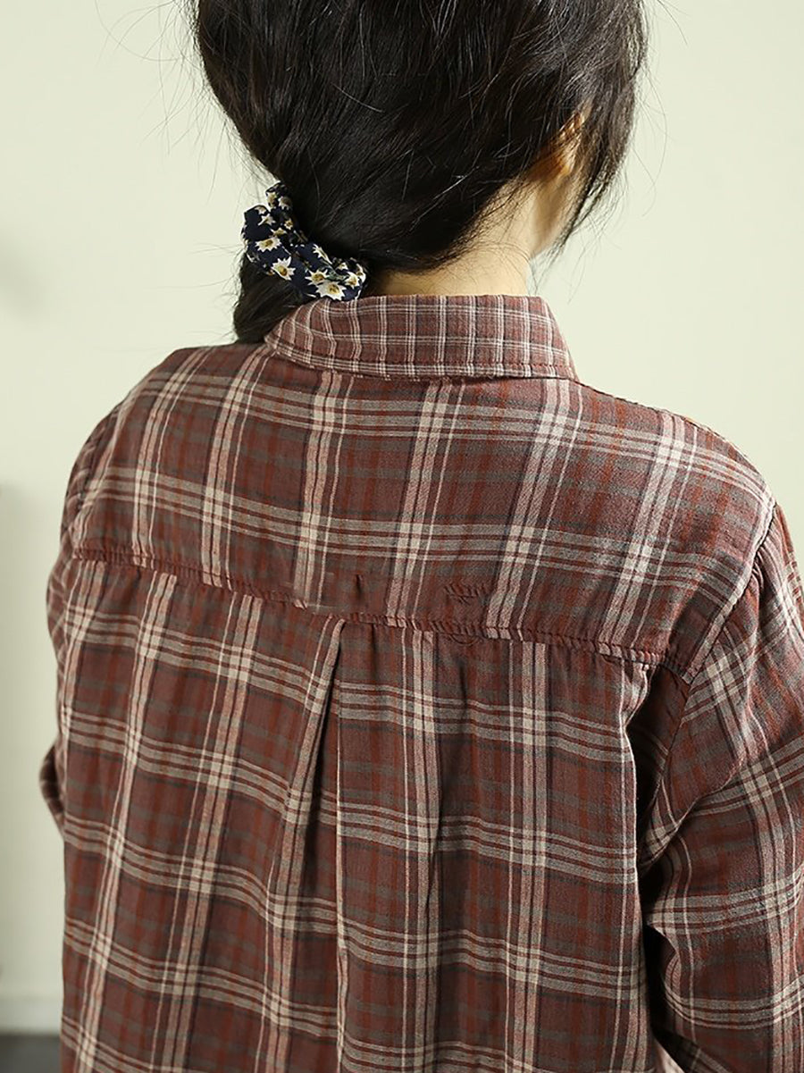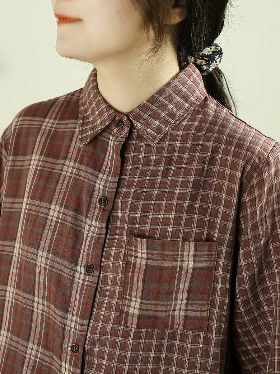 Camisa vintage de cuadros escoceses con cuello vuelto para mujer, 100 % algodón, primavera