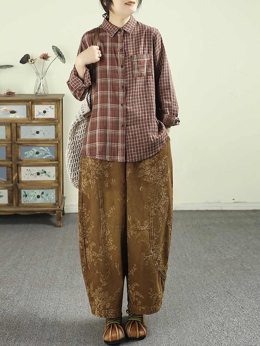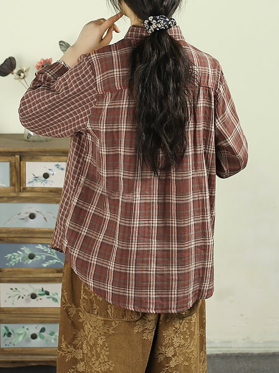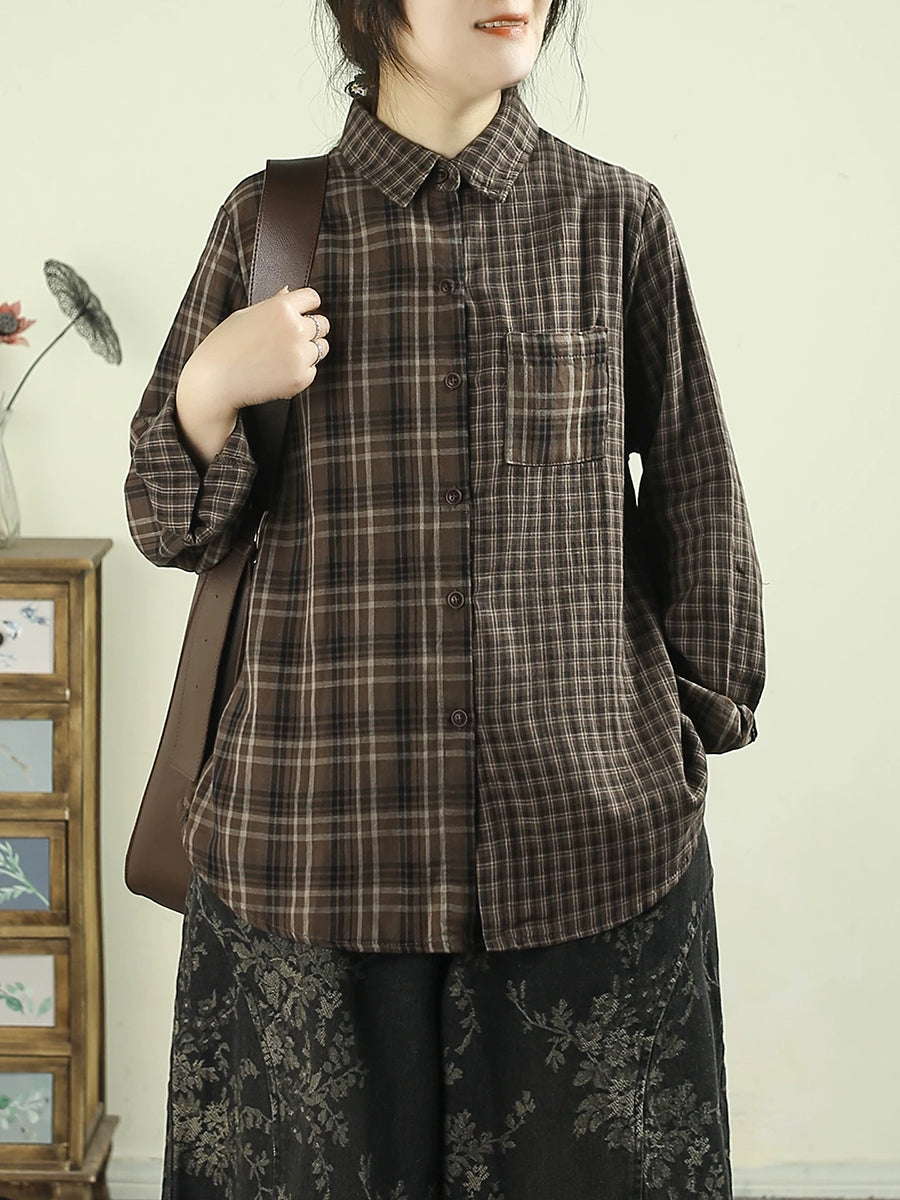 Camisa vintage de cuadros escoceses con cuello vuelto para mujer, 100 % algodón, primavera
