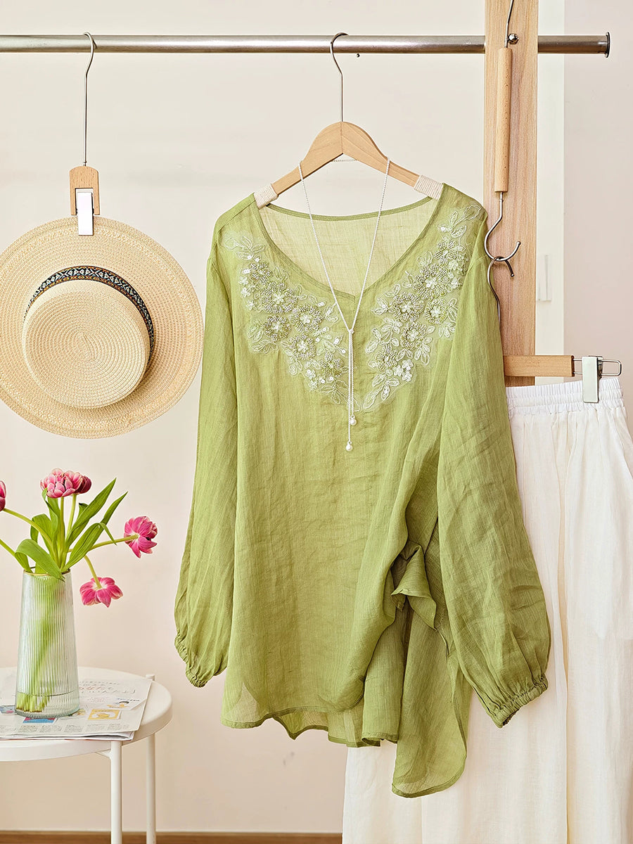 Blusa de verano para mujer con bordado de cuentas, 100% ramio.