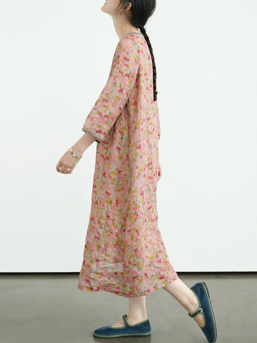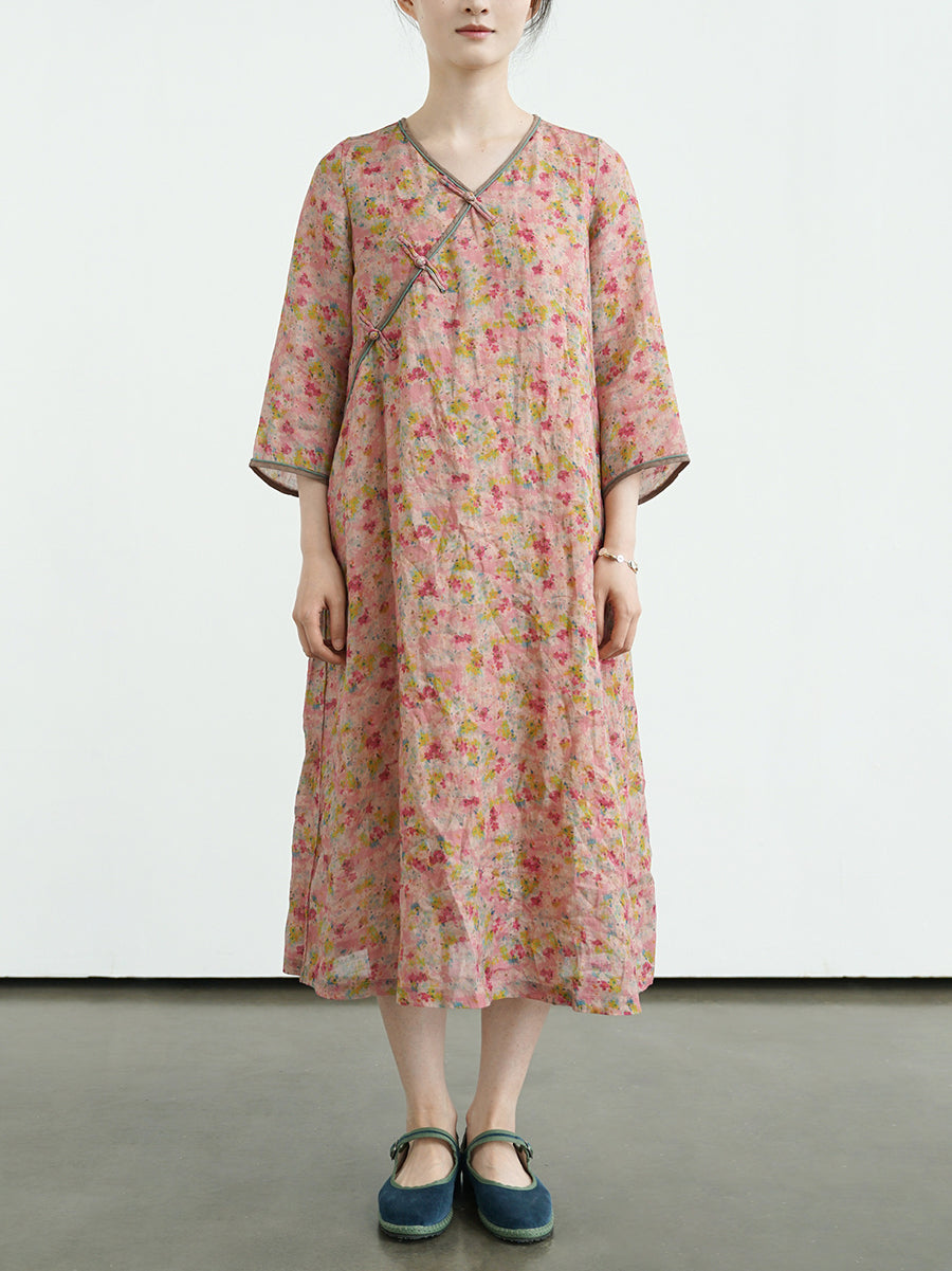 Vestido de verano vintage con estampado floral y escote en V, 100% ramio, para mujer