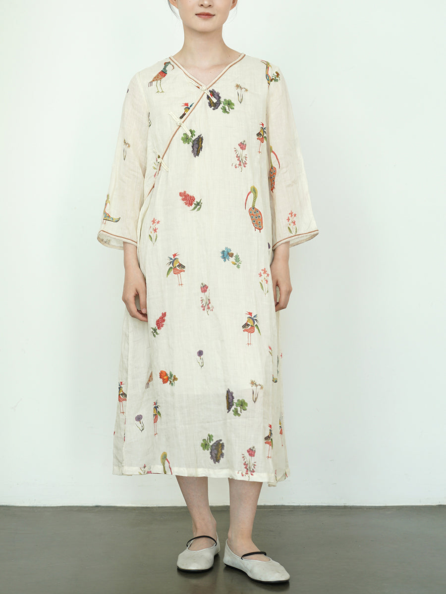 Vestido de verano para mujer con estampado vintage, 100% ramio y escote en V.