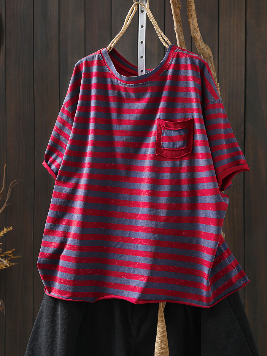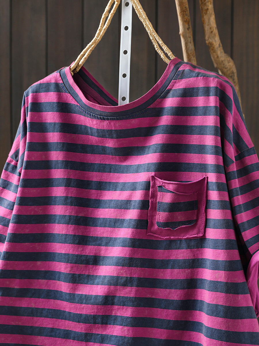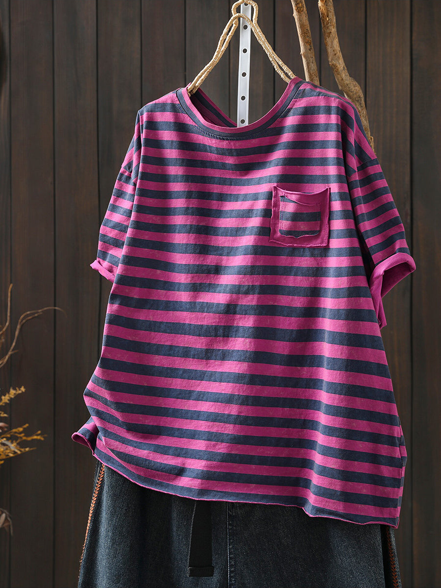 Camisa informal de verano a rayas con cuello redondo para mujer