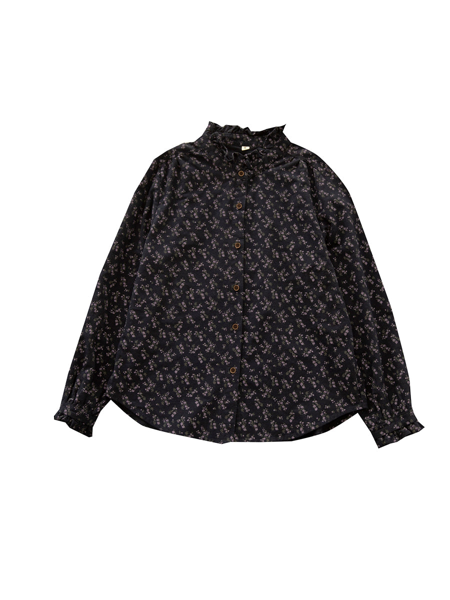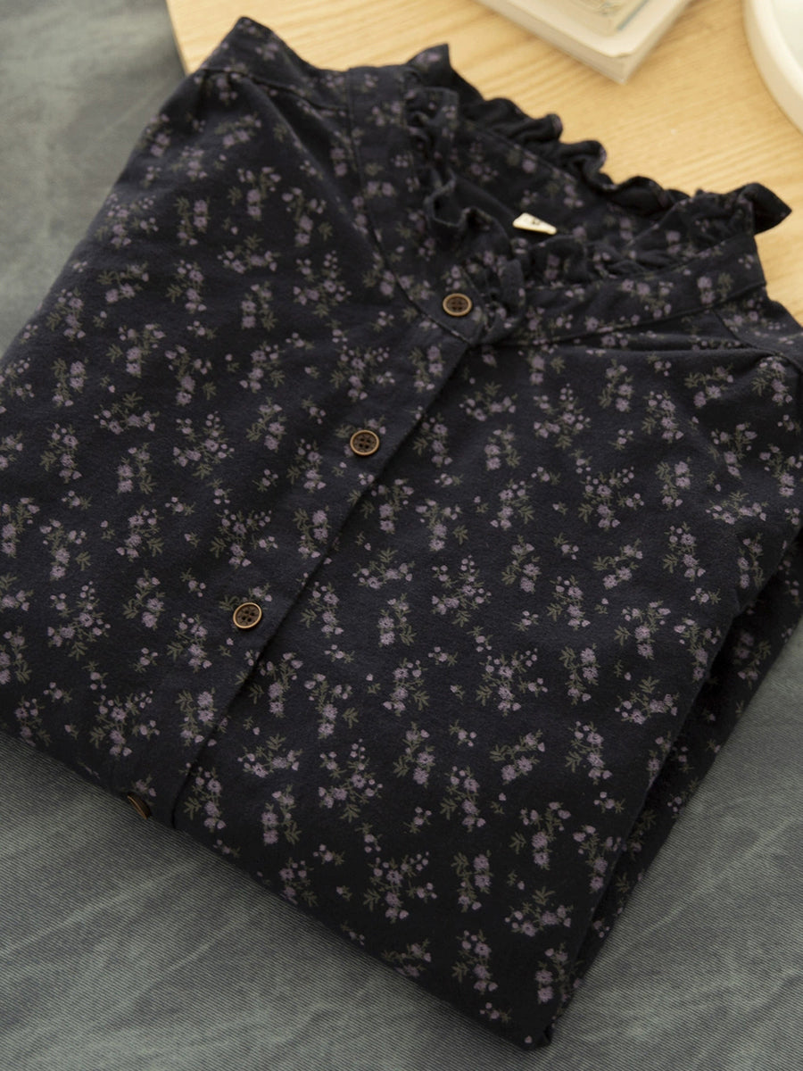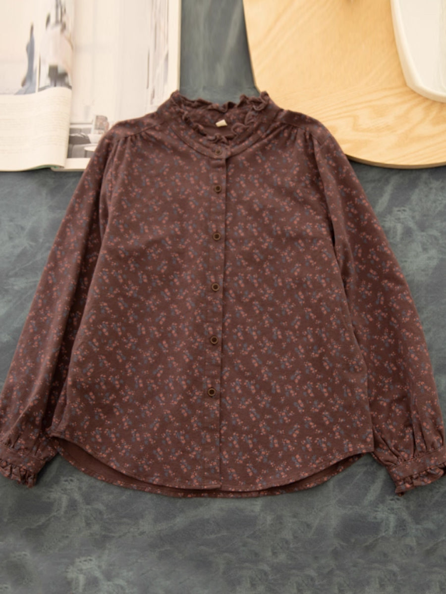 Camisa de algodón con cuello alto y estampado floral artístico para mujer