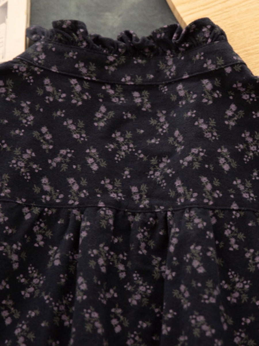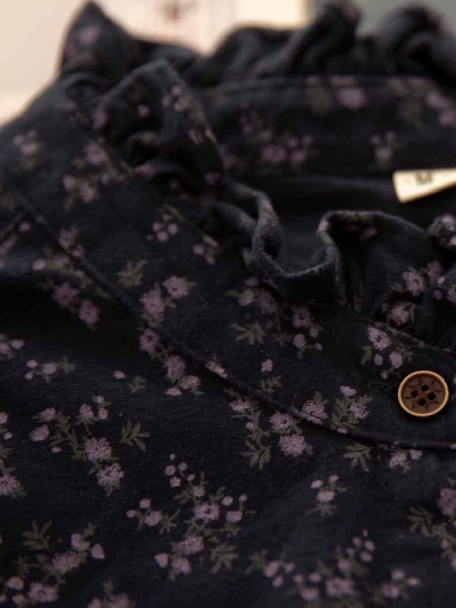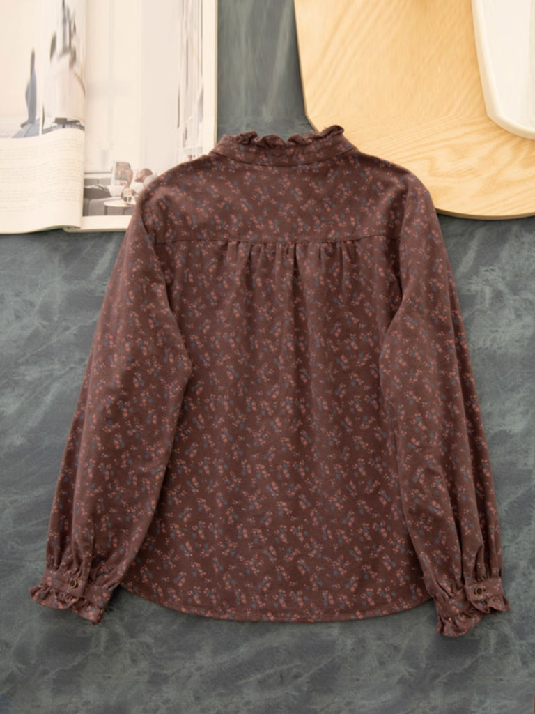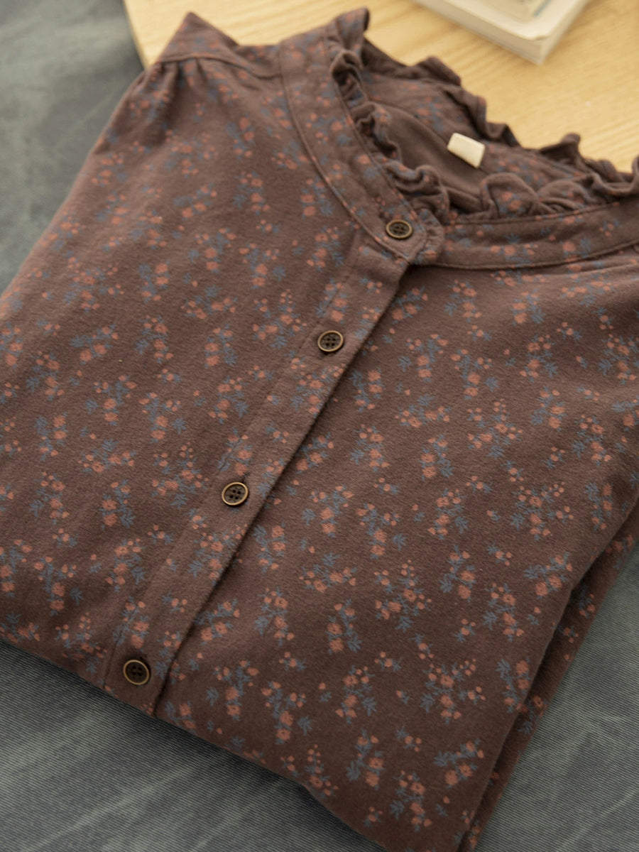 Camisa de algodón con cuello alto y estampado floral artístico para mujer