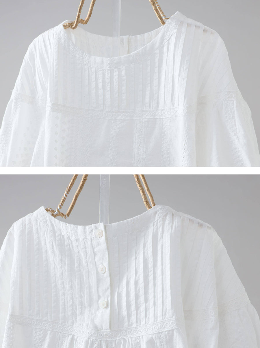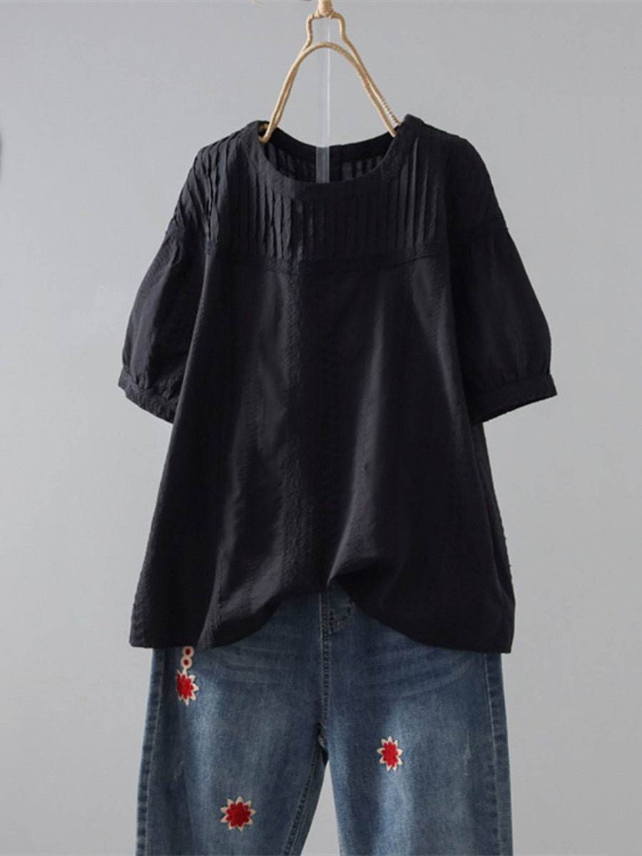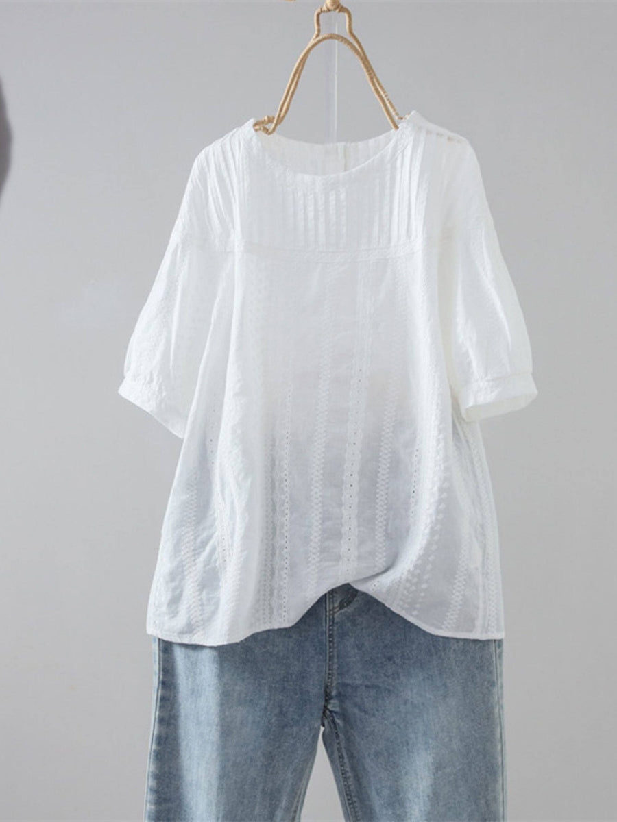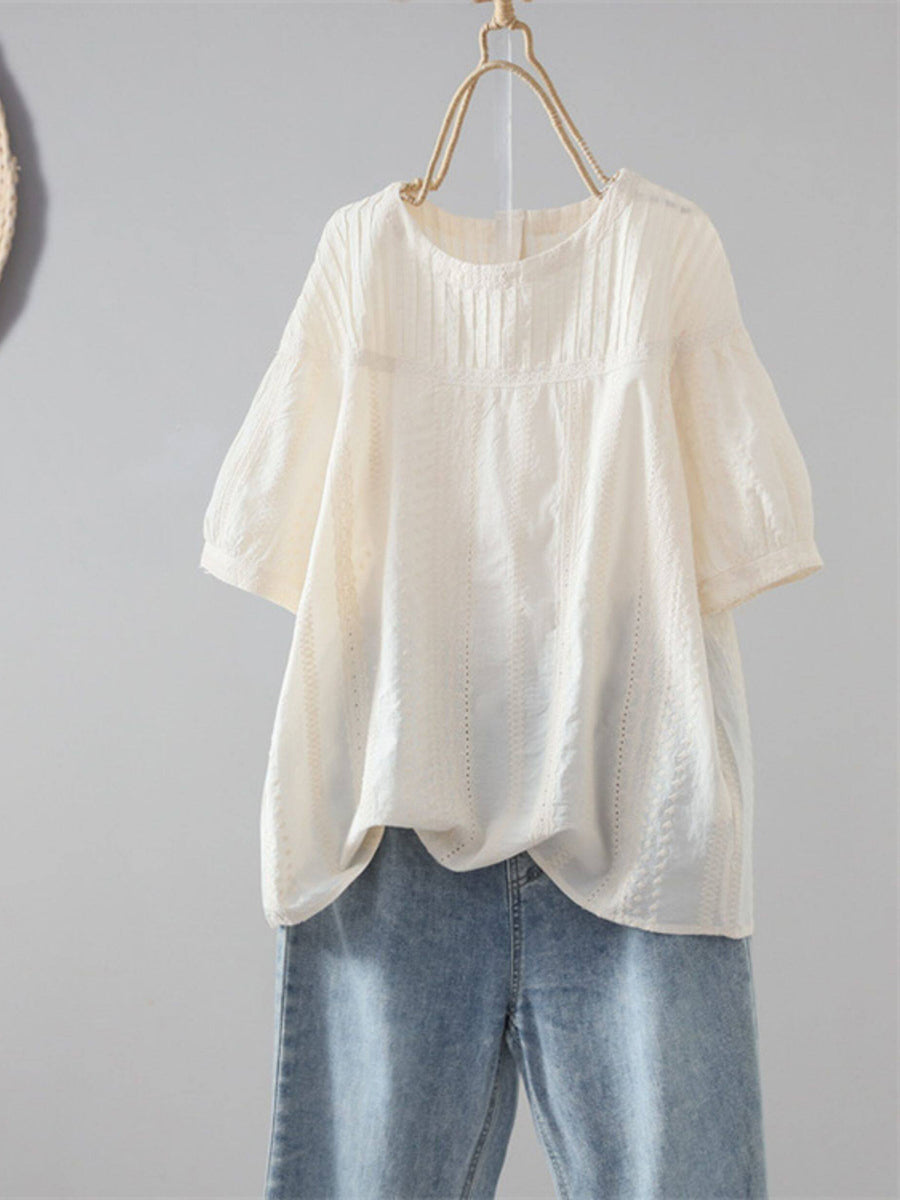 Camisa de verano para mujer, 100 % algodón, con cuello redondo y estampado artístico de jacquard