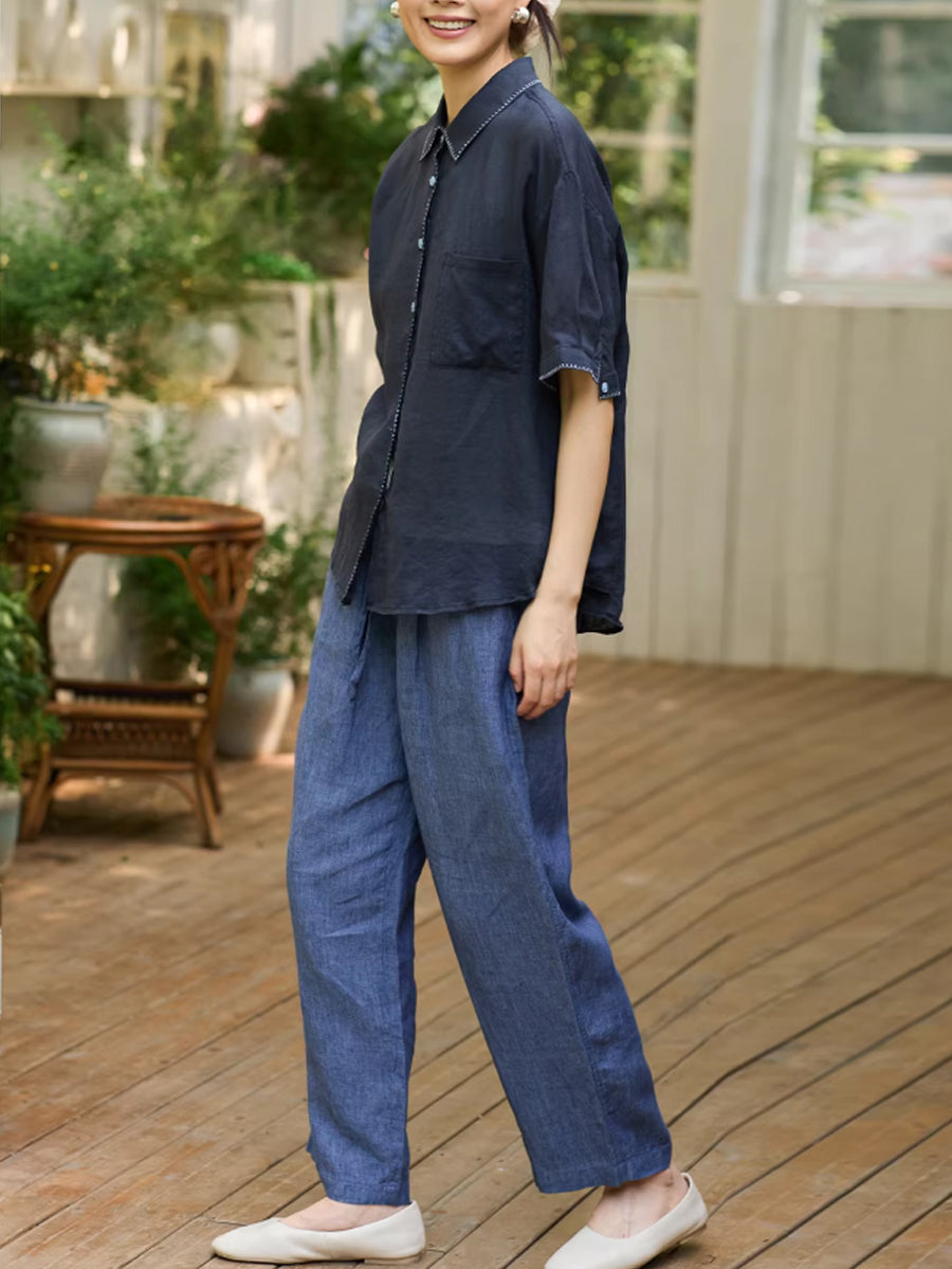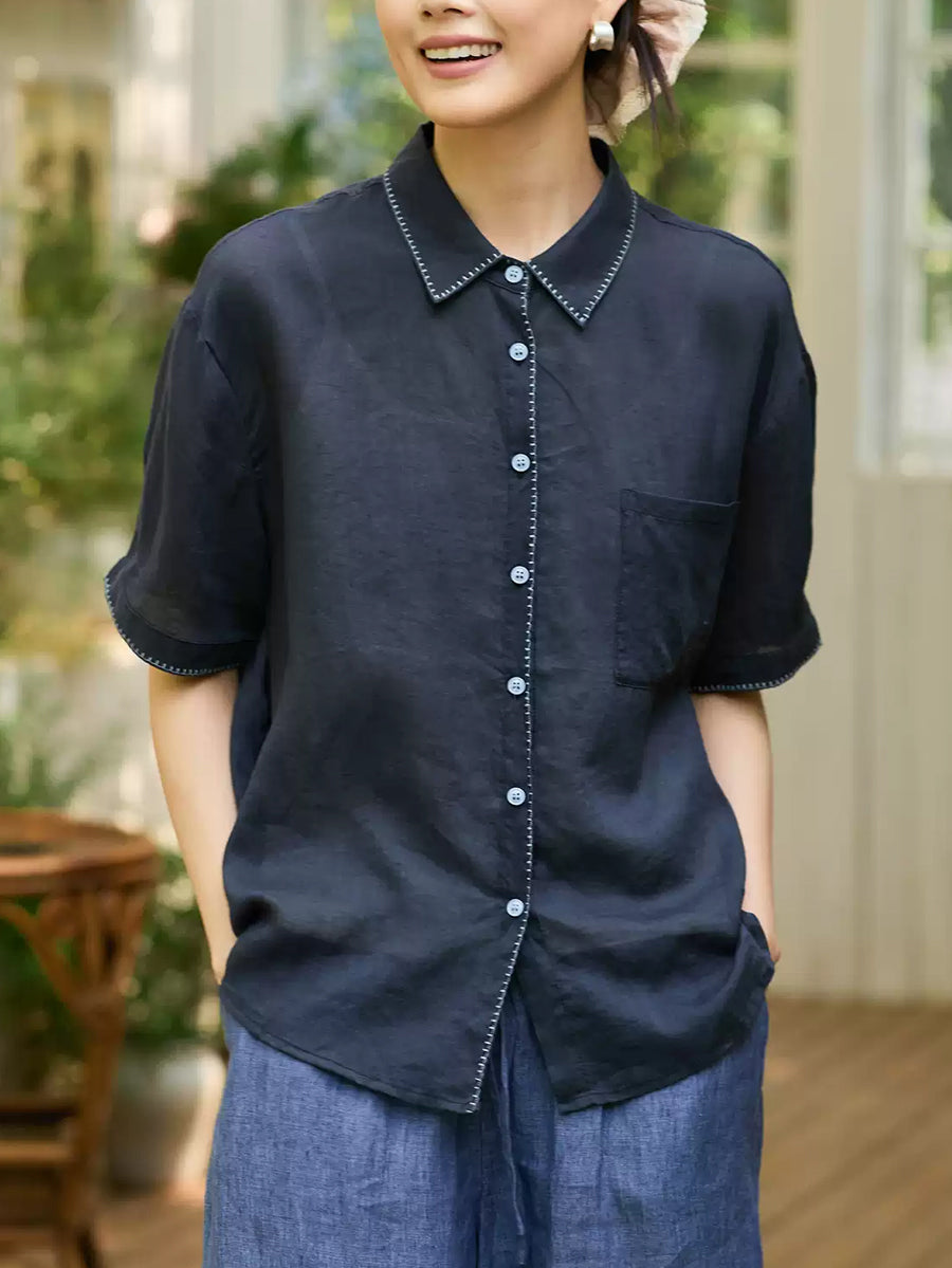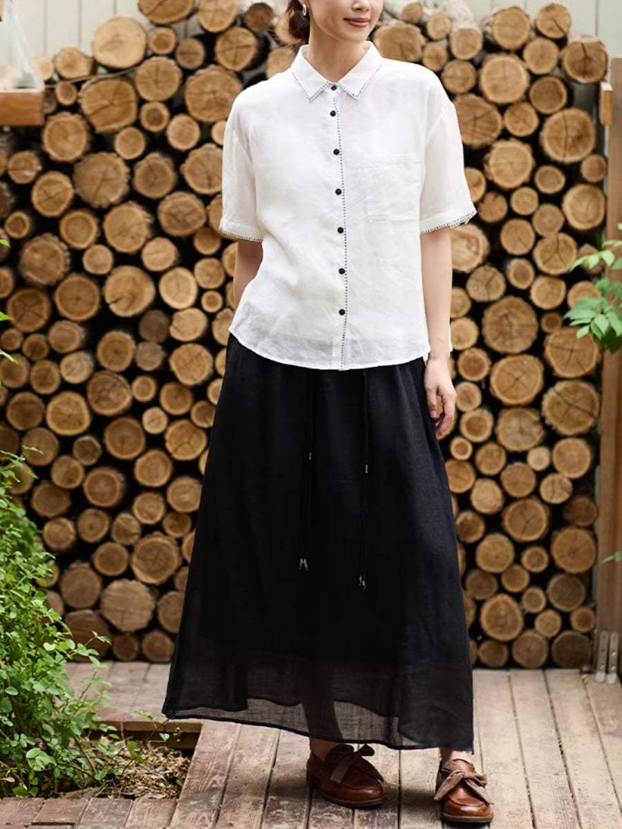 Camisa de verano con cuello vuelto y estampado artístico de ramio para mujer