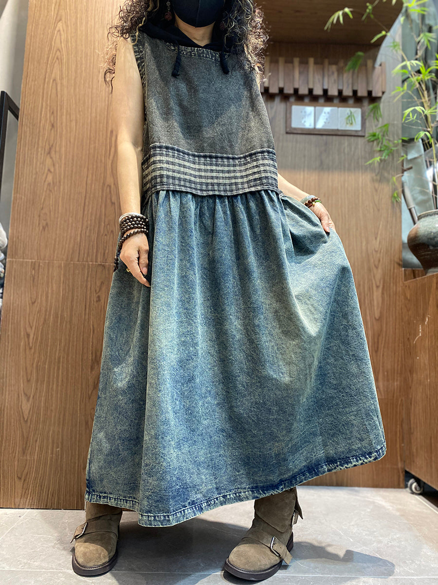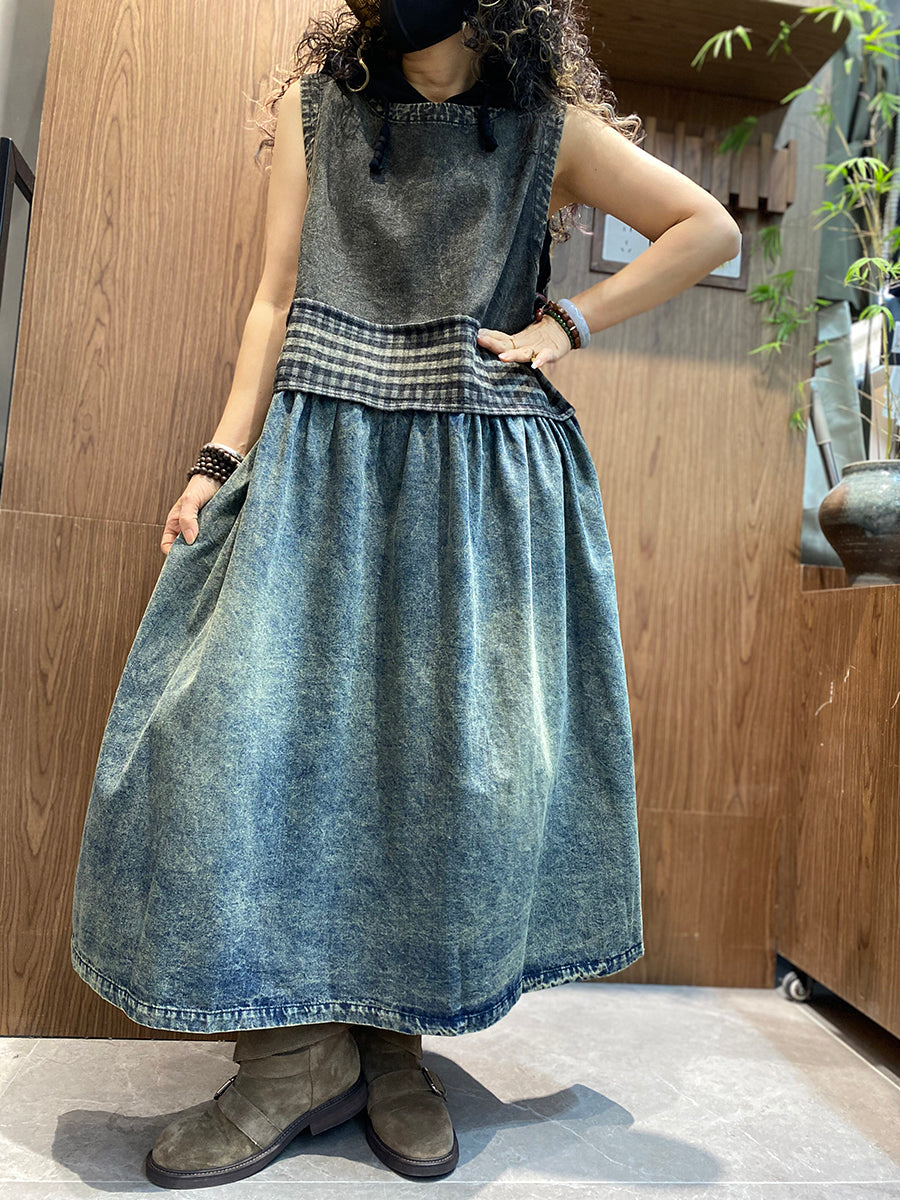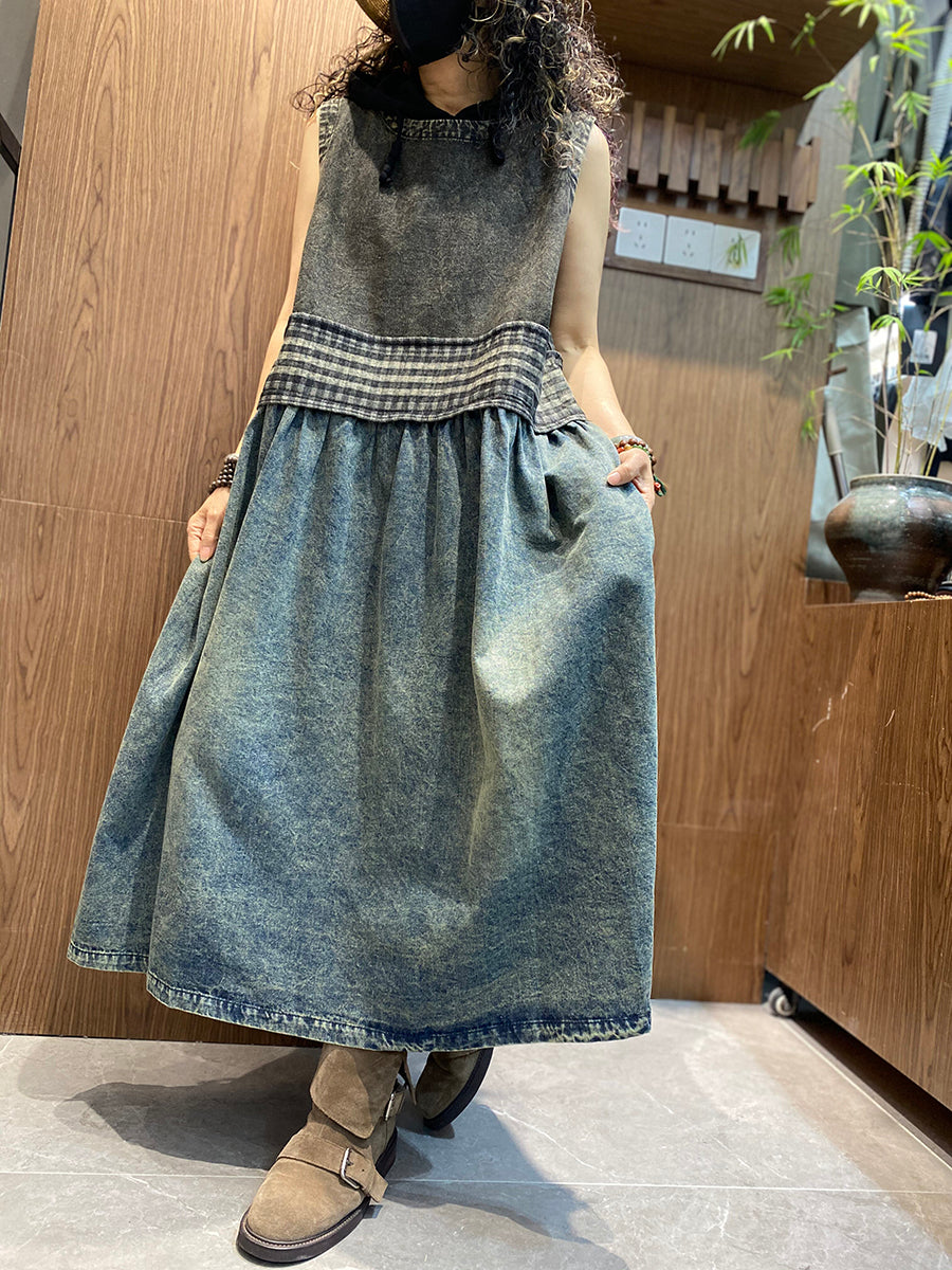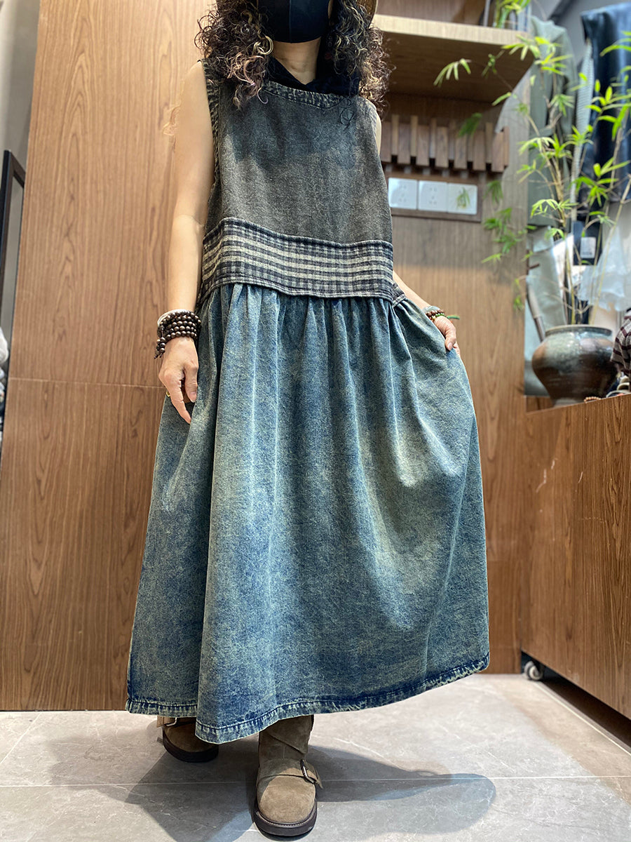 Vestido tipo chaleco de mezclilla vintage de verano para mujer con cuello redondo y empalmado