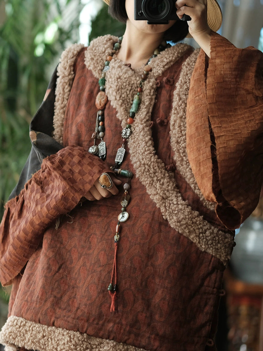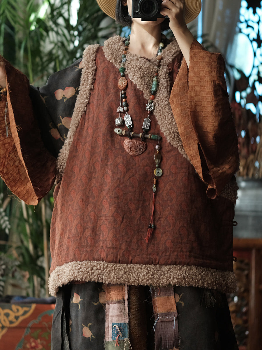 Chaleco acolchado de cuello redondo con empalme de polar vintage de invierno para mujer