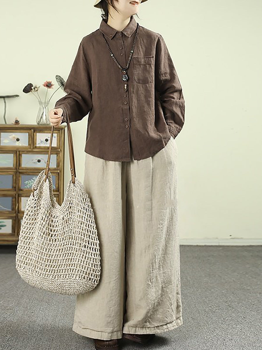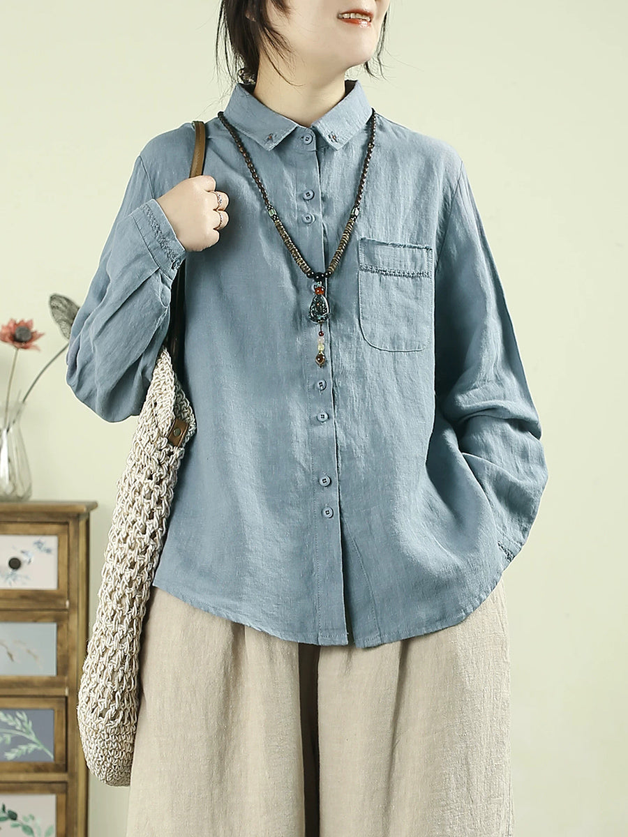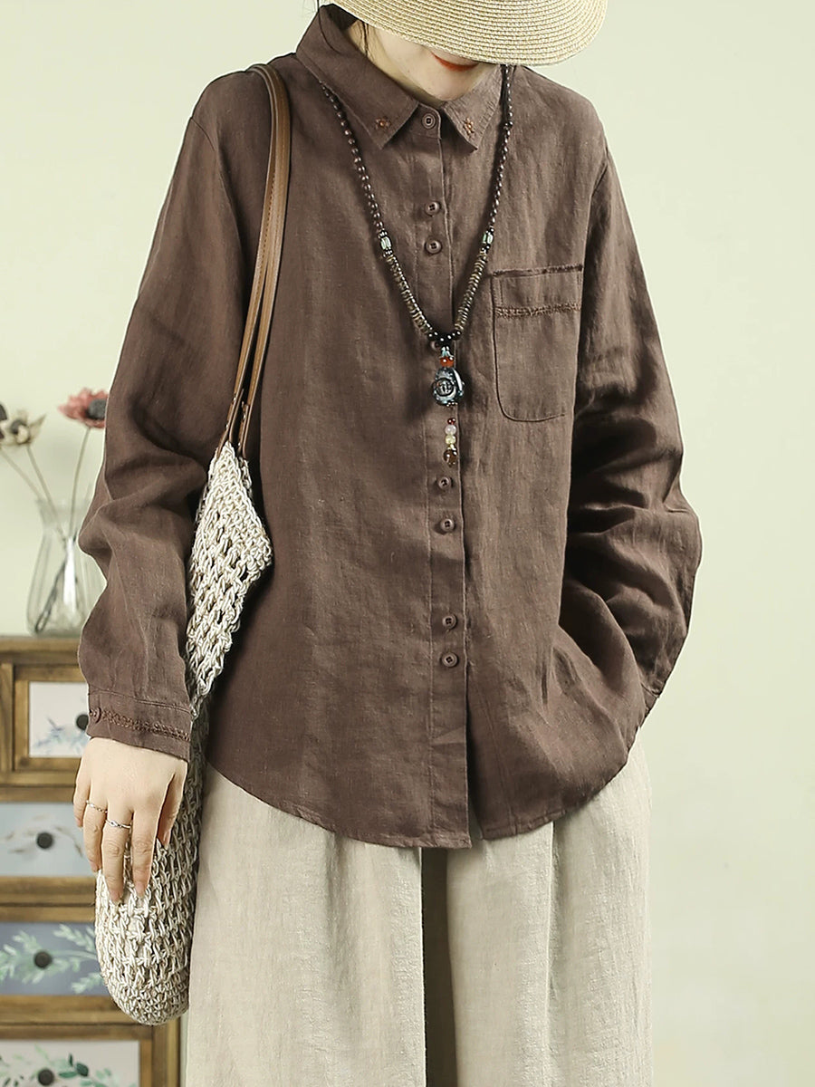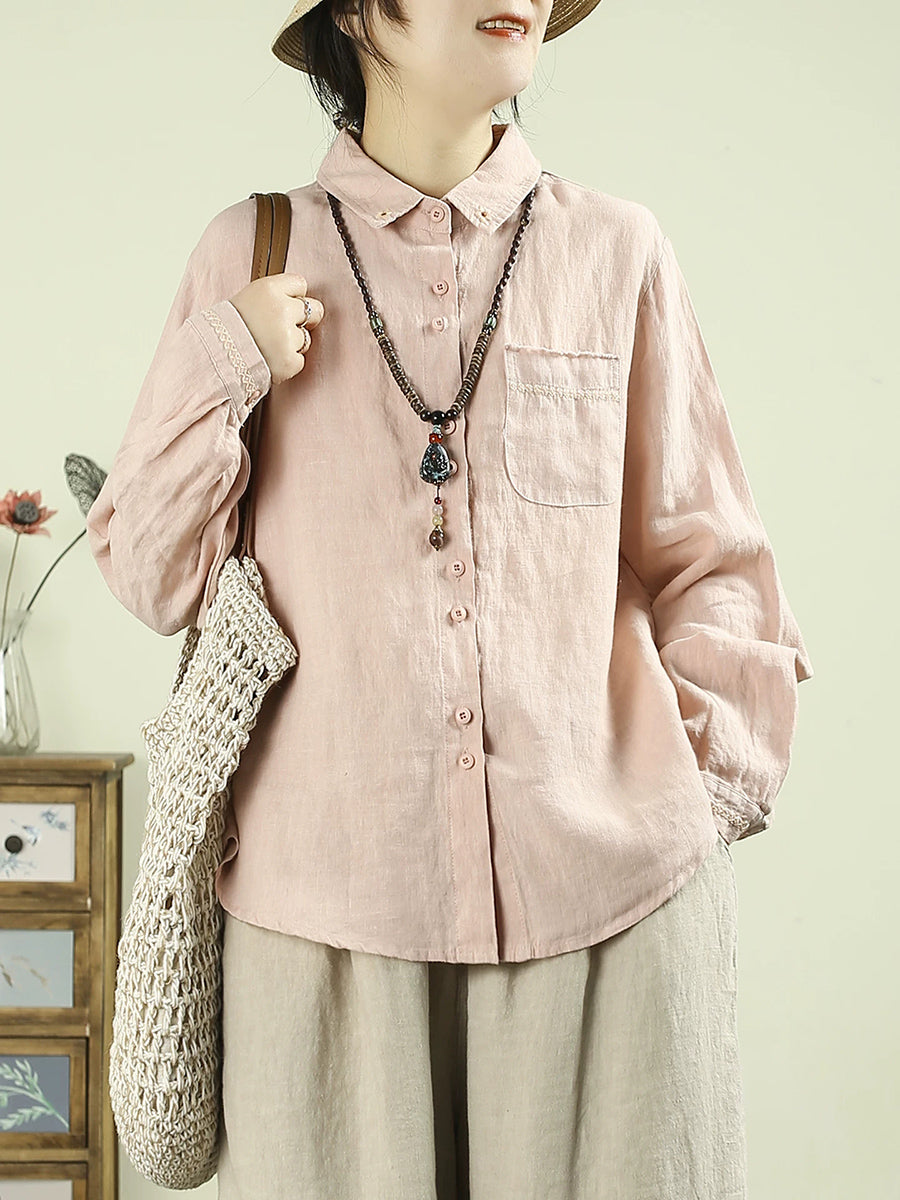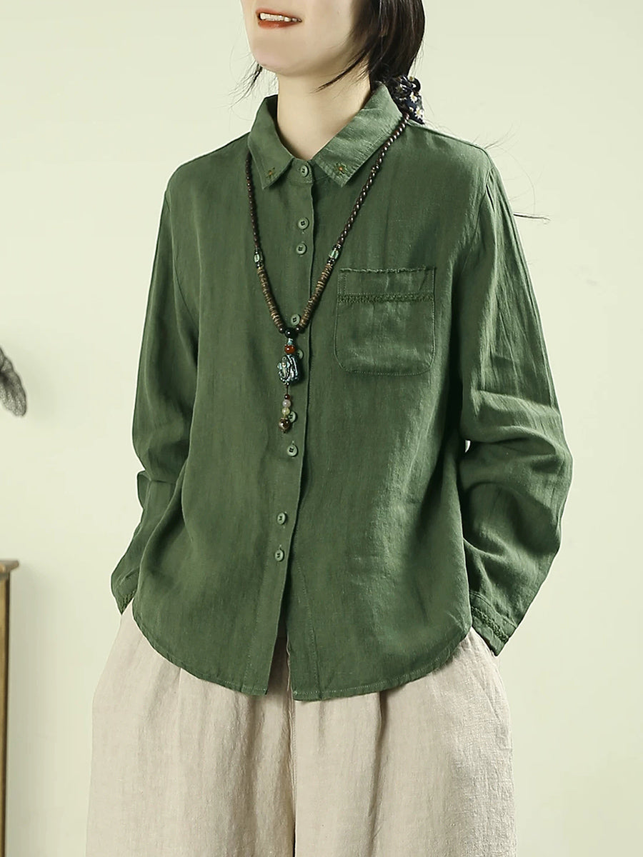 Camisa de mujer Artsy Spring de lino 100 % con cuello vuelto y color puro