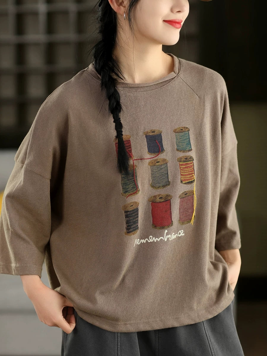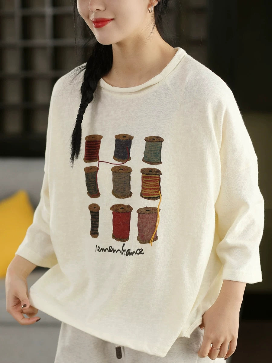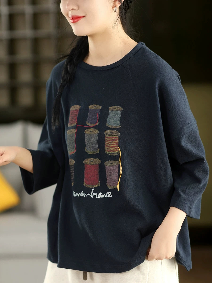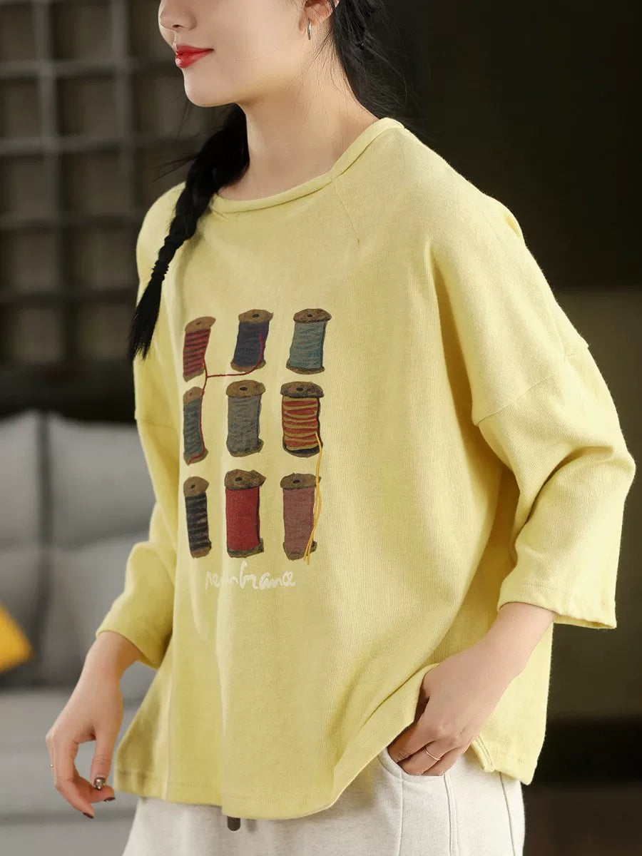 Blusa de algodón con cuello redondo y estampado artístico de primavera para mujer