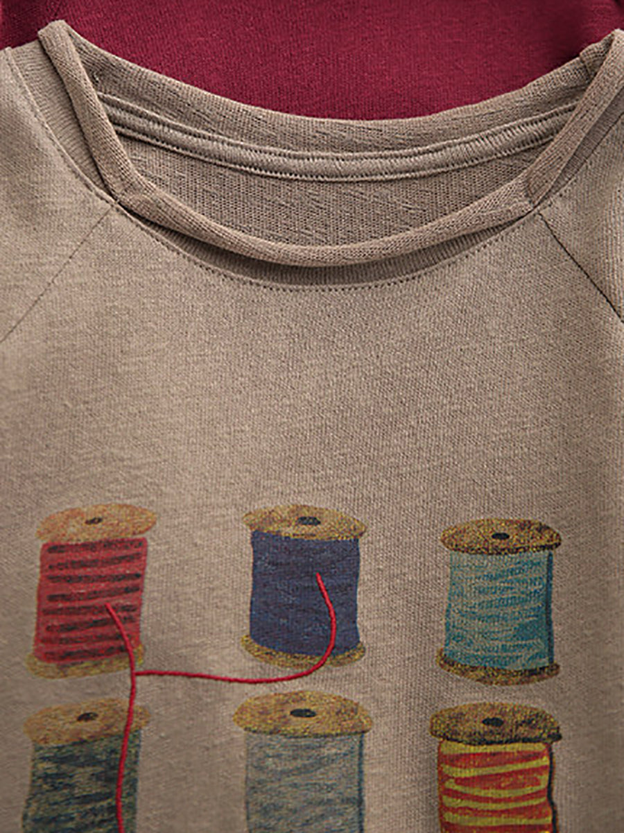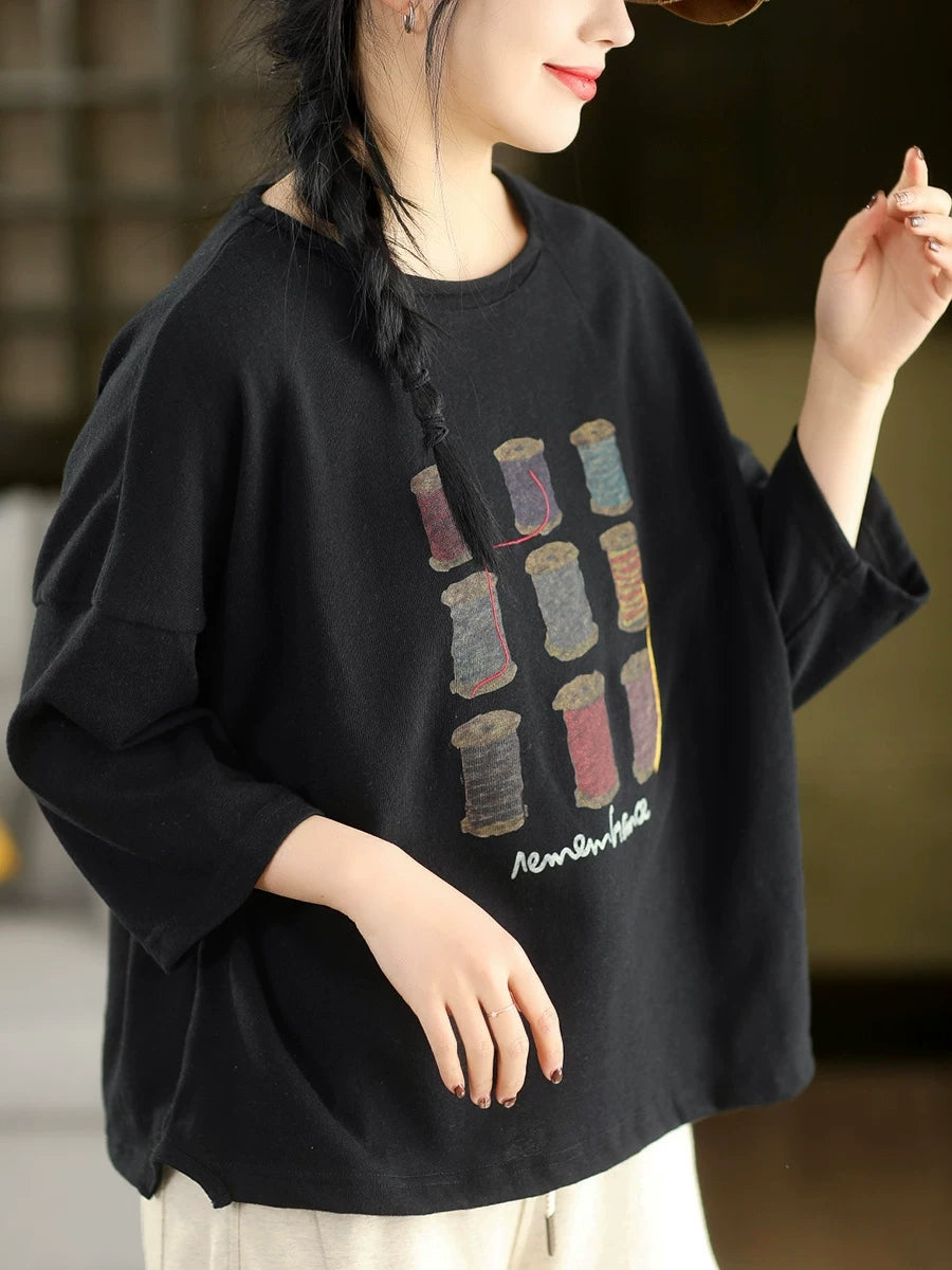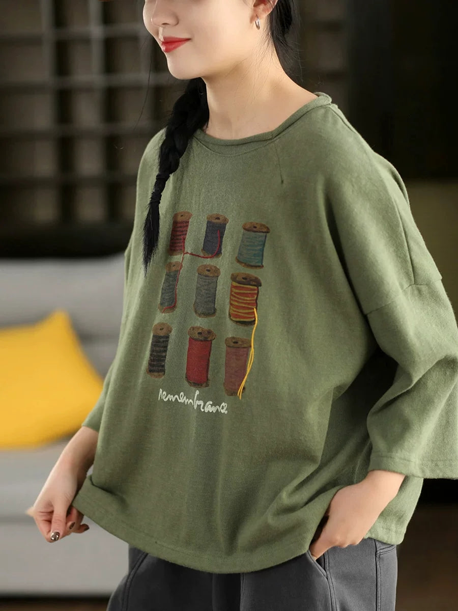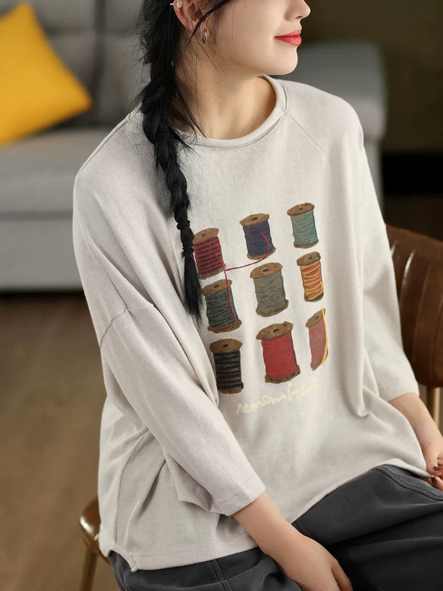 Blusa de algodón con cuello redondo y estampado artístico de primavera para mujer
