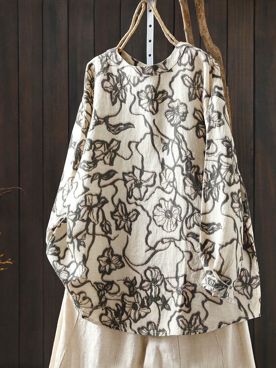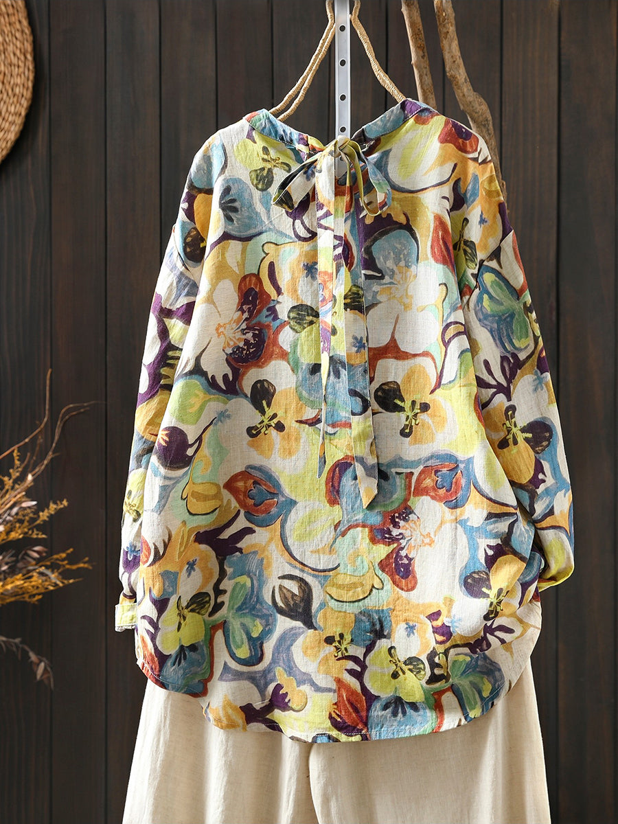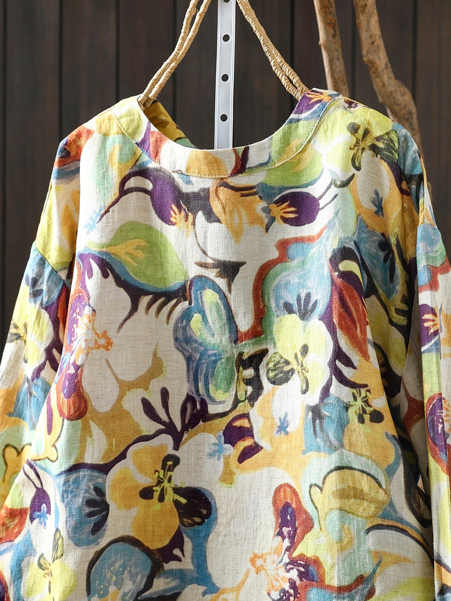 Blusa de lino 100 % con estampado floral artístico de primavera para mujer