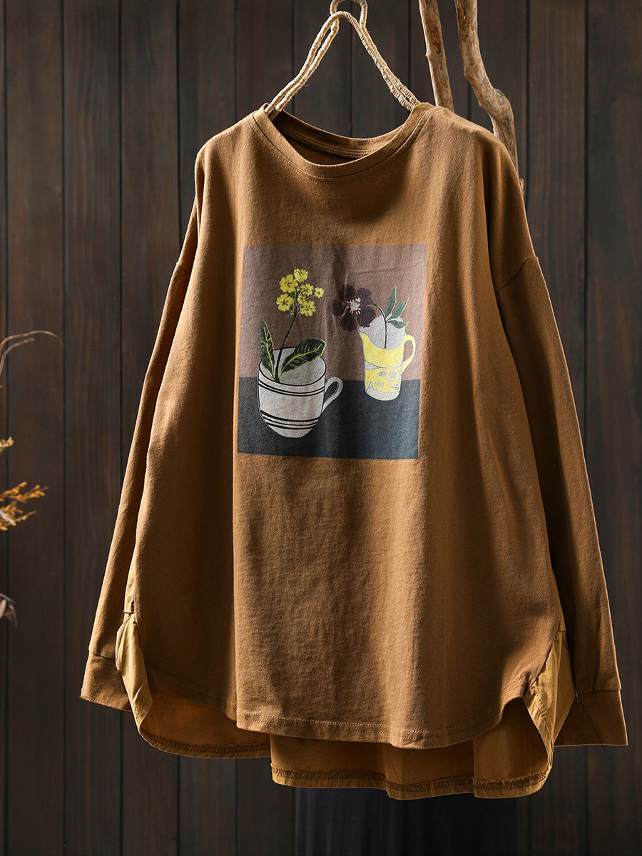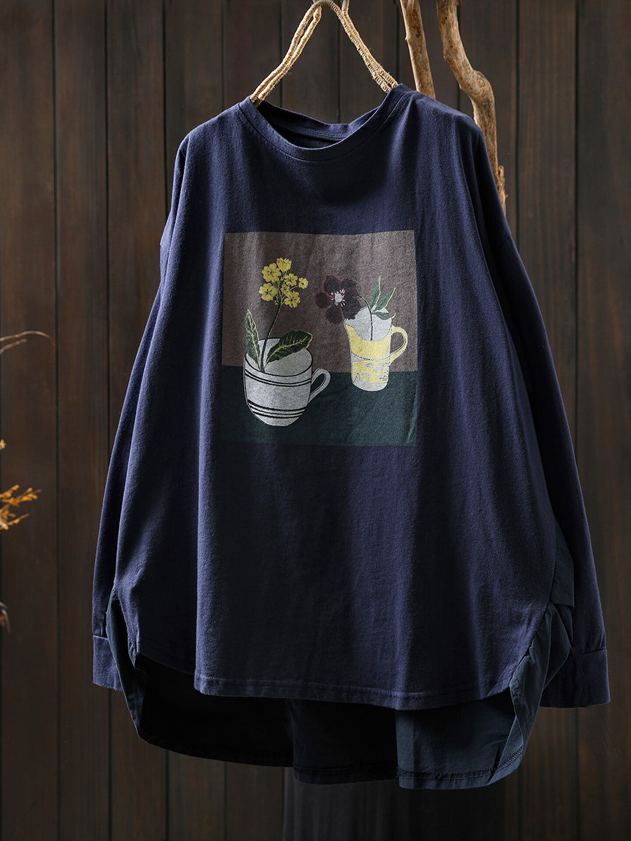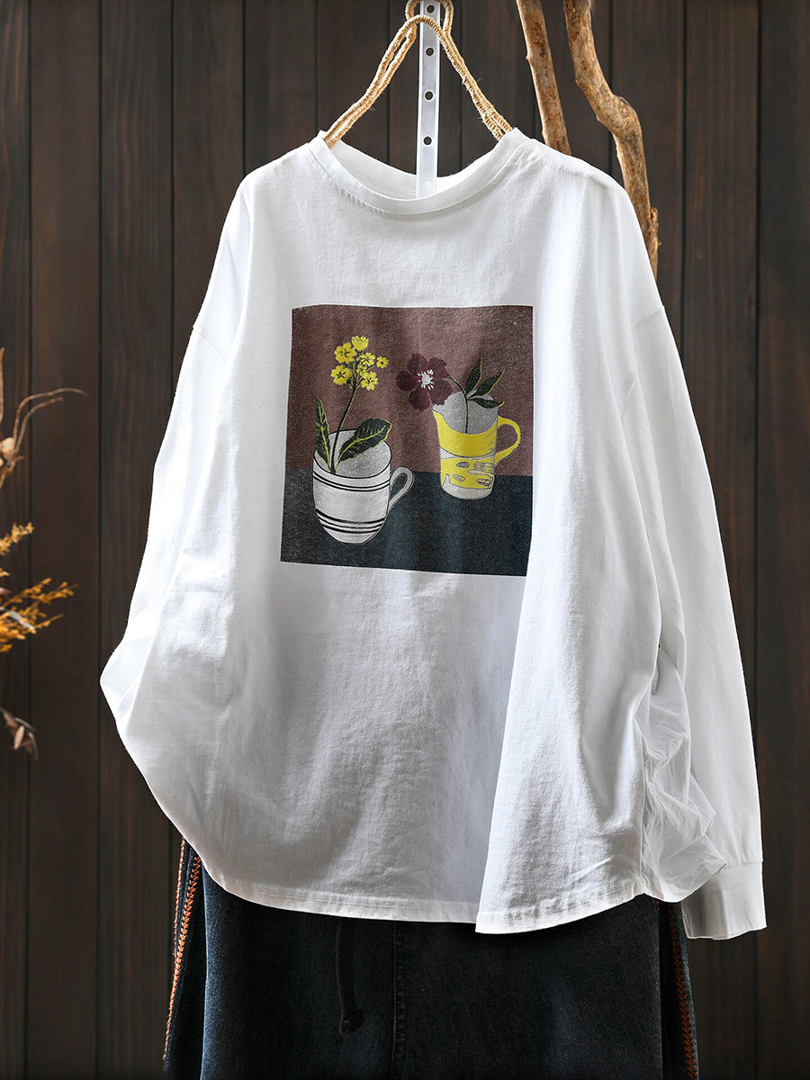 Camisa de algodón con cuello redondo y estampado veraniego para mujer