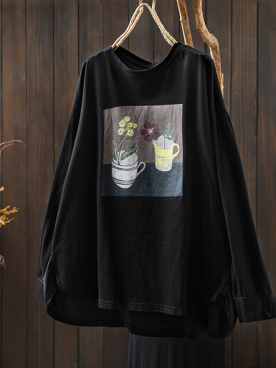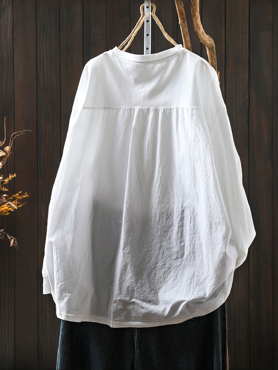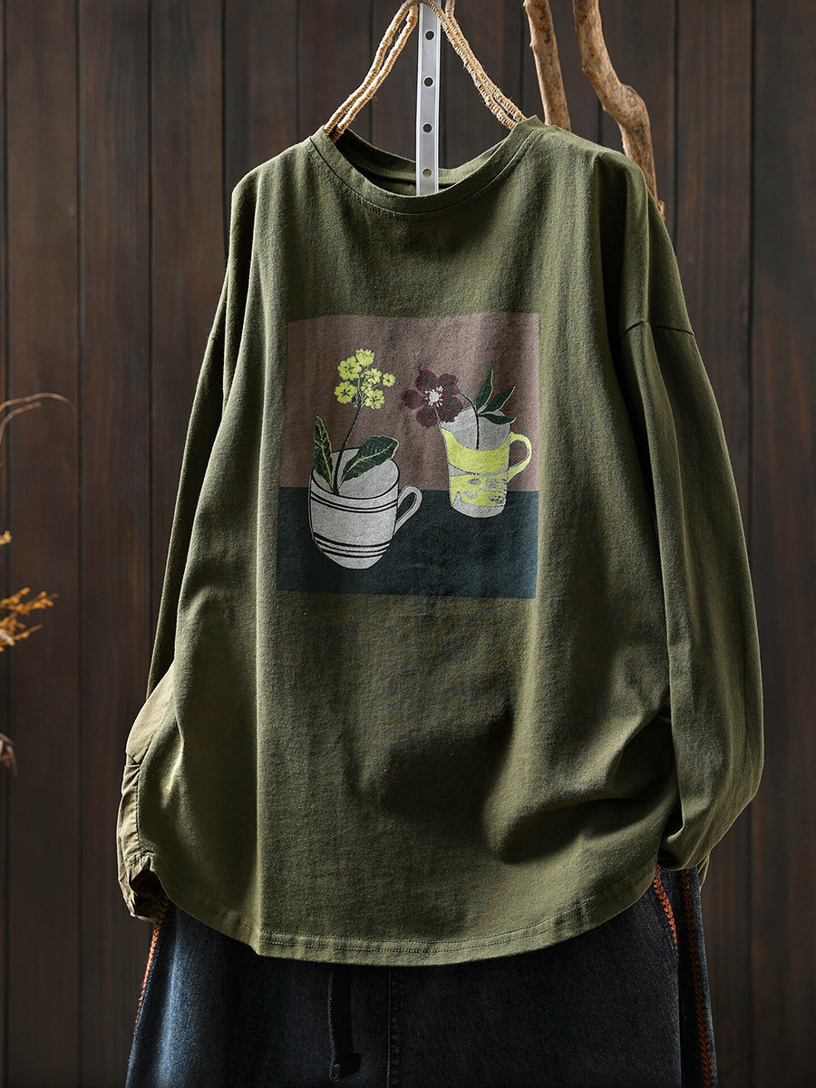 Camisa de algodón con cuello redondo y estampado veraniego para mujer