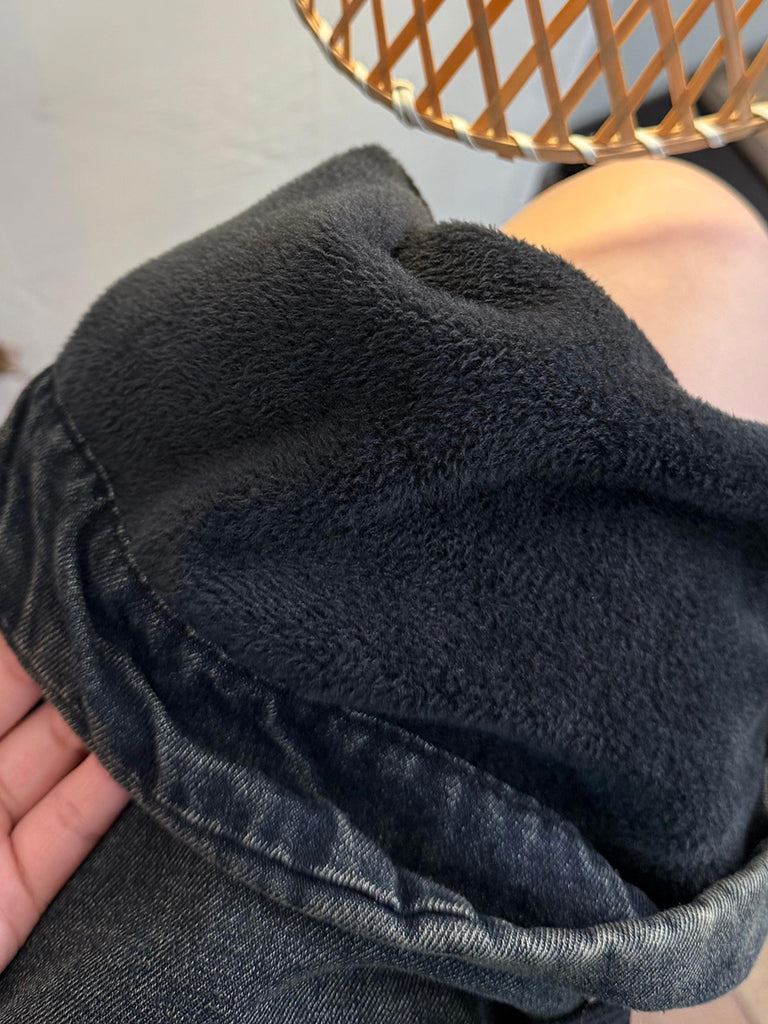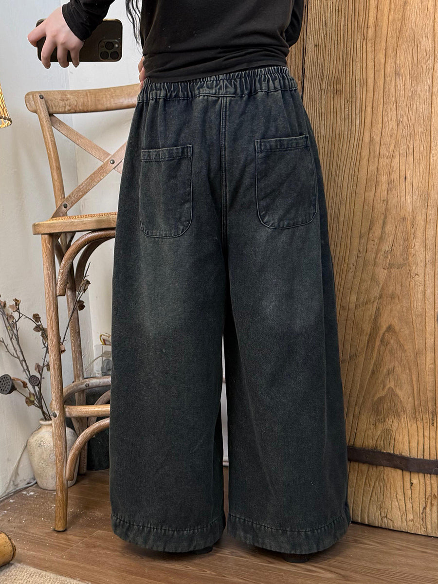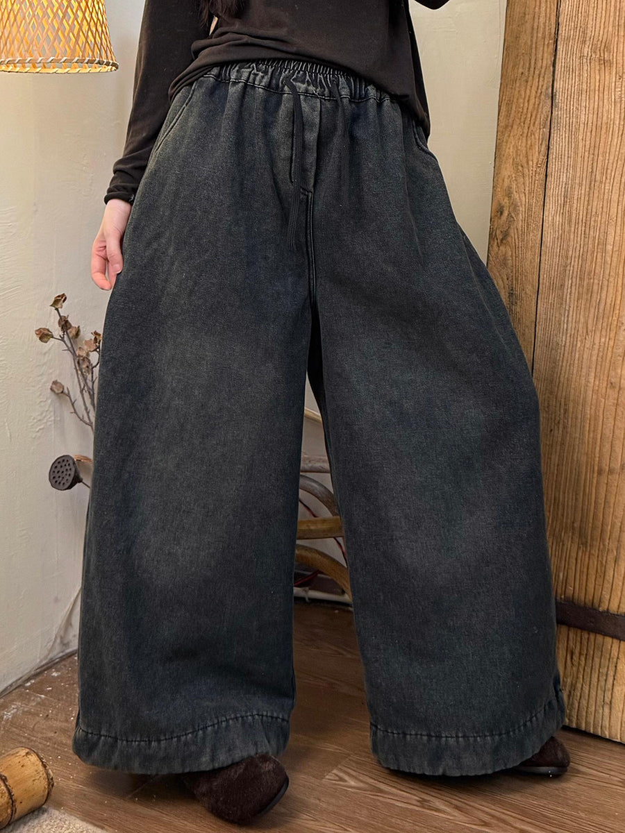 Women Autumn Retro Denim Fleece-lined Wide-leg Pants