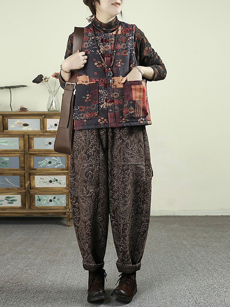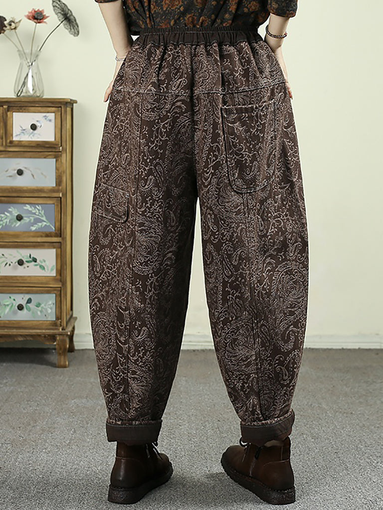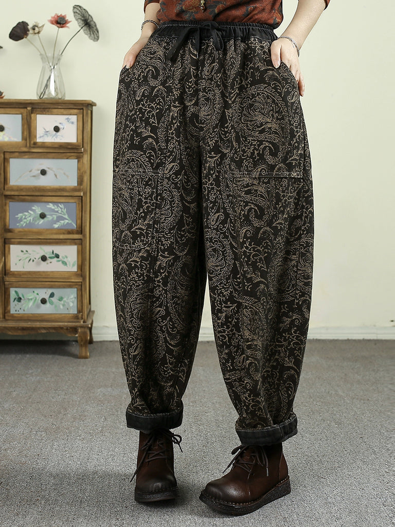 Women Winter Retro Flower Jacquard Fleece-lined Harem Pants