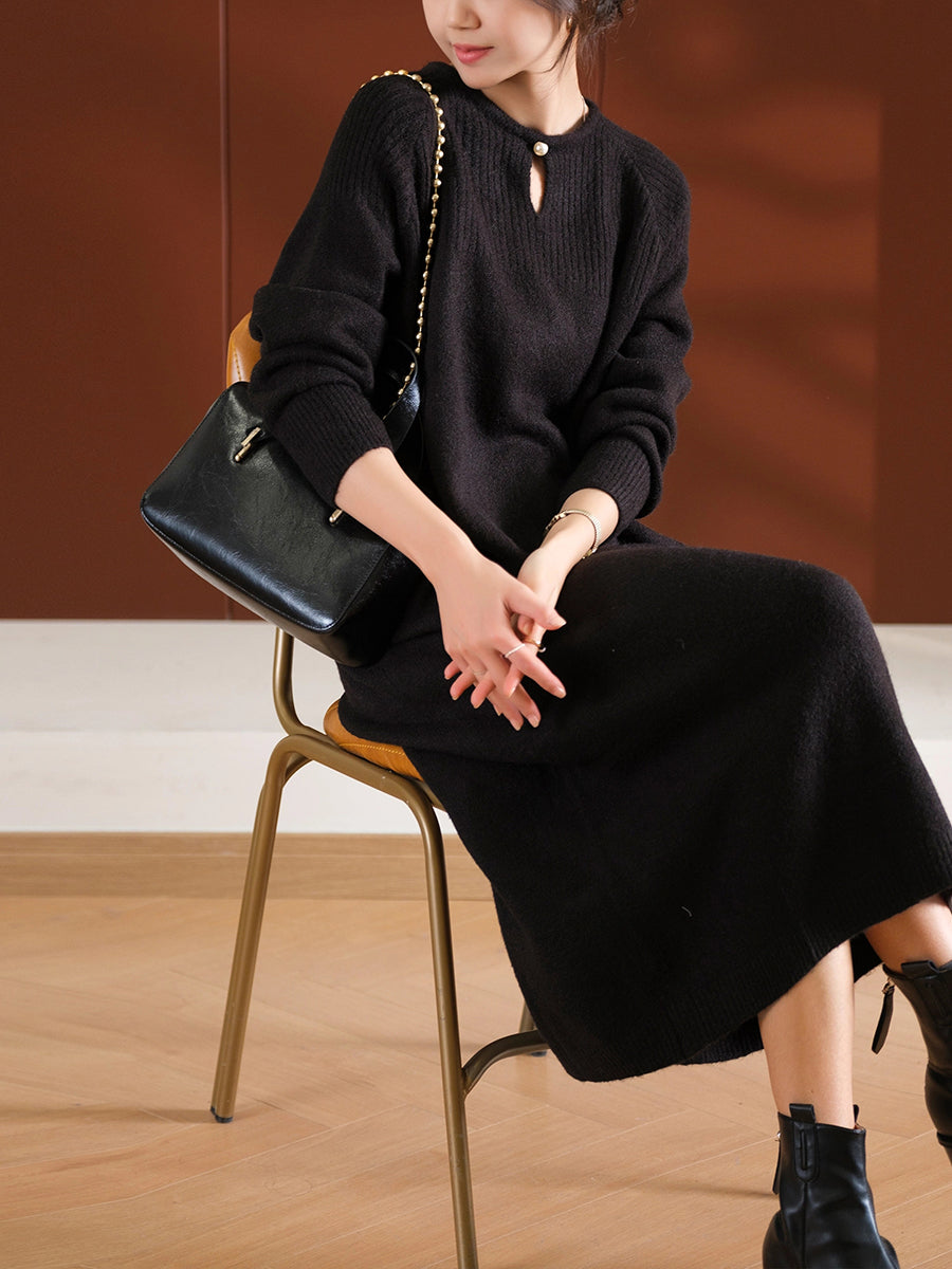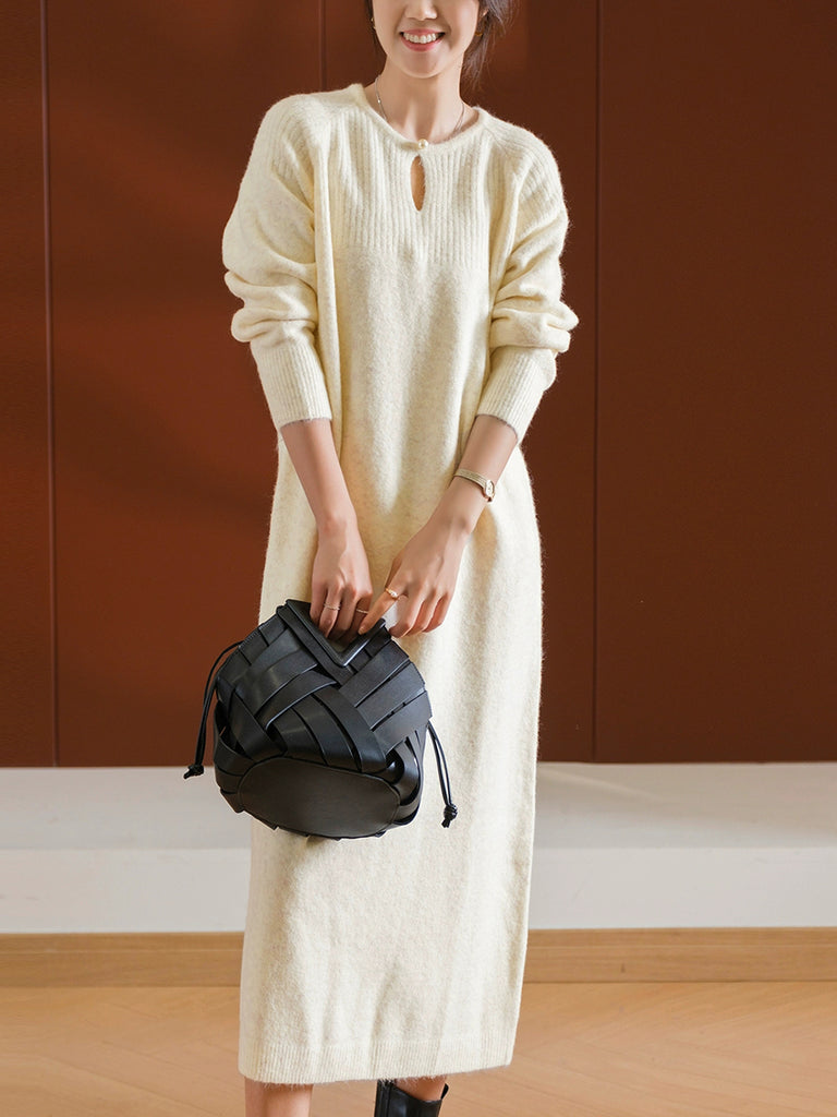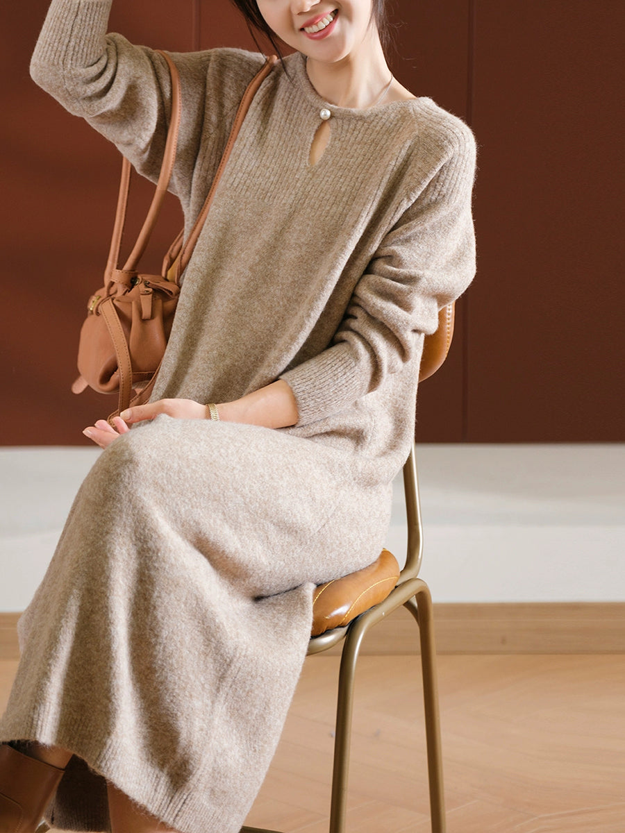 Women Autumn Casual Pure Color O-Neck Knitted Dress