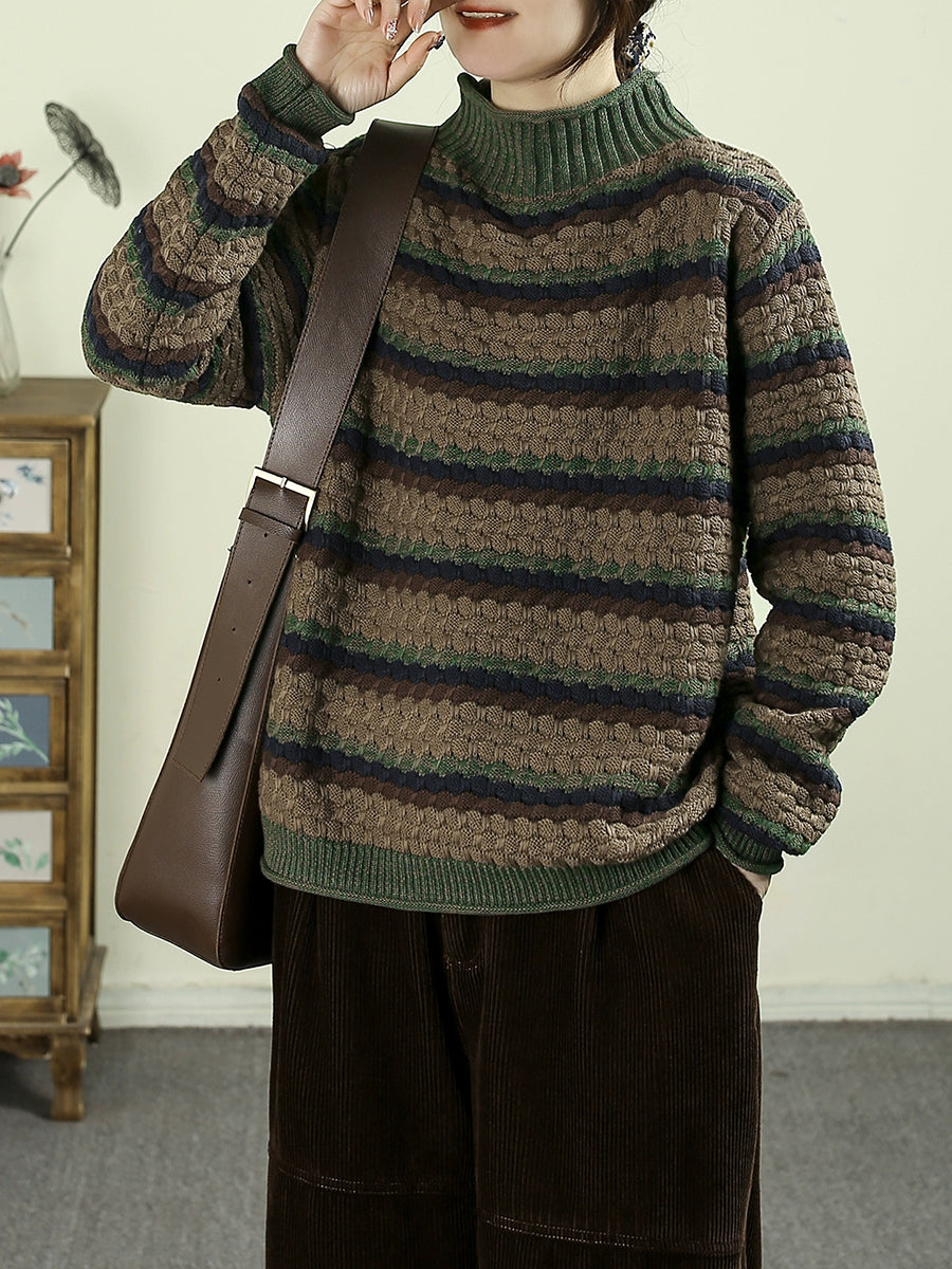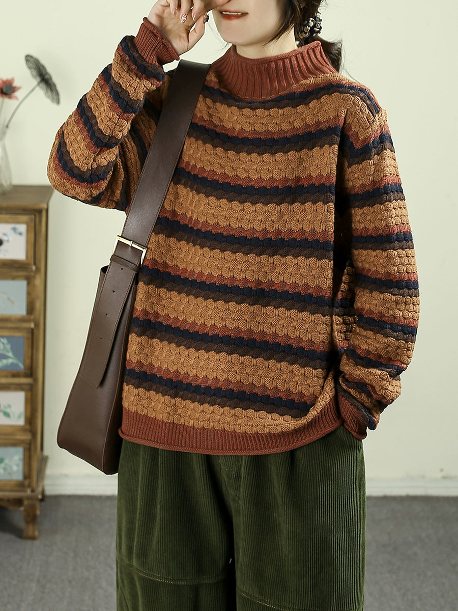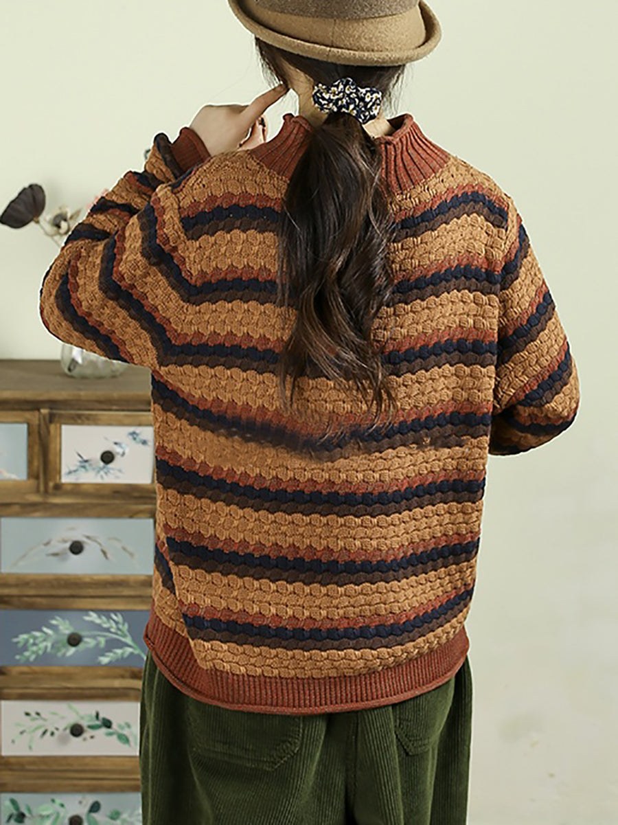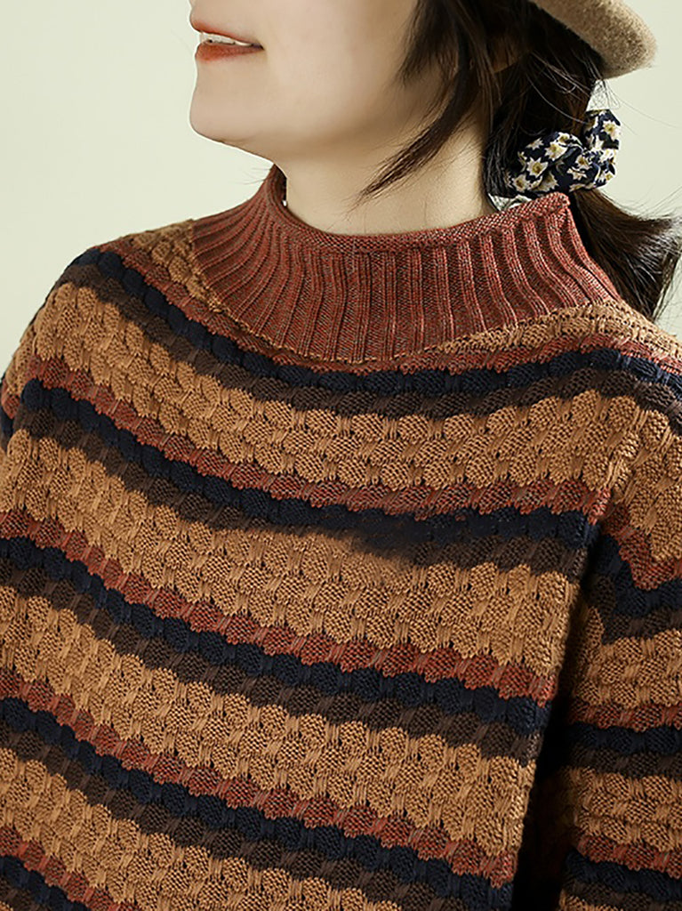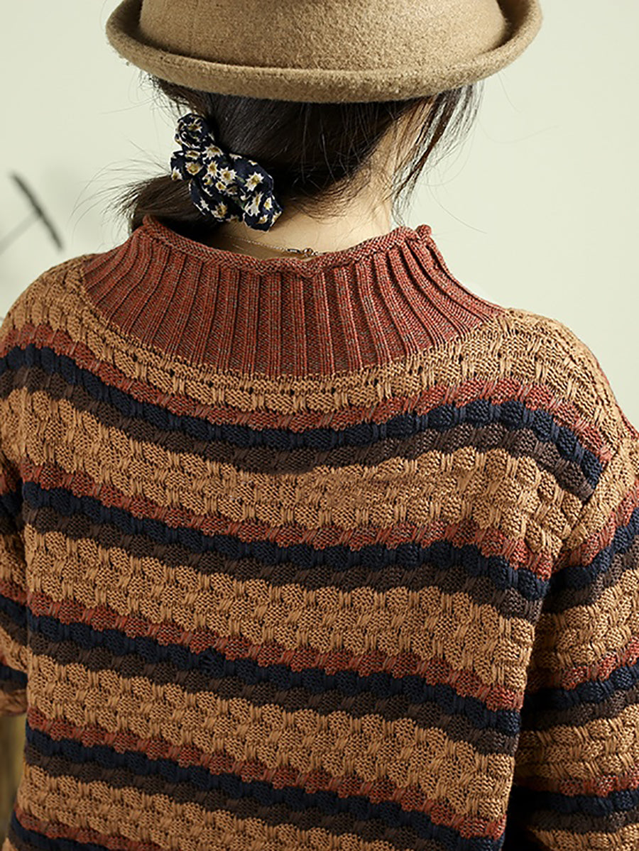 Women Autumn Artsy Stripe Knitted Half-Turtleneck Sweater