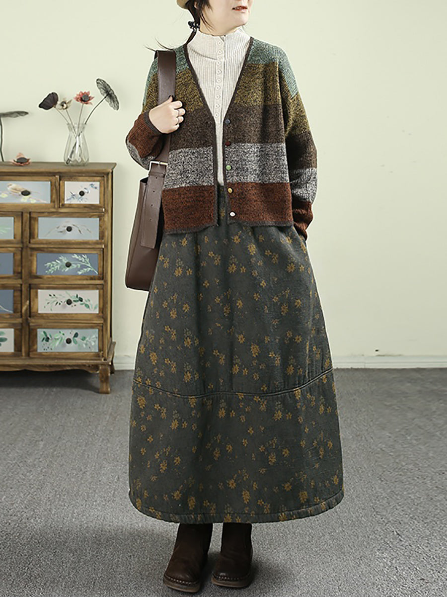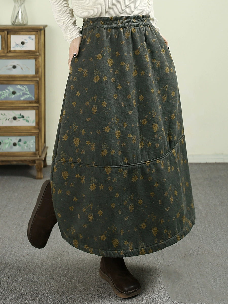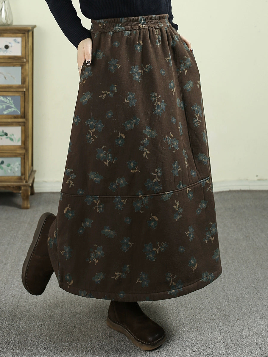 Women Winter Fleece-lined Floral 100%Cotton A-Shape Skirt