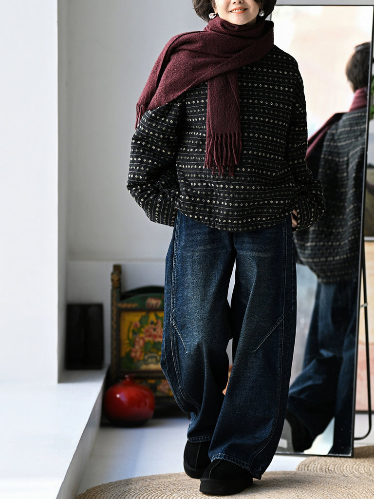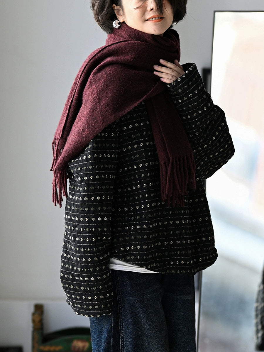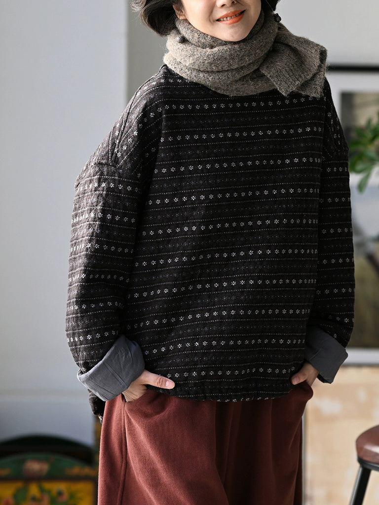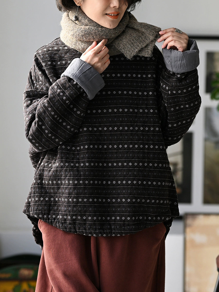 Women Winter Retro Floral Stripe O-Neck Padded Coat