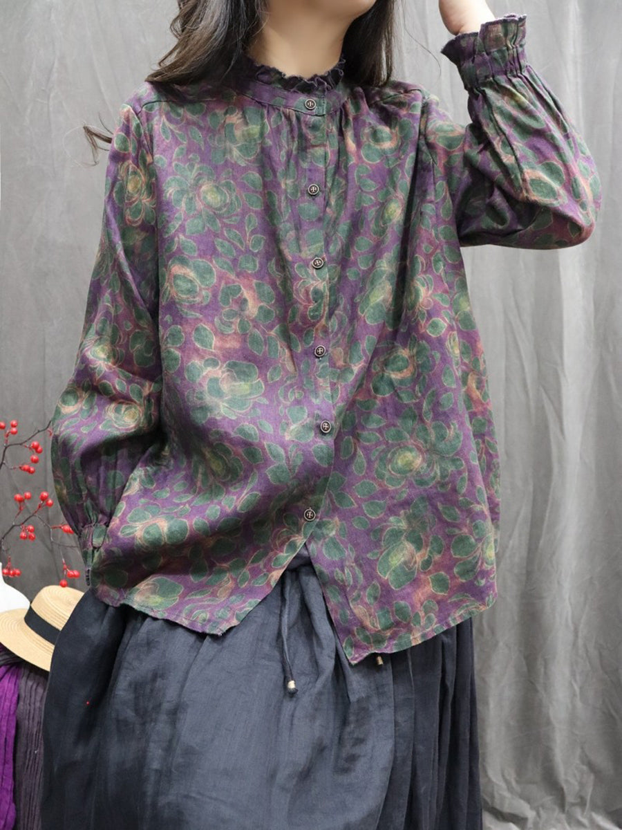Women Spring Artsy Floral Stand Collar 100%Linen Shirt