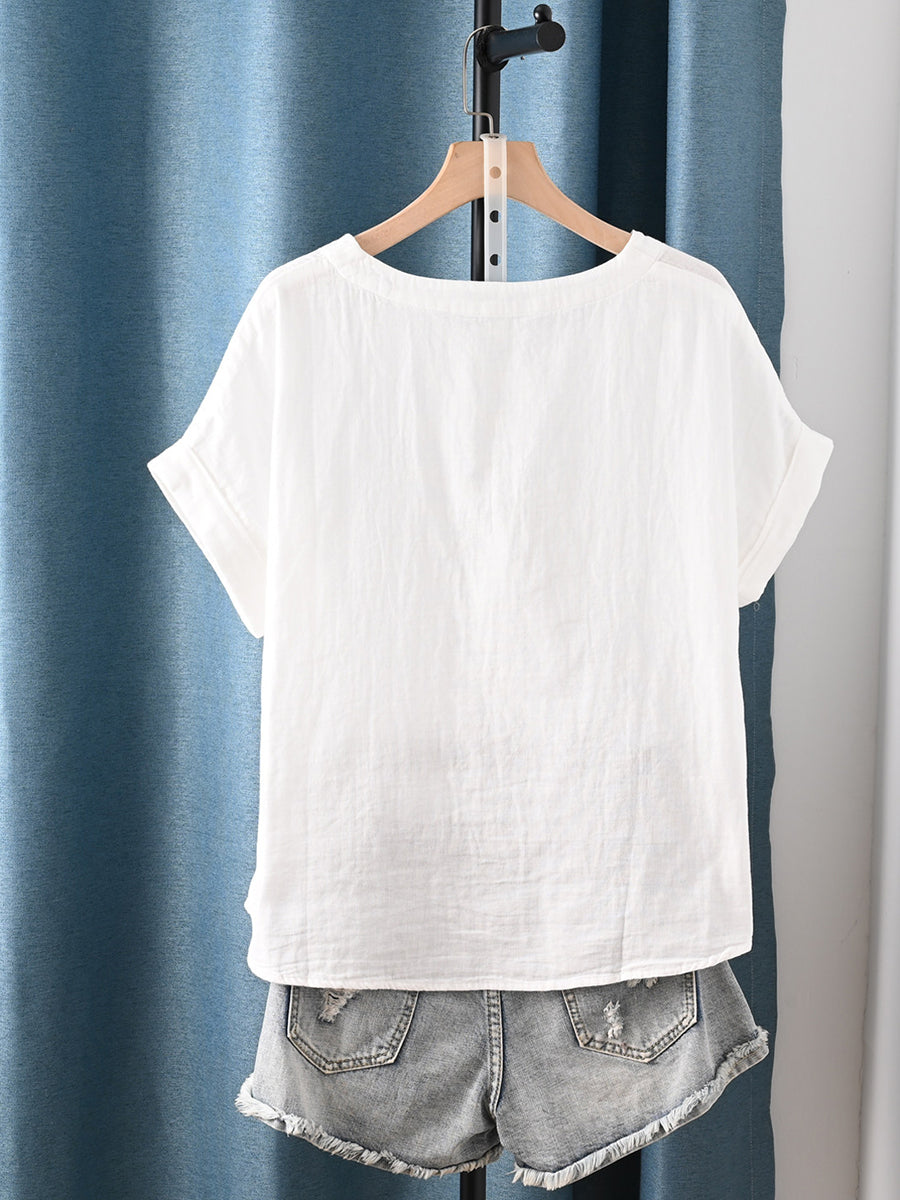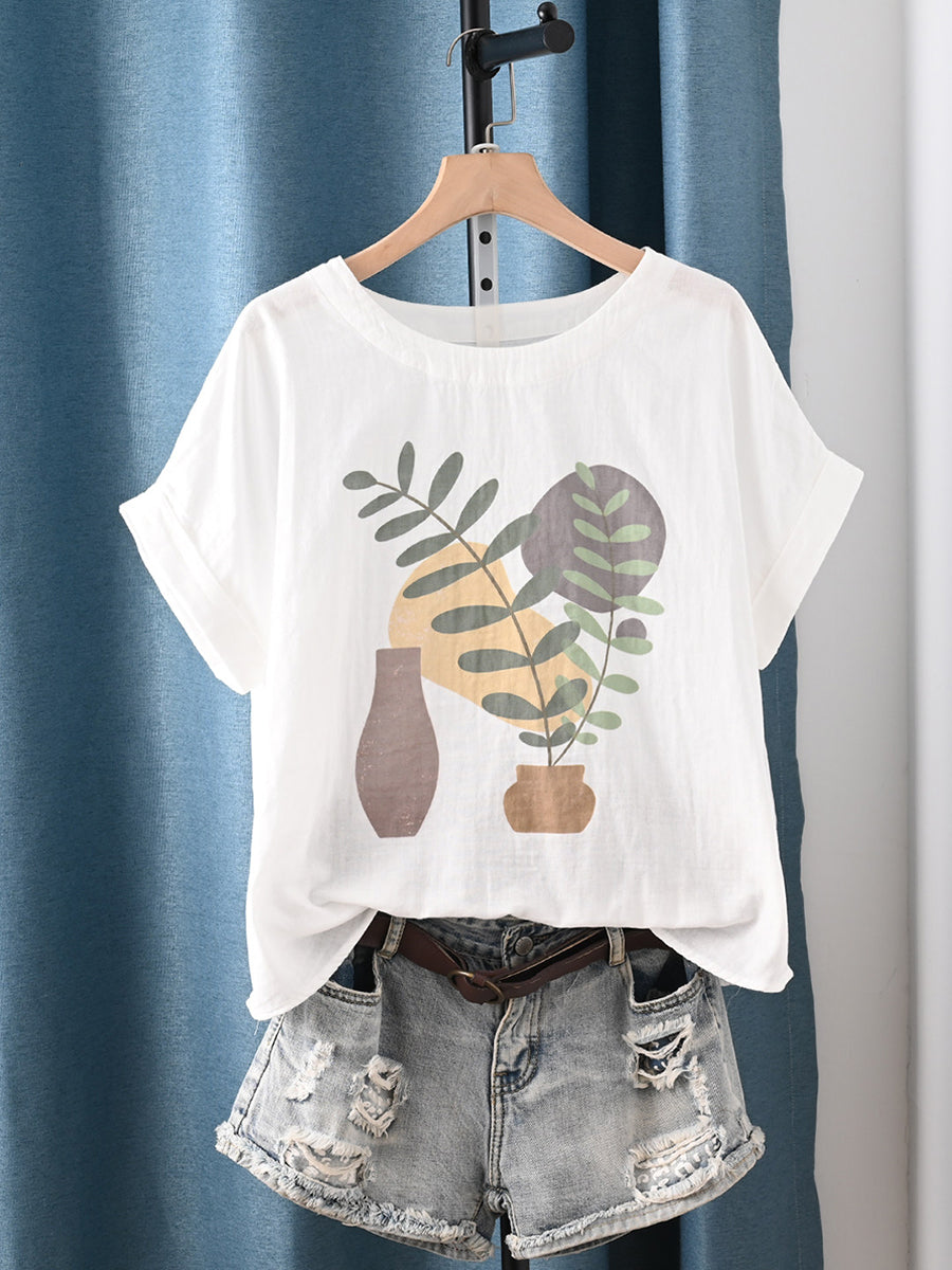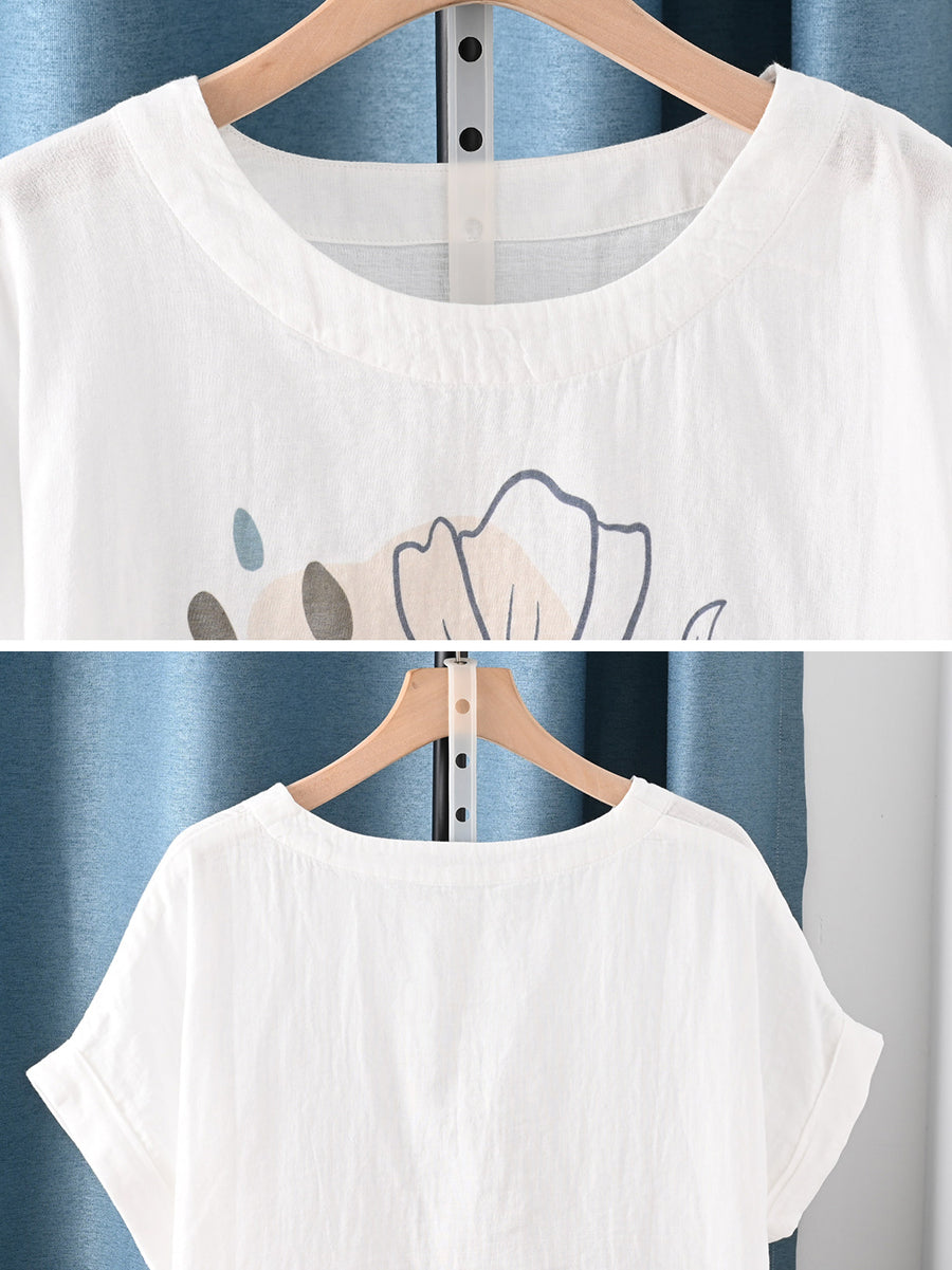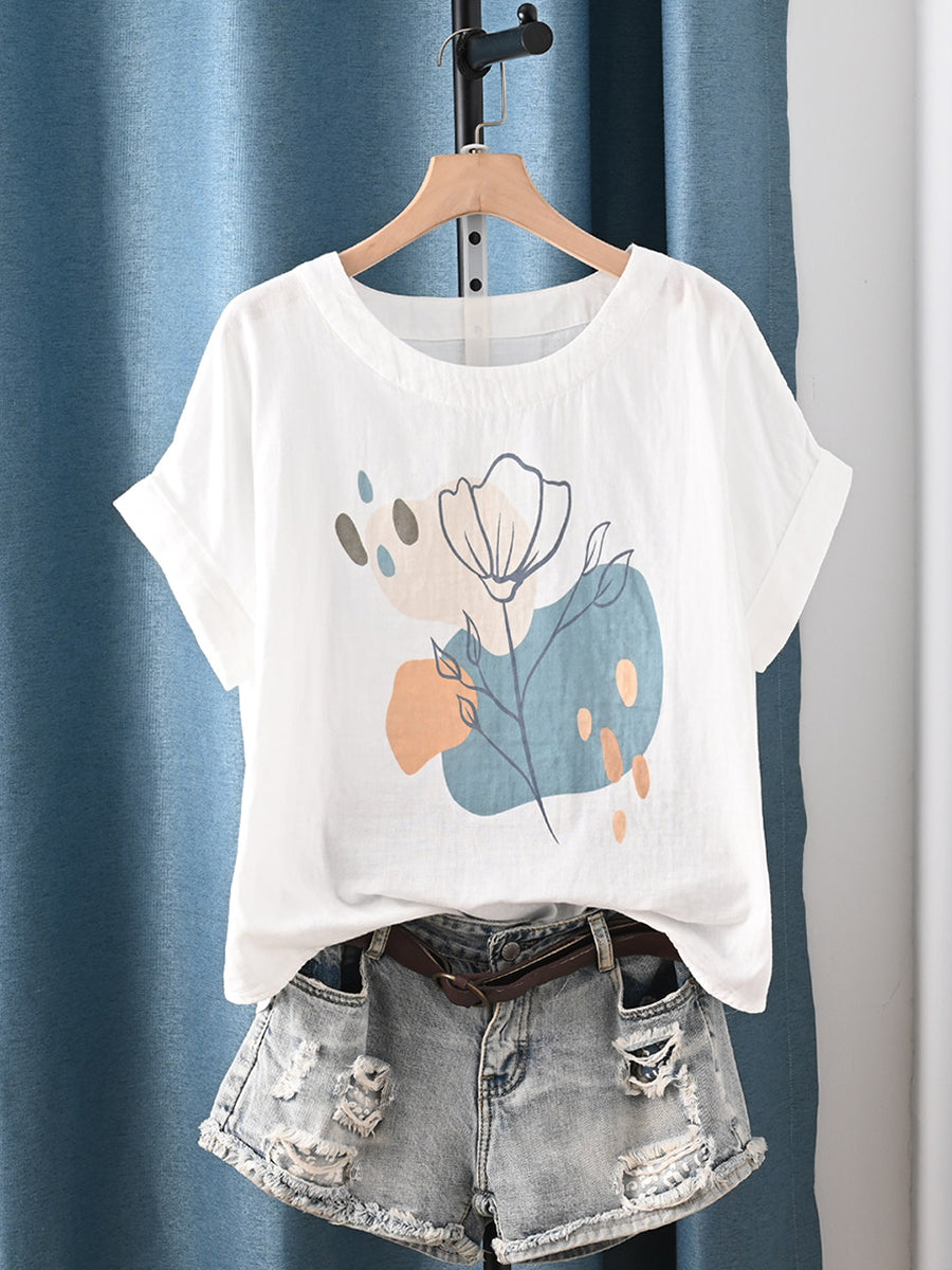 Women Summer Artsy Flower O-Neck 100%Cotton T-Shirt