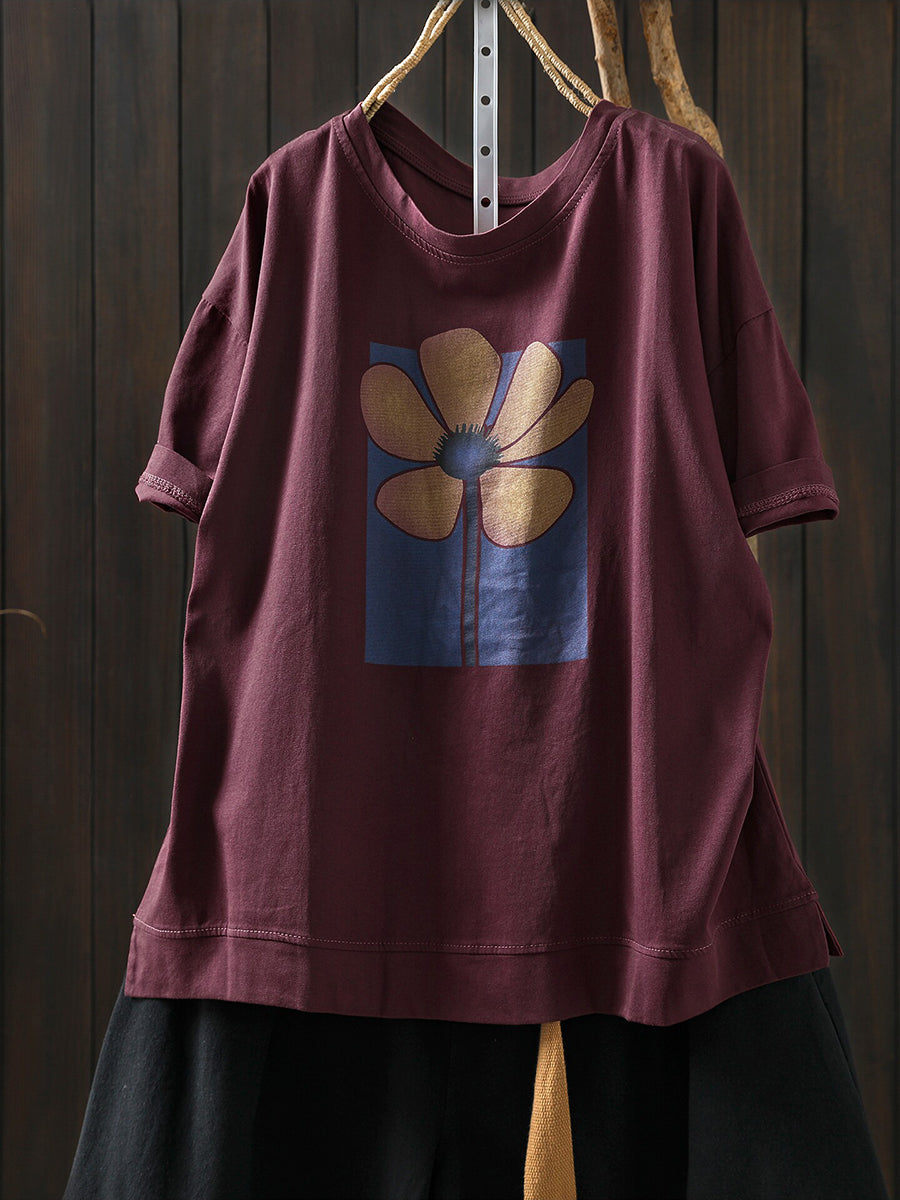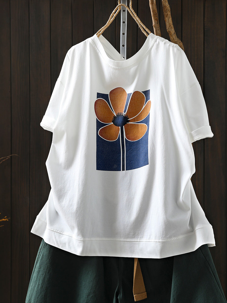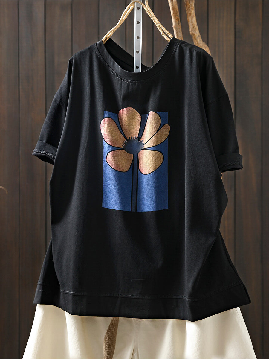 Women Summer Artsy Flower O-Neck Cotton T-Shirt