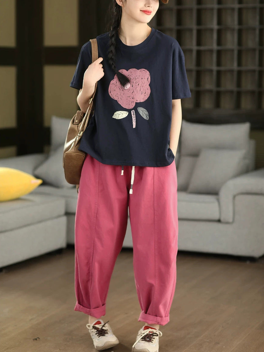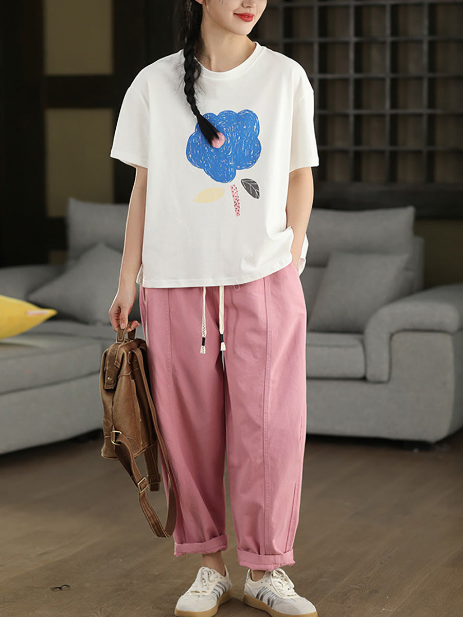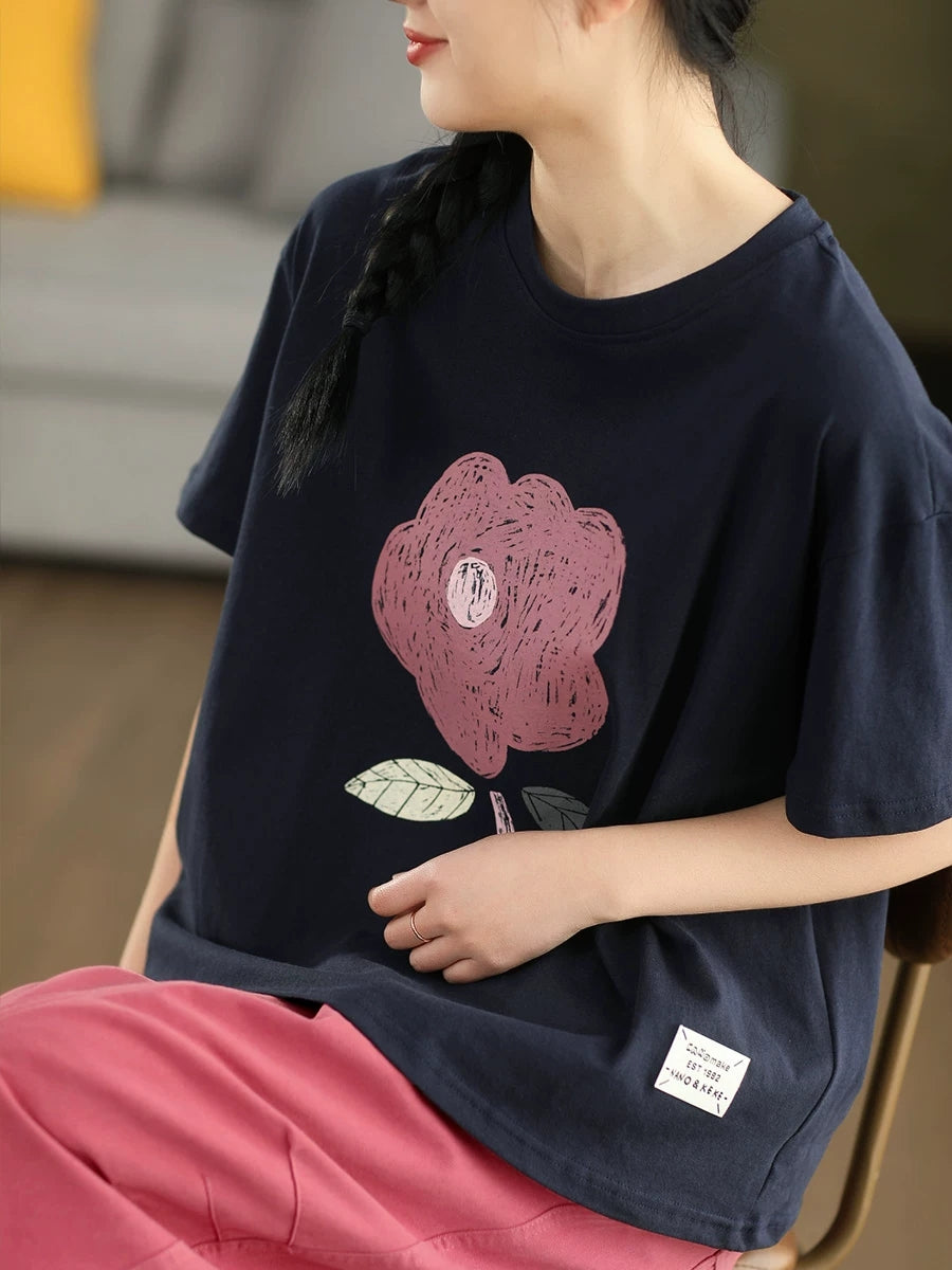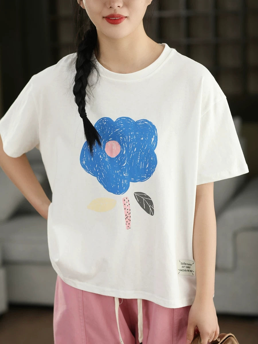 Women Summer Casual Flower O-Neck 100%Cotton T-Shirt