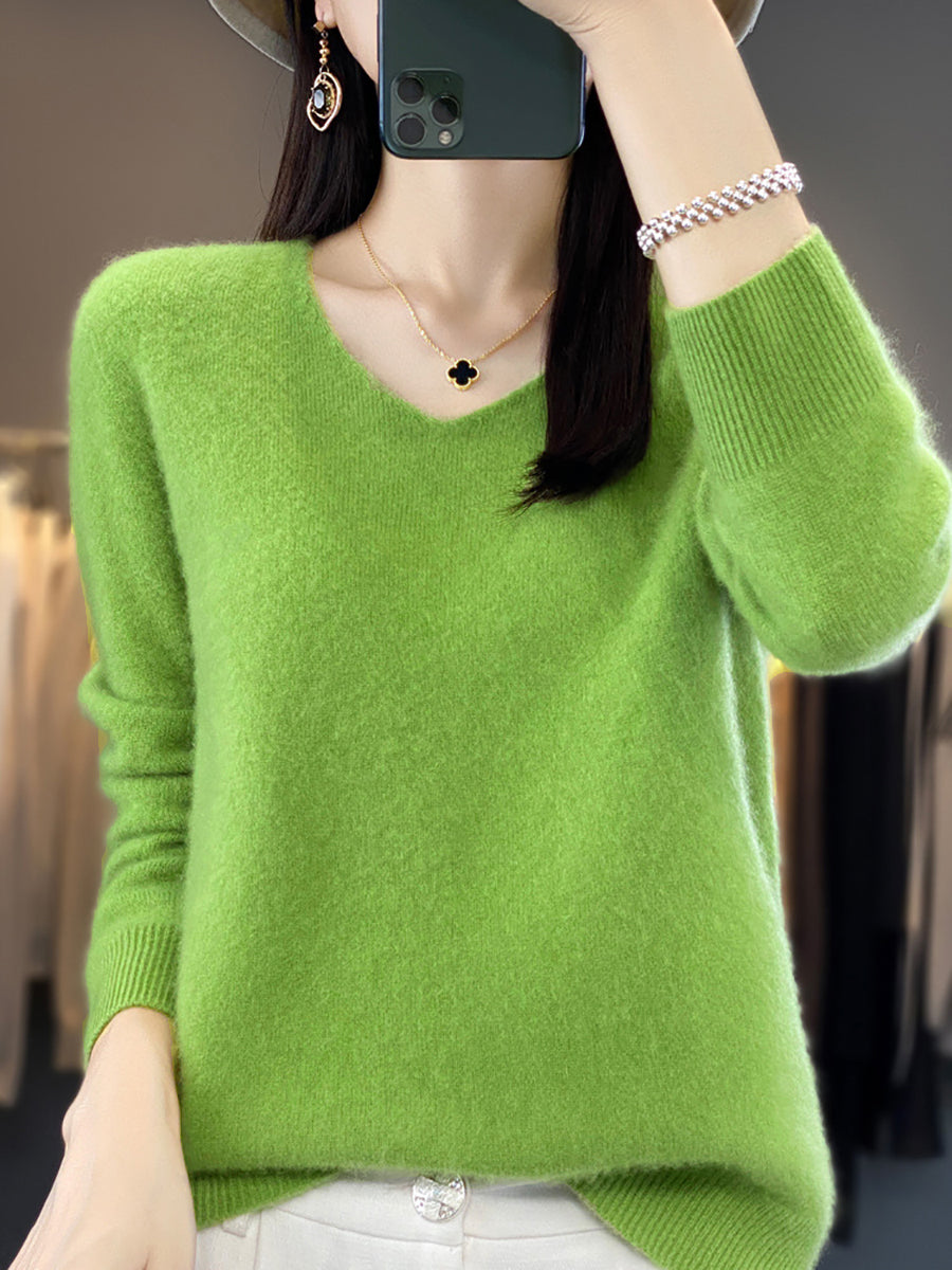 This V-Neck Knit Sweater for Women features a solid pattern, full-length sleeves, and a casual yet stylish design, making it perfect for the autumn and winter seasons.