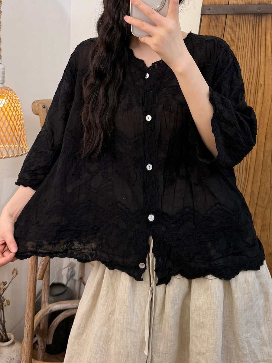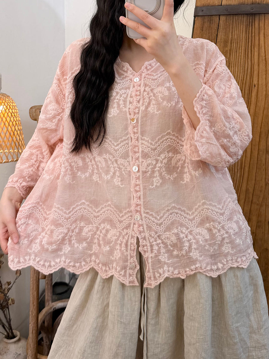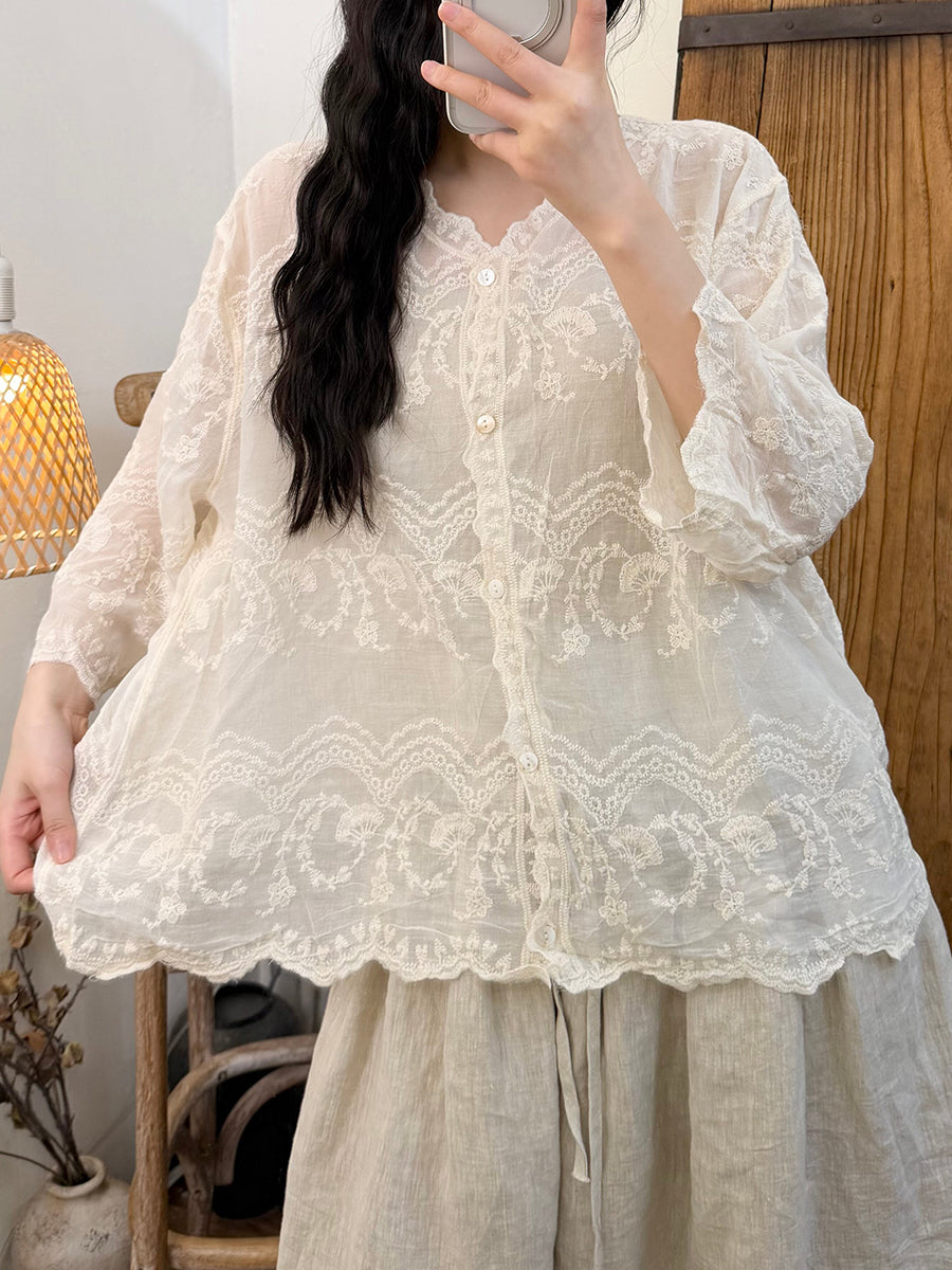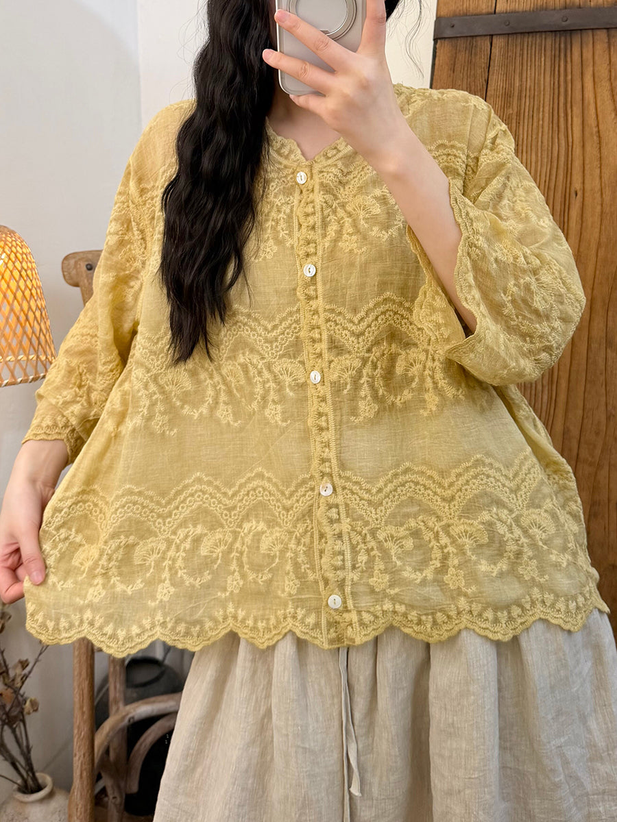 Women Summer Artsy Embroidery Cotton V-Neck Blouse