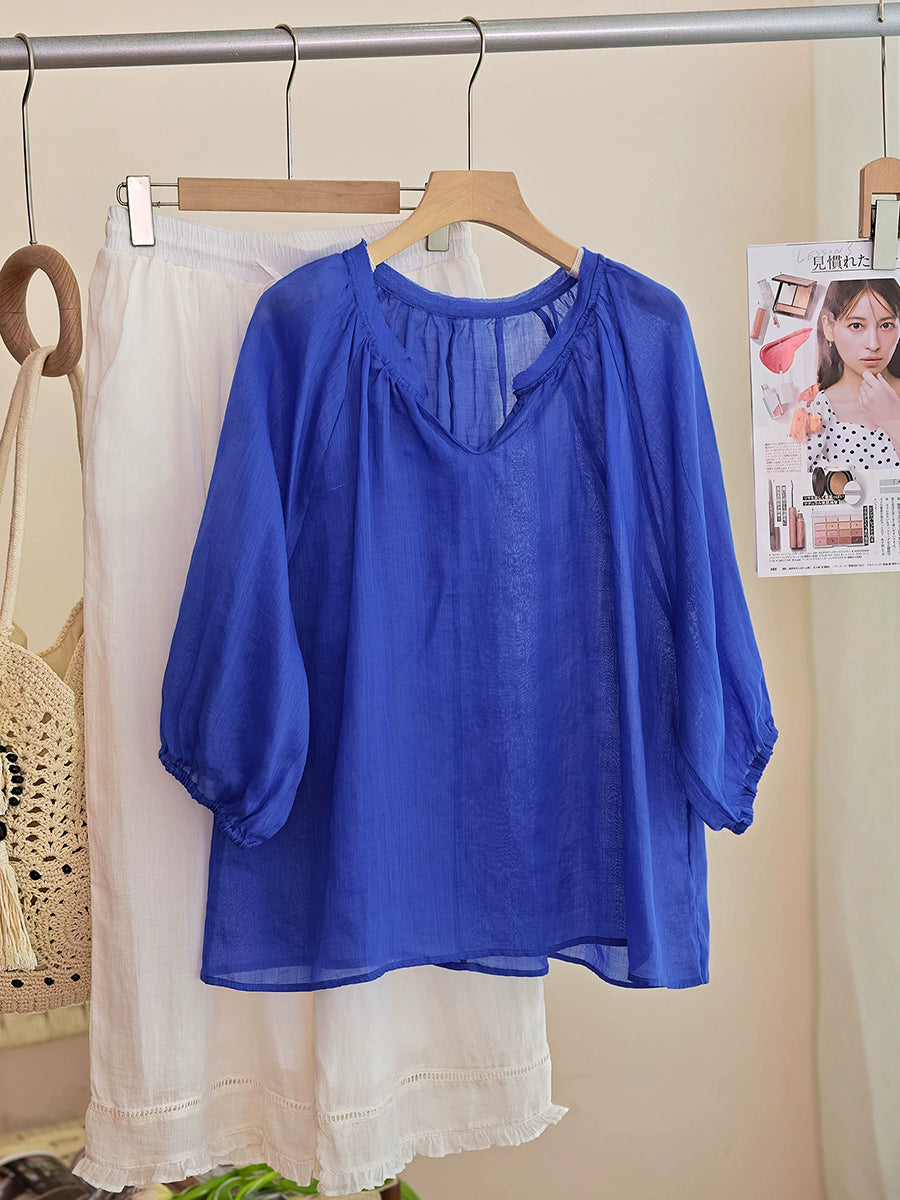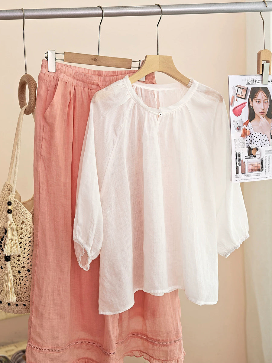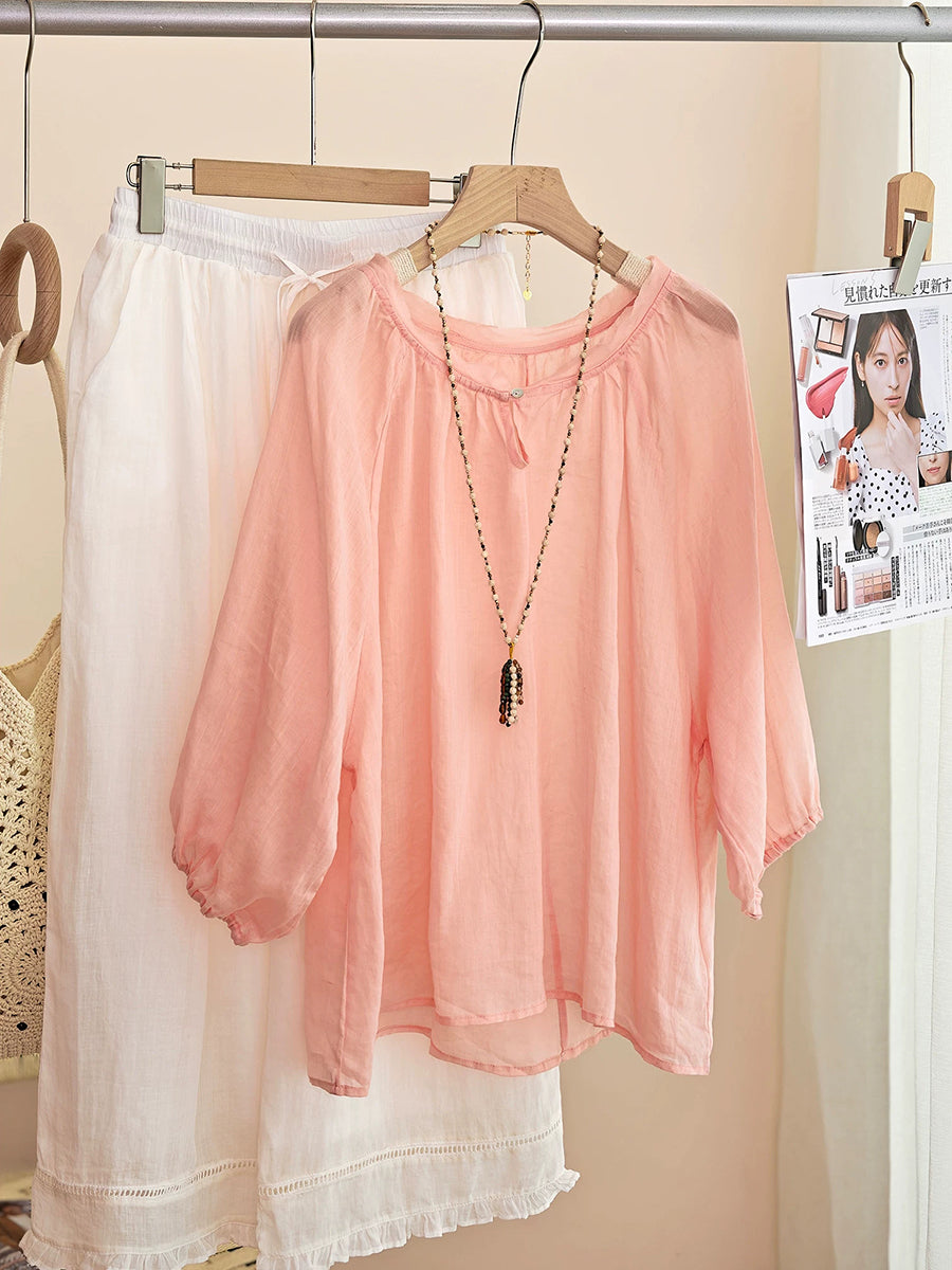 Women Summer Artsy Pure Color 100%Ramie O-Neck Blouse