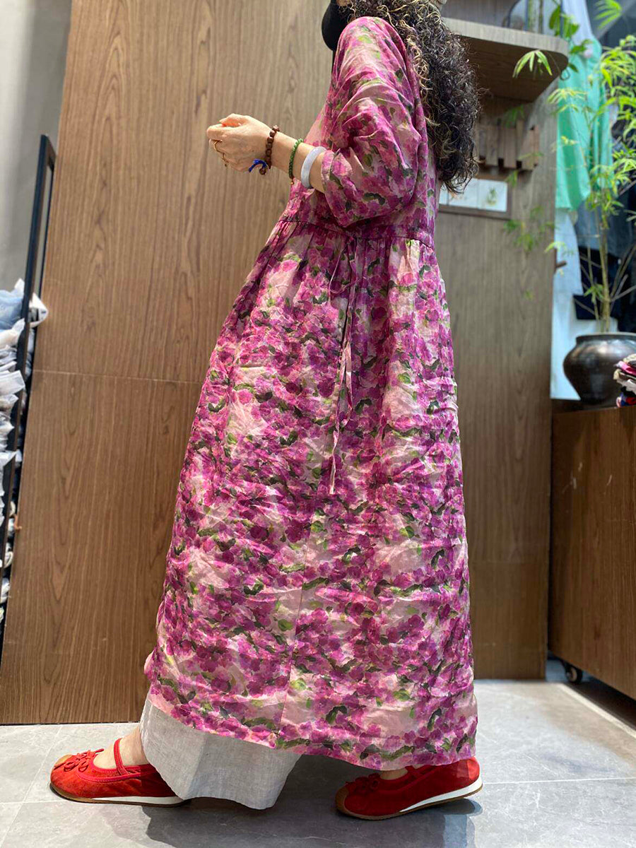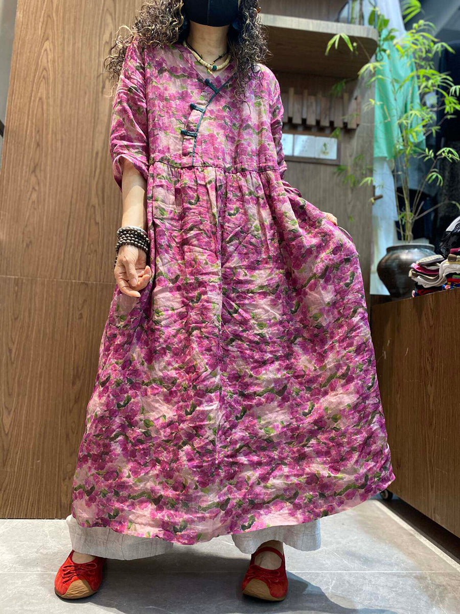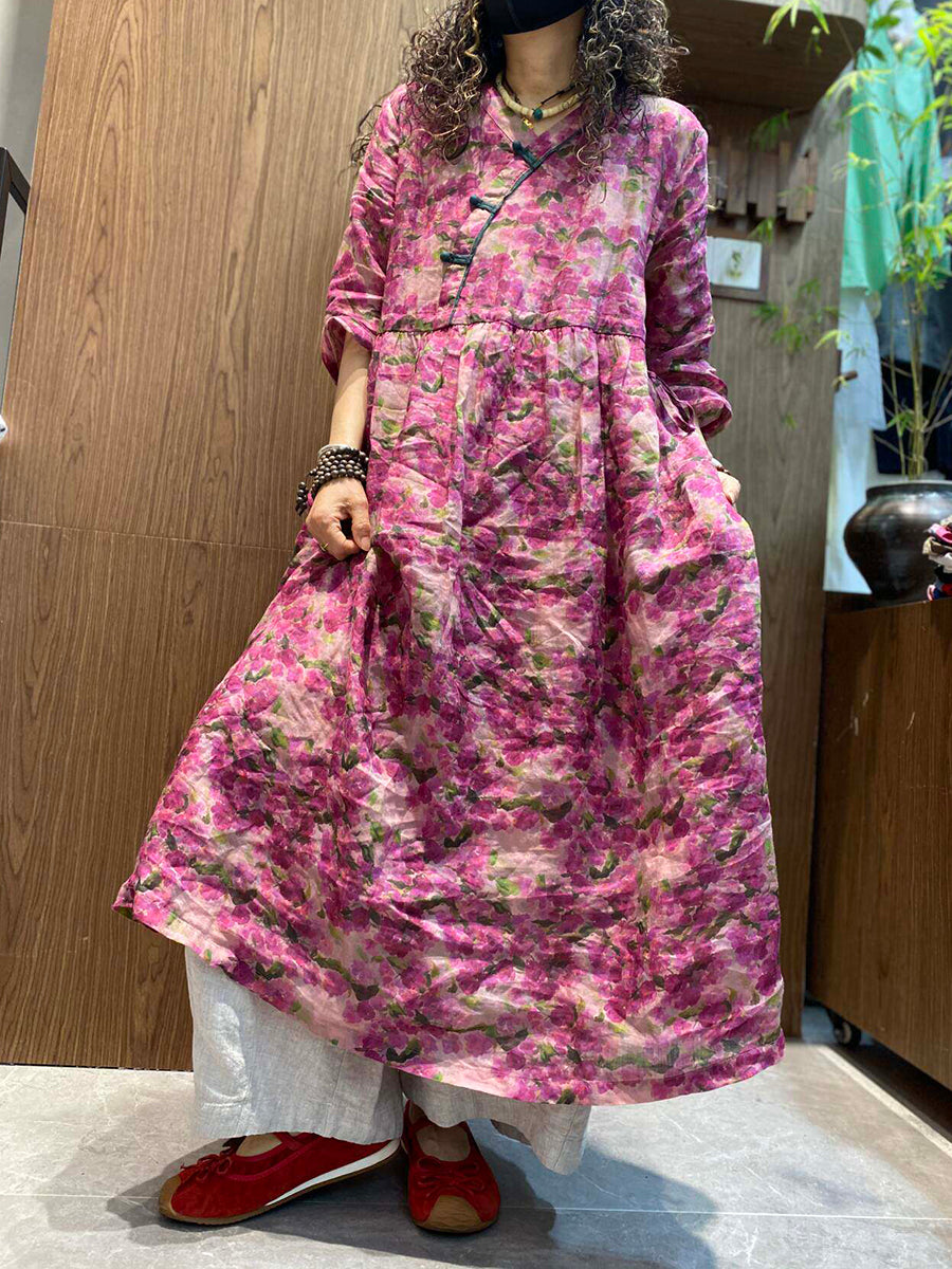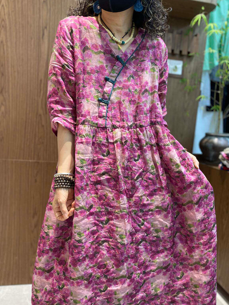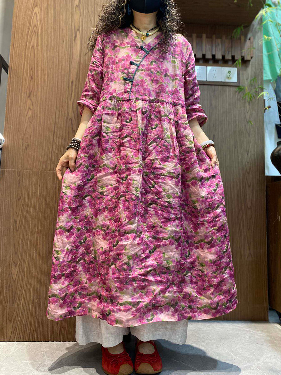 Women Summer Ethnic Flower Ramie V-Neck Dress
