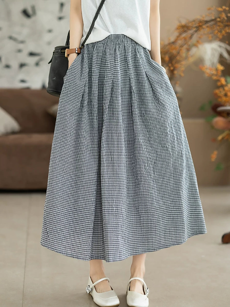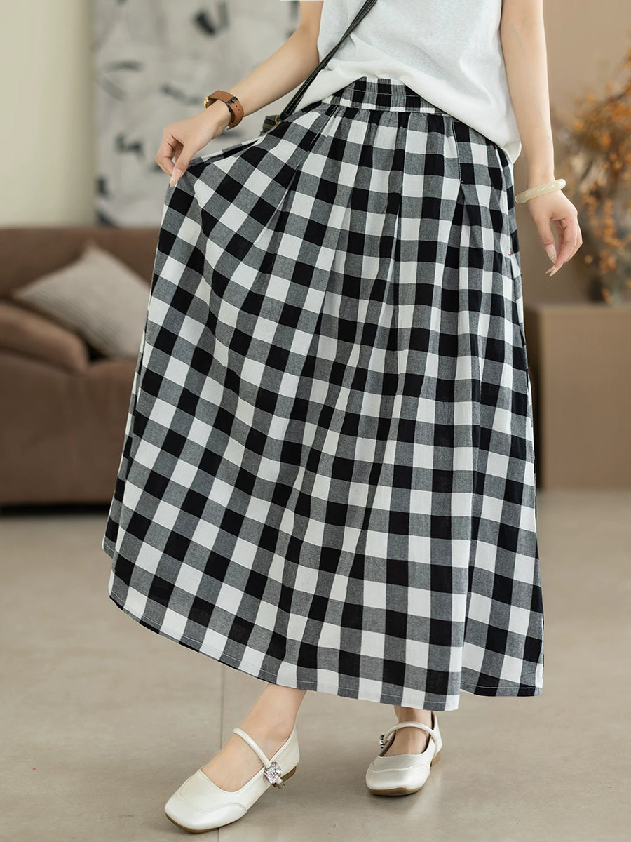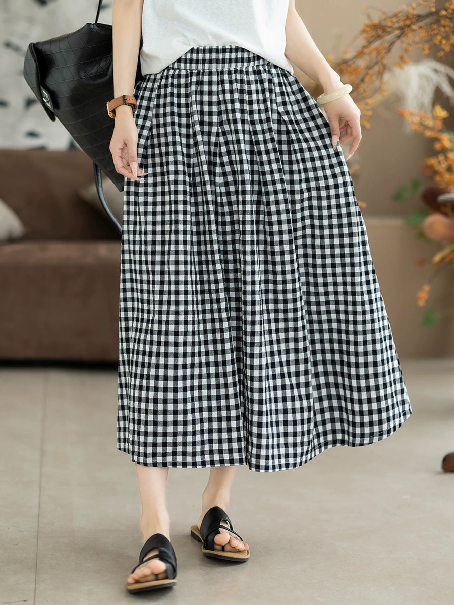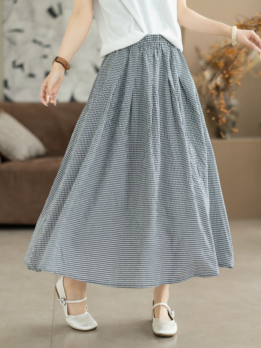 Women Summer Retro Plaid A-Shape 100%Cotton Skirt