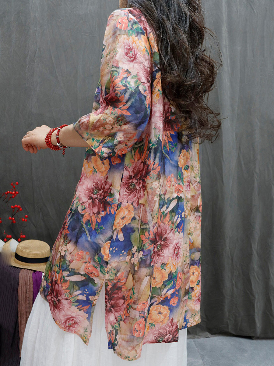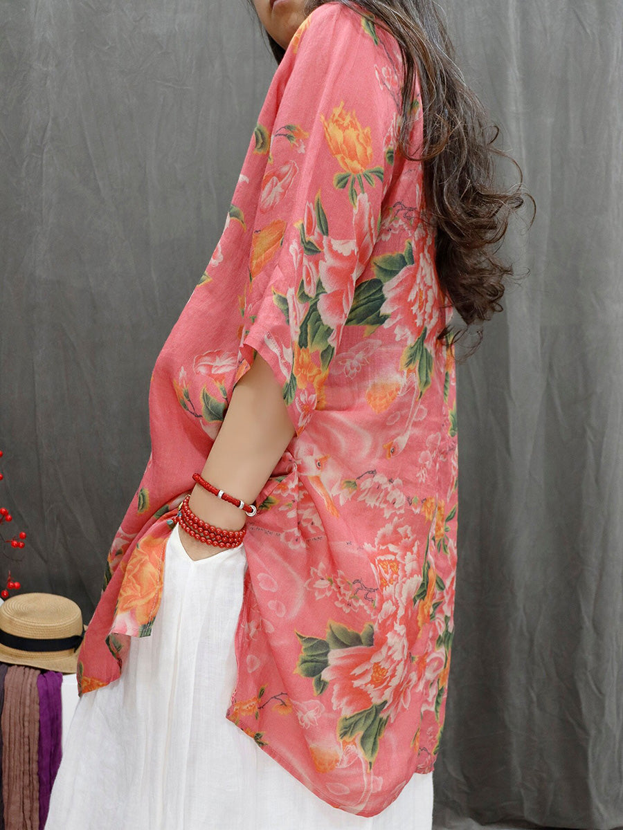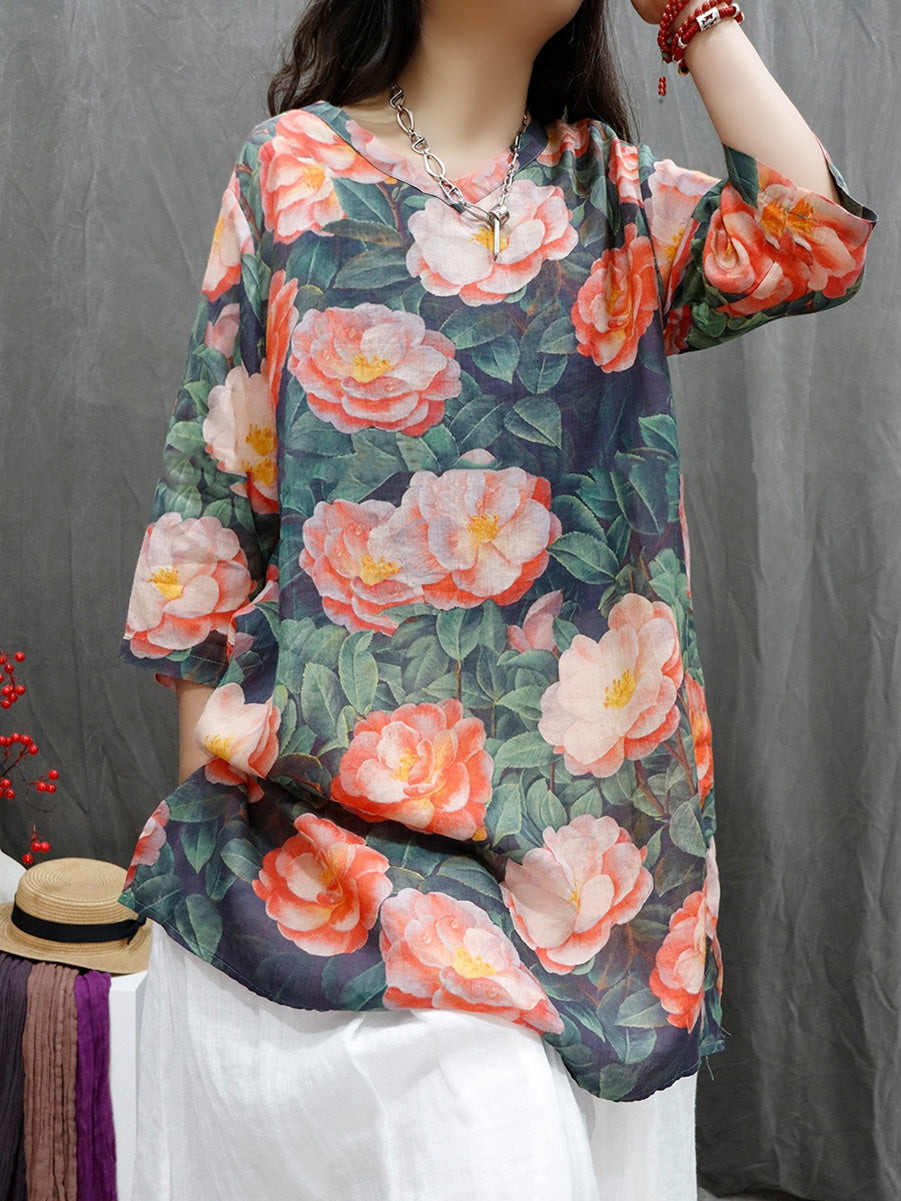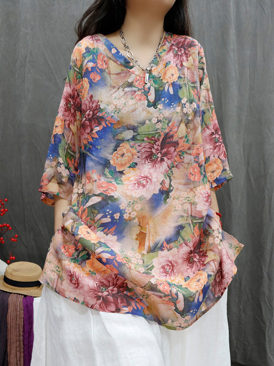 Women Summer Artsy Flower V-Neck 100%Ramie Shirt