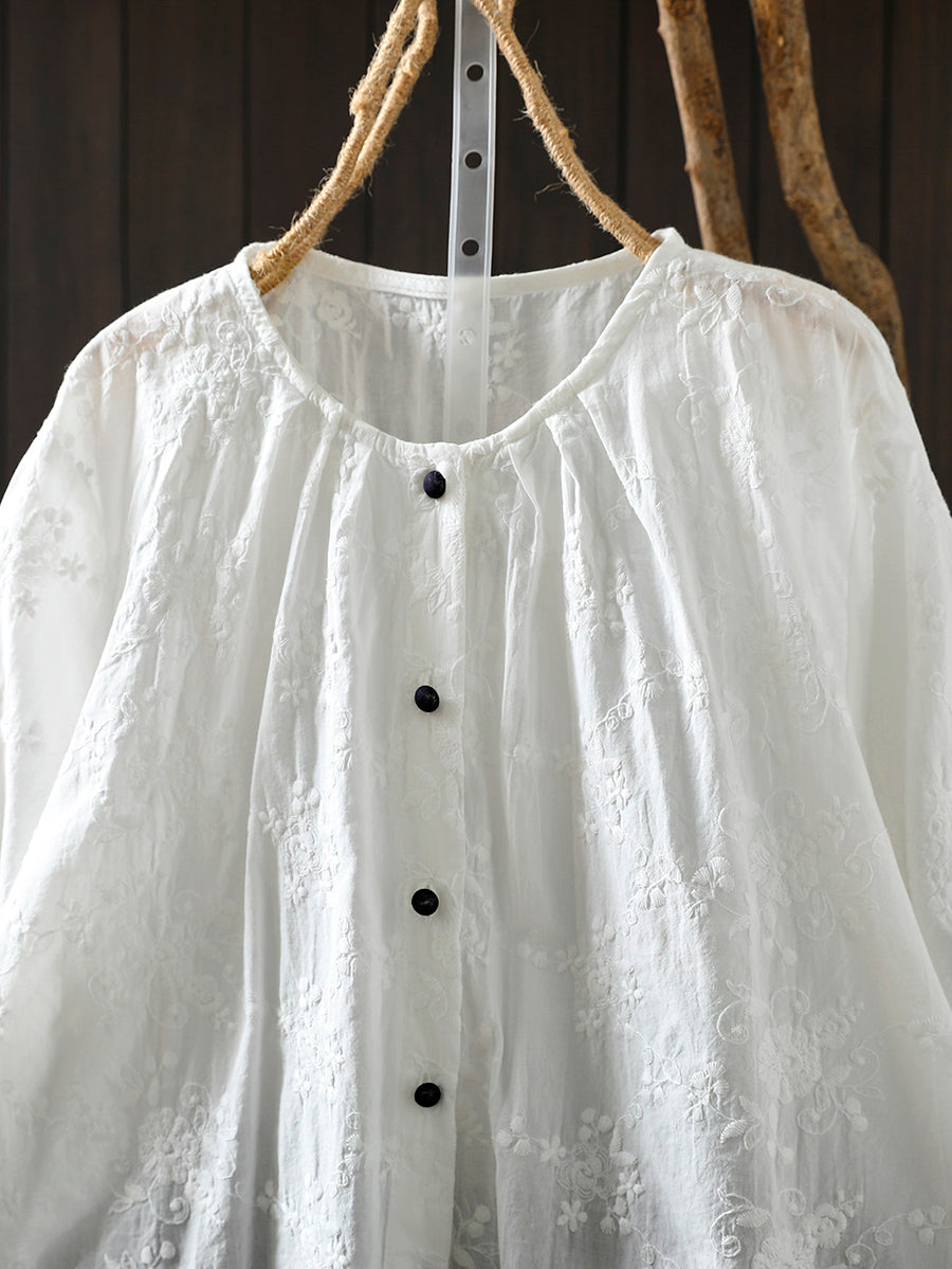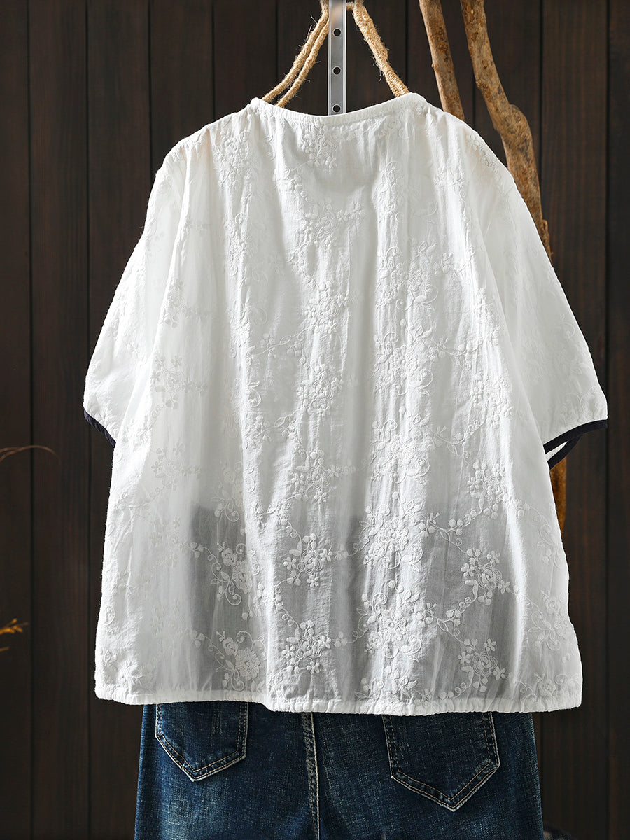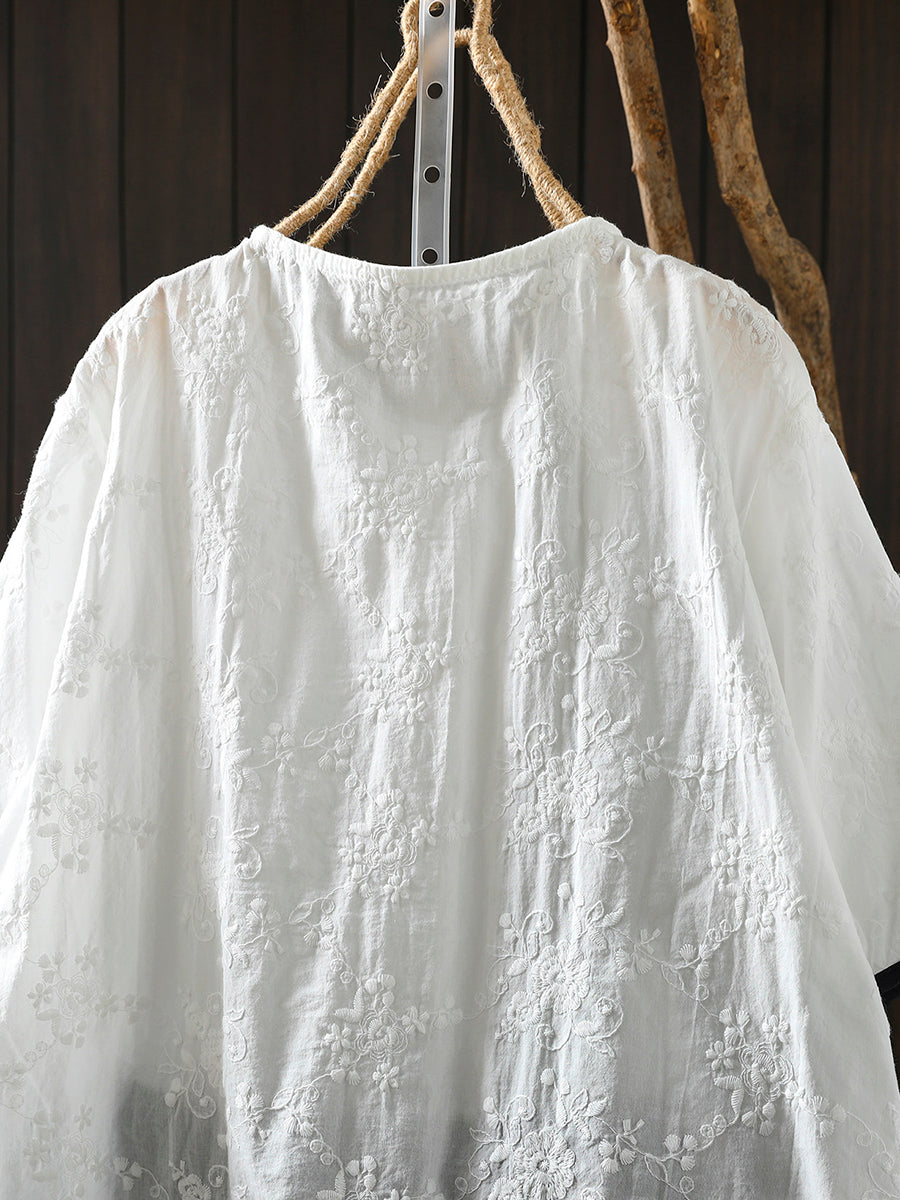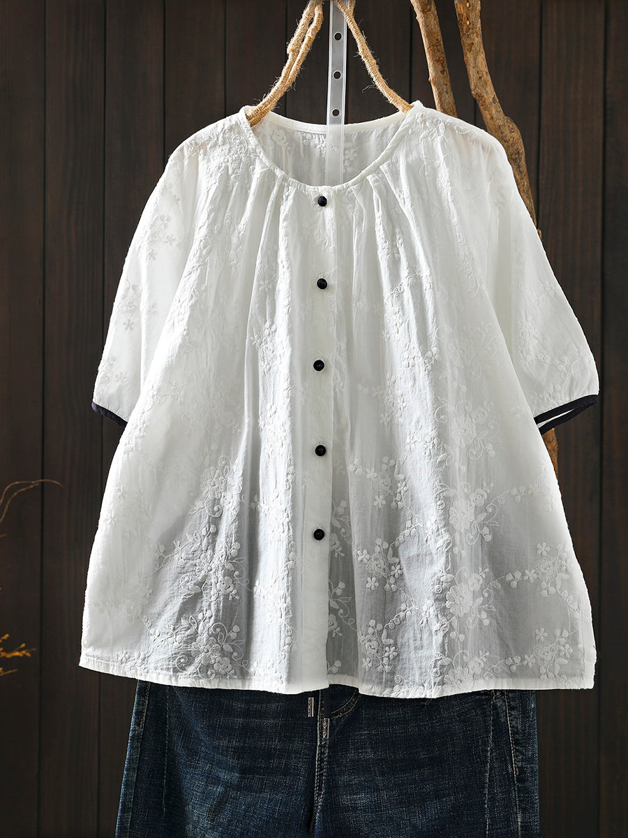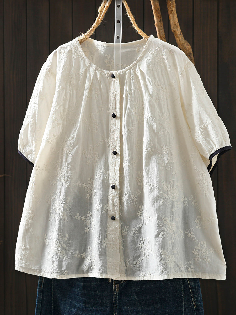 Women Summer Artsy Embroidery O-Neck 100%Cotton Blouse