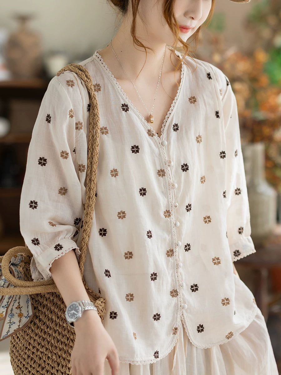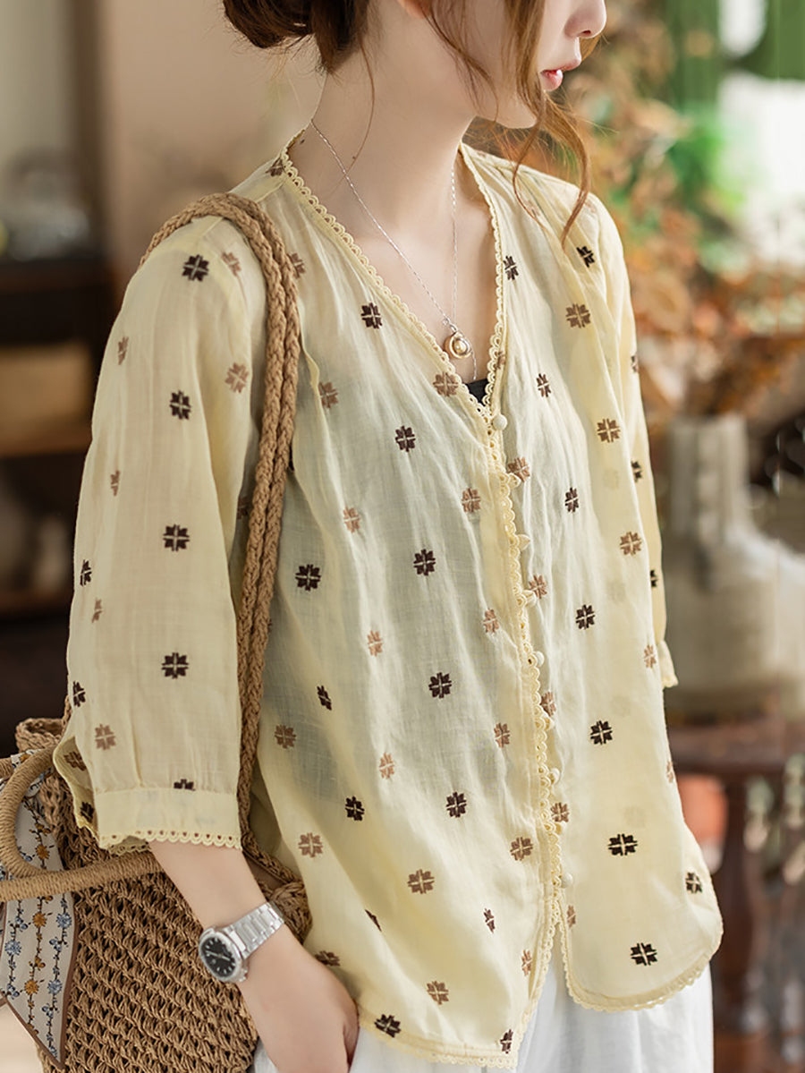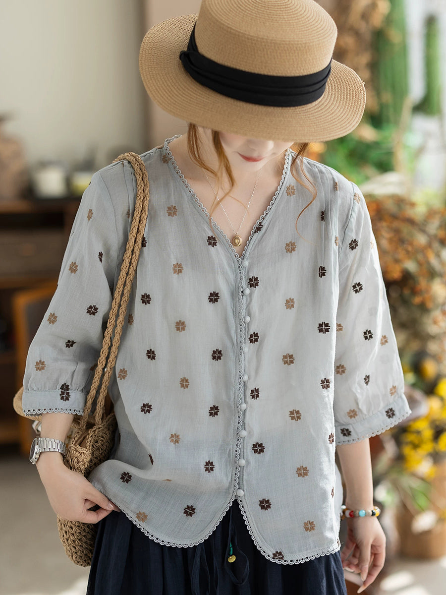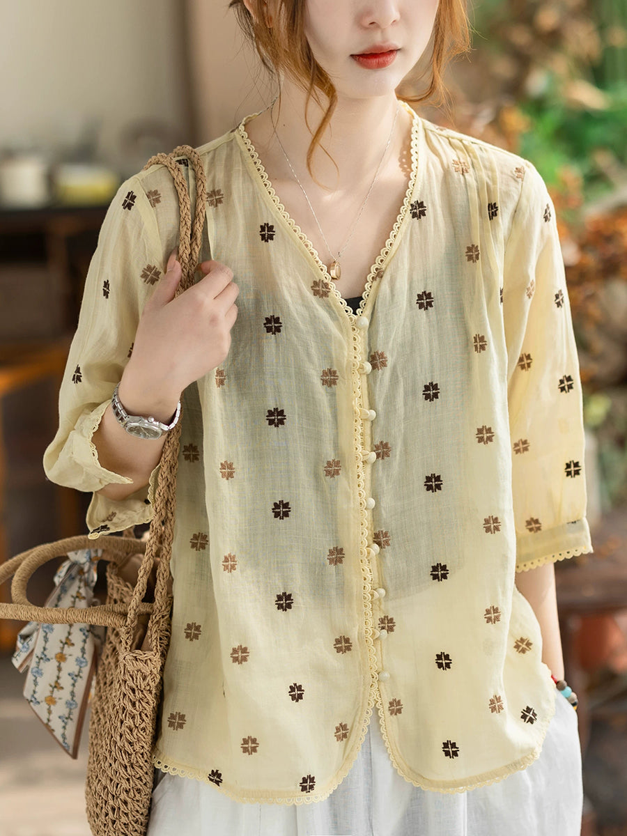 Women Summer Artsy Embroidery V-Neck 100%Ramie Shirt